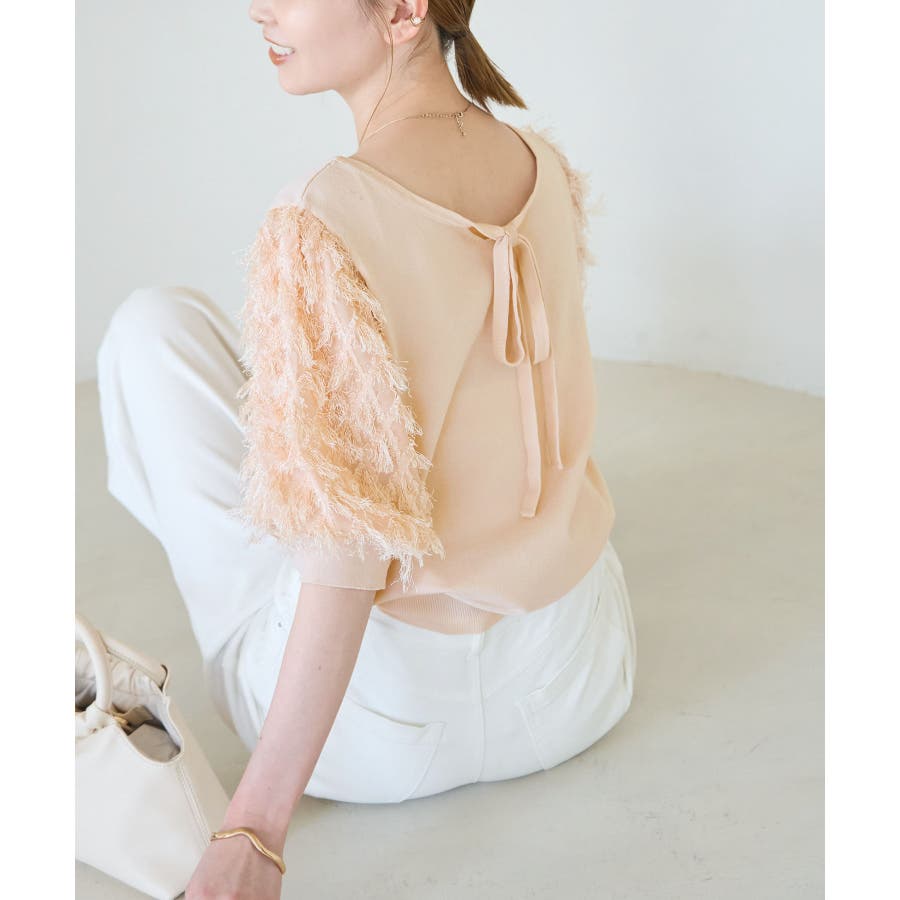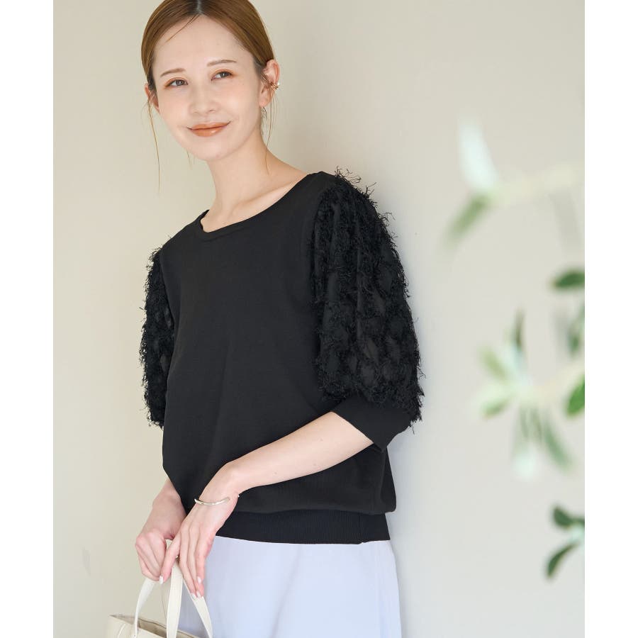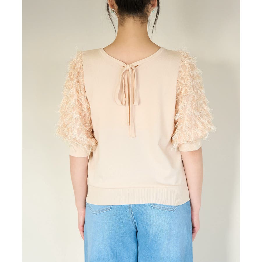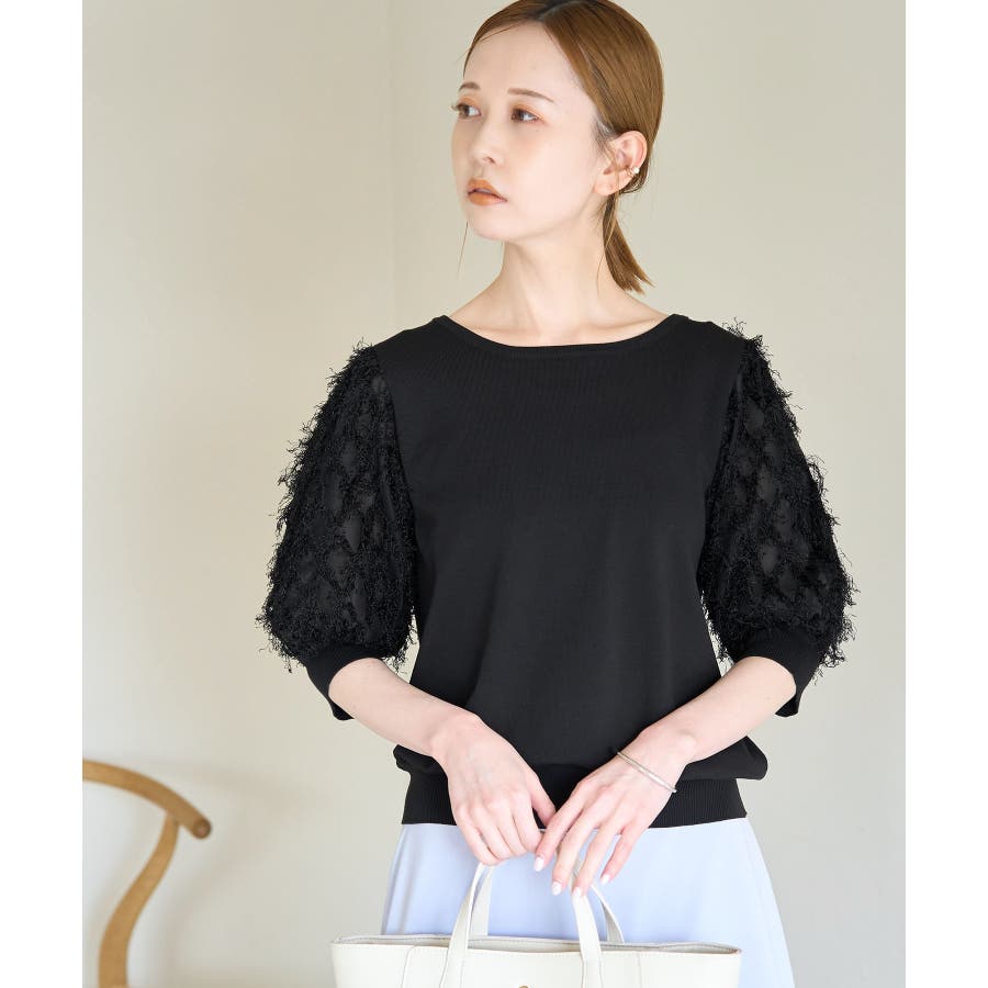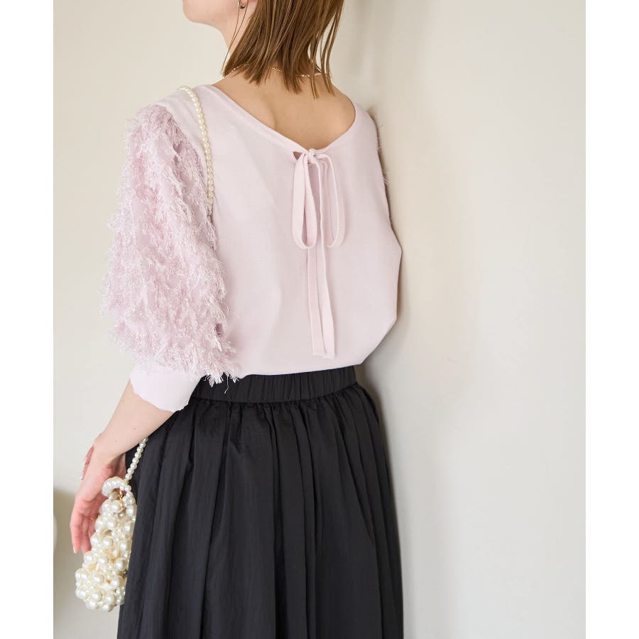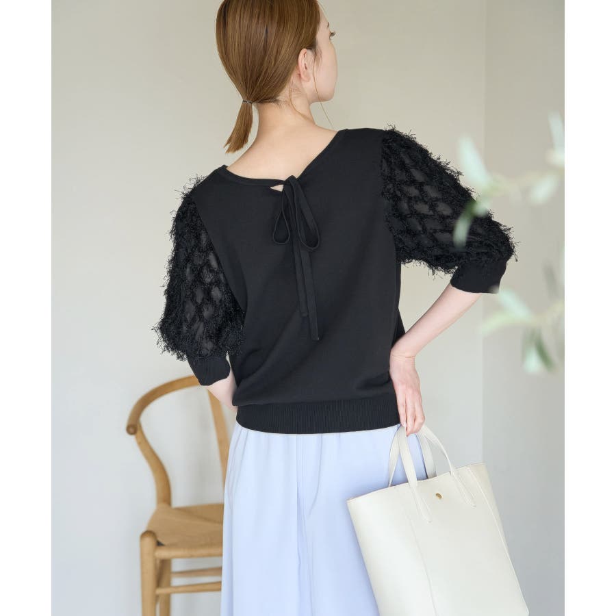 【デザイン・シルエット】 ・袖をシャギーニットで切り替えた、天竺編みのニットプルオーバー。 ・ふんわりスリーブのクラシカルな5分袖。 ・前後逆にも着られる2WAYで、繊細なリボンがポイント。 【カラー】 ・ブラック、オフホワイト、ベージュ、ピンクの4色展開。 【スタイリングポイント】 ・プリントスカートを合わせてエレガントなお出かけルックが完成。 ・オフホワイトやピンクはブルージーンズとも相性抜群。 ・裾リブですっきりとしていて、ワイドボトムも合わせやすい。 ----------------------------- 裏地:なし 透け感:なし 伸縮性:身頃はややあり 生地感・厚さ:普通 季節:春~秋 ----------------------------- ※撮影時の光、お使いのモニター環境によって色の見え方が違う場合がございます。 ※モデル身長:165cm 着用サイズ:38