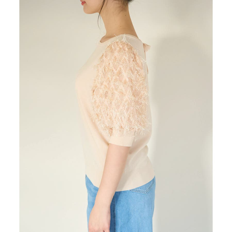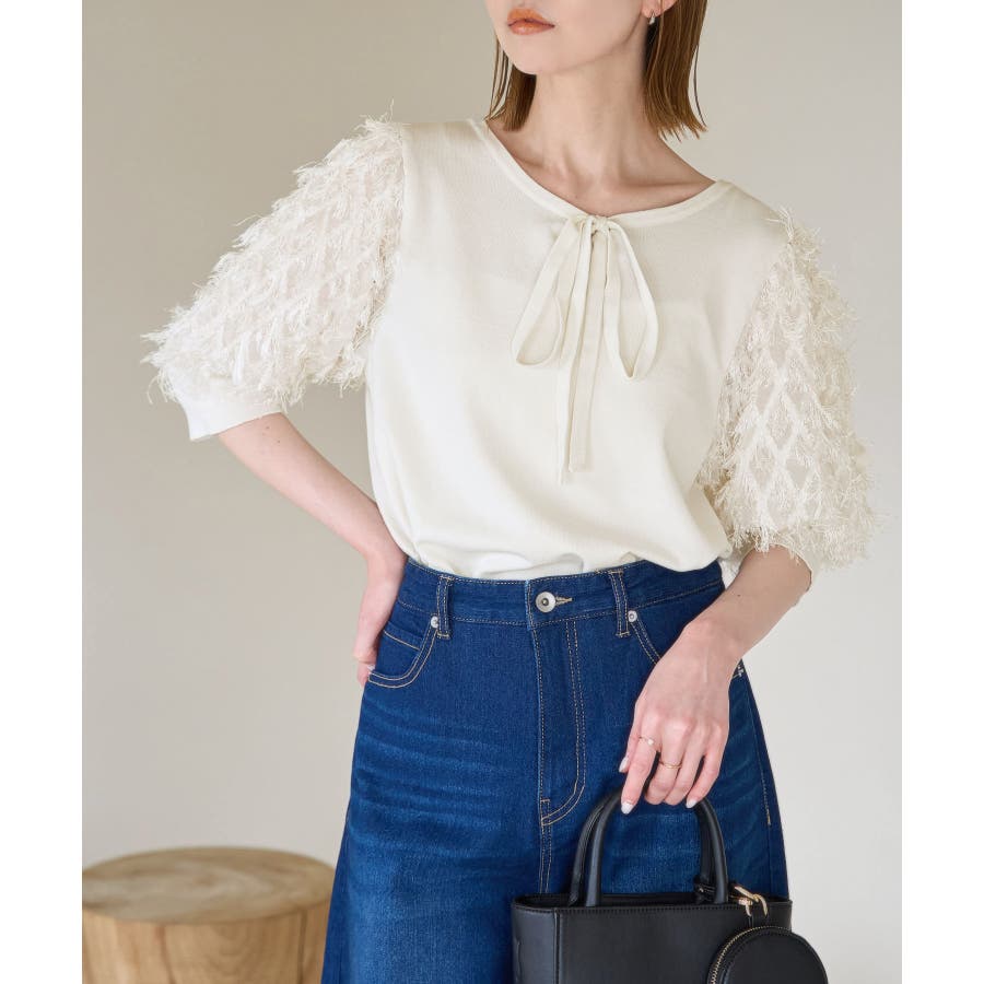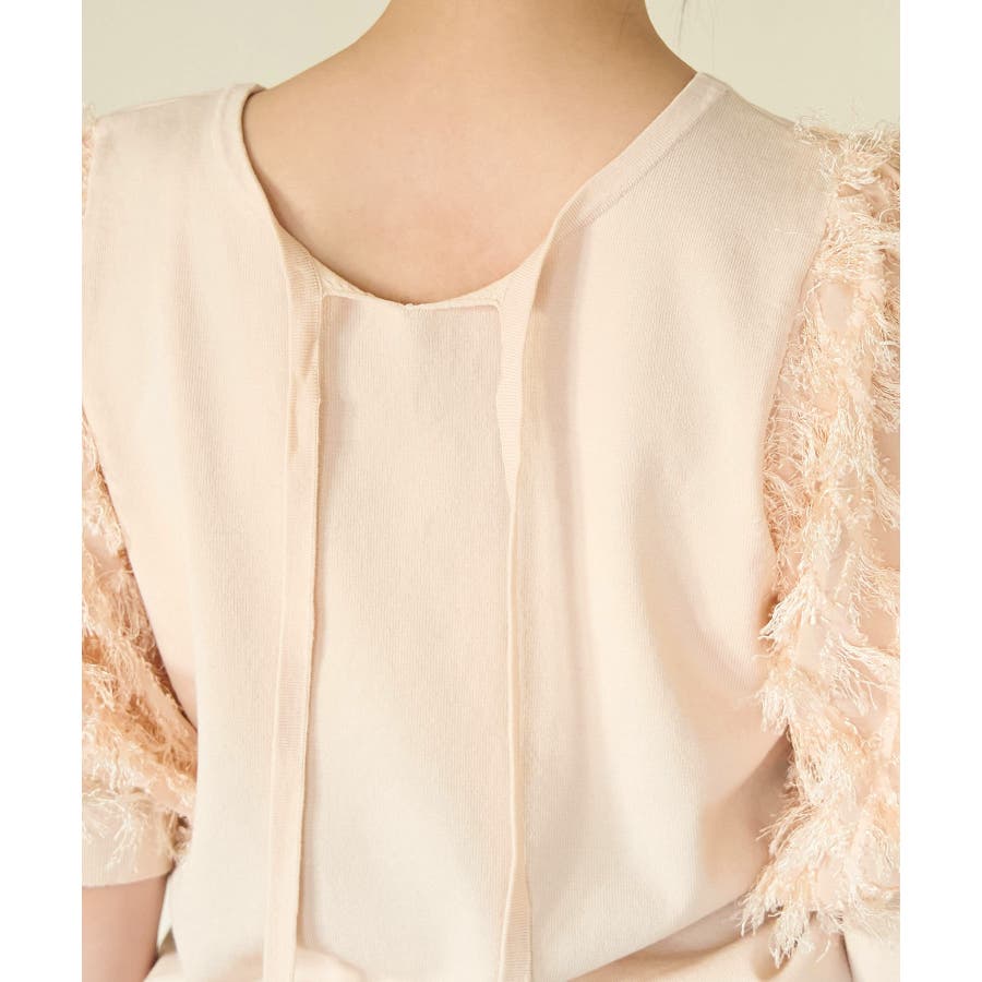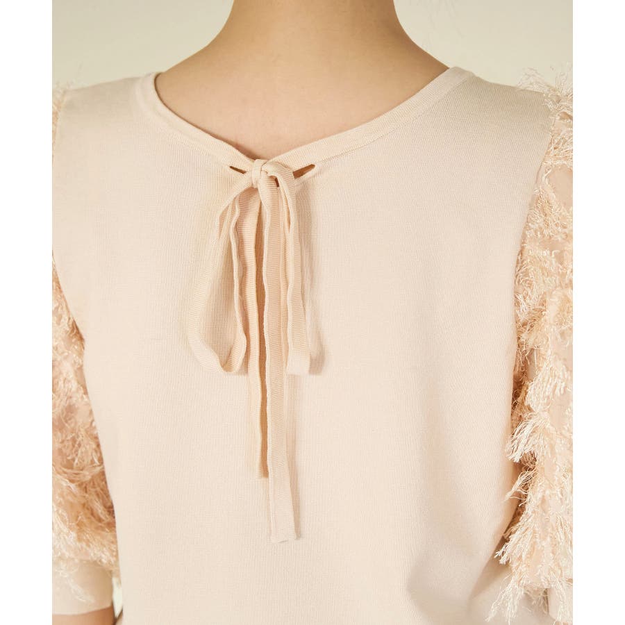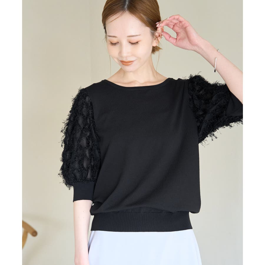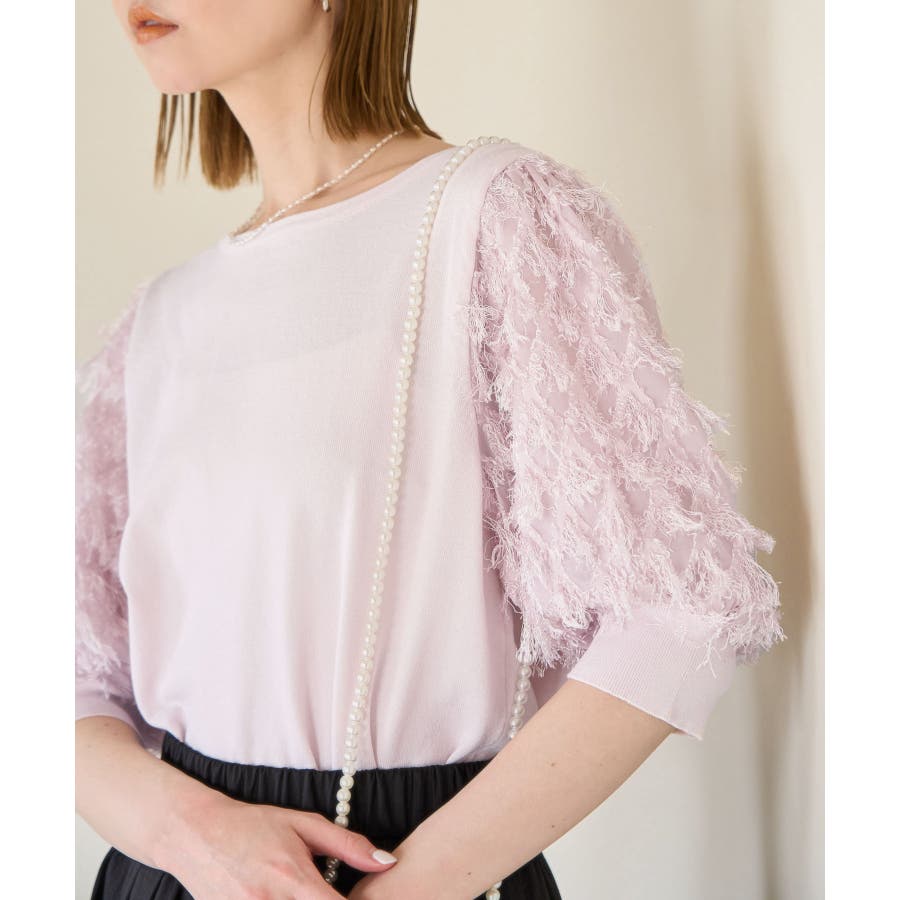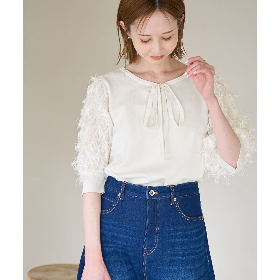 【デザイン・シルエット】 ・袖をシャギーニットで切り替えた、天竺編みのニットプルオーバー。 ・ふんわりスリーブのクラシカルな5分袖。 ・前後逆にも着られる2WAYで、繊細なリボンがポイント。 【カラー】 ・ブラック、オフホワイト、ベージュ、ピンクの4色展開。 【スタイリングポイント】 ・プリントスカートを合わせてエレガントなお出かけルックが完成。 ・オフホワイトやピンクはブルージーンズとも相性抜群。 ・裾リブですっきりとしていて、ワイドボトムも合わせやすい。 ----------------------------- 裏地:なし 透け感:なし 伸縮性:身頃はややあり 生地感・厚さ:普通 季節:春~秋 ----------------------------- ※撮影時の光、お使いのモニター環境によって色の見え方が違う場合がございます。 ※モデル身長:165cm 着用サイズ:38