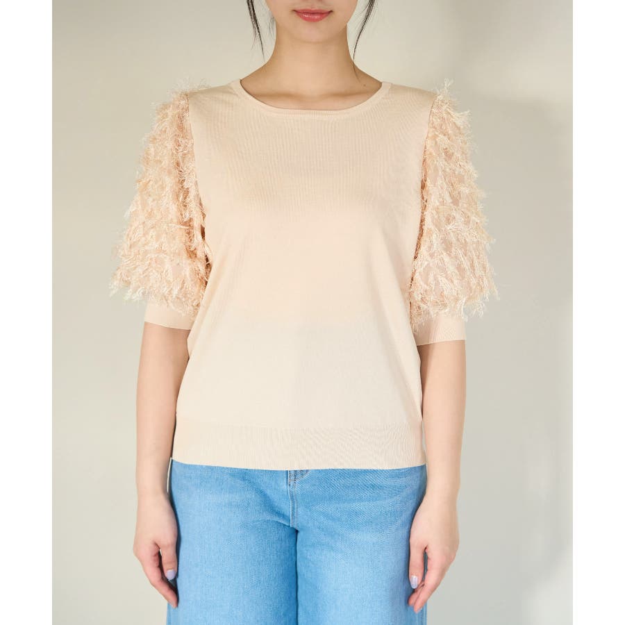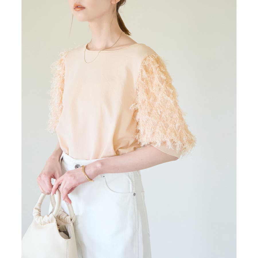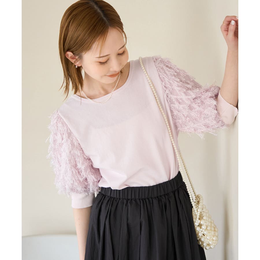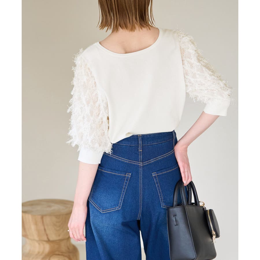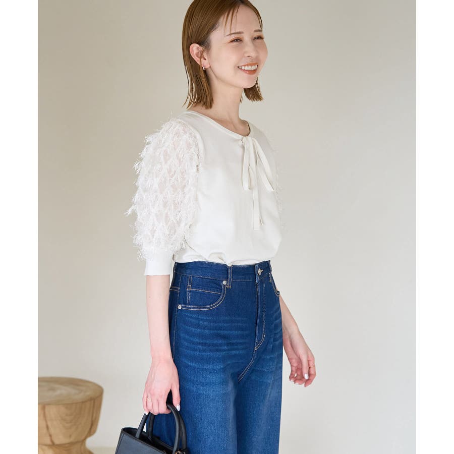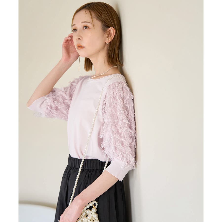 【デザイン・シルエット】 ・袖をシャギーニットで切り替えた、天竺編みのニットプルオーバー。 ・ふんわりスリーブのクラシカルな5分袖。 ・前後逆にも着られる2WAYで、繊細なリボンがポイント。 【カラー】 ・ブラック、オフホワイト、ベージュ、ピンクの4色展開。 【スタイリングポイント】 ・プリントスカートを合わせてエレガントなお出かけルックが完成。 ・オフホワイトやピンクはブルージーンズとも相性抜群。 ・裾リブですっきりとしていて、ワイドボトムも合わせやすい。 ----------------------------- 裏地:なし 透け感:なし 伸縮性:身頃はややあり 生地感・厚さ:普通 季節:春~秋 ----------------------------- ※撮影時の光、お使いのモニター環境によって色の見え方が違う場合がございます。 ※モデル身長:165cm 着用サイズ:38