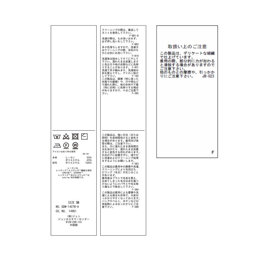 | 素材 | ブラック(01):(本体) レーヨン 55% ポリエステル 45% (別布) ポリエステル 100%|オフホワイト(15):(本体) レーヨン 55% ポリエステル 45% (別布) ポリエステル 100%|ベージュ(27):(本体) レーヨン 55% ポリエステル 45% (別布) ポリエステル 100%|ピンク(63):(本体) レーヨン 55% ポリエステル 45% (別布) ポリエステル 100% |