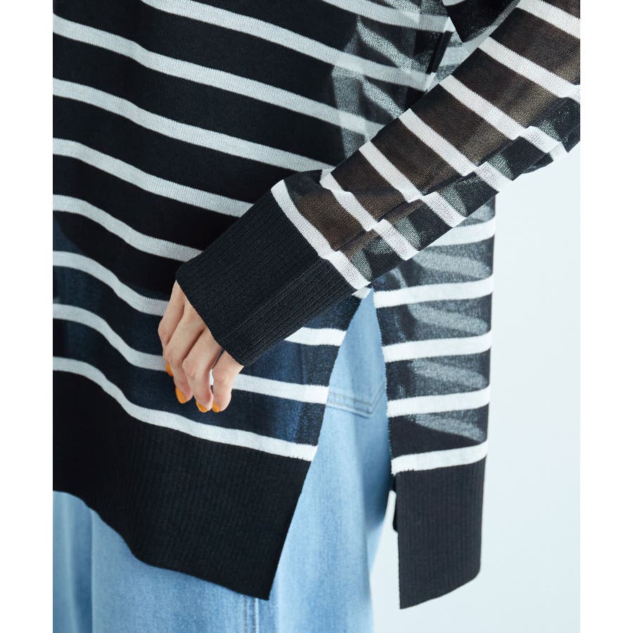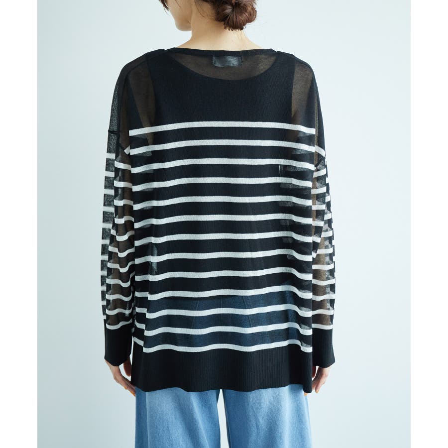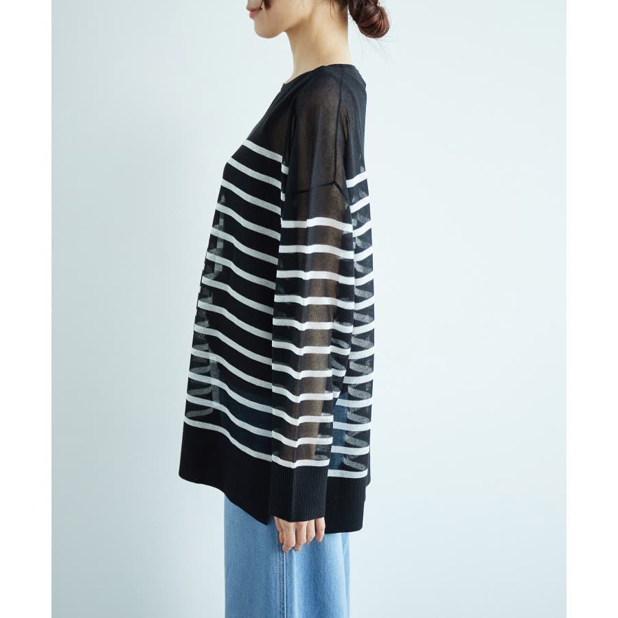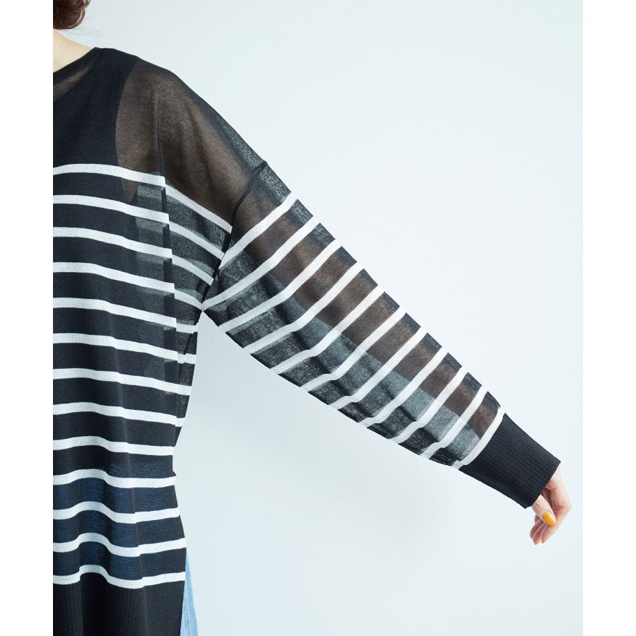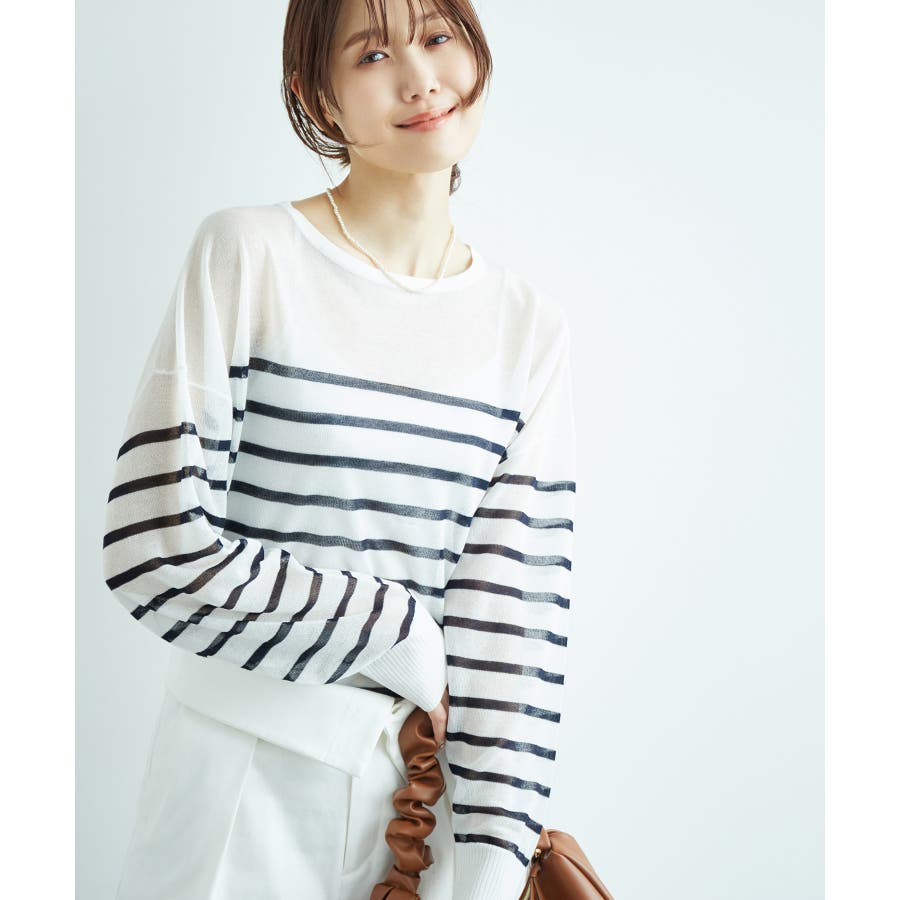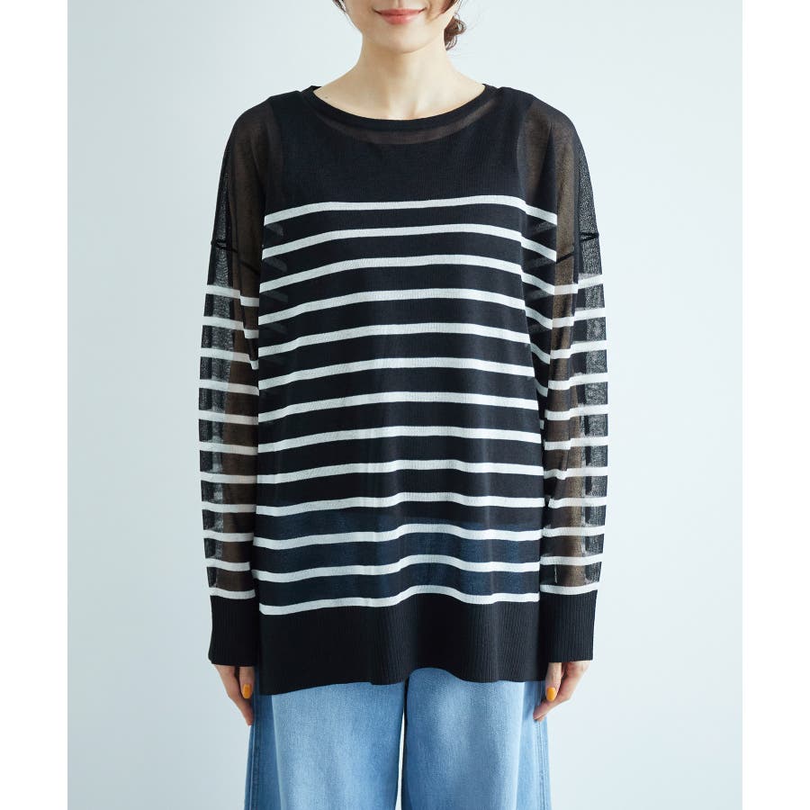【素材感】 ・シアー素材の糸で編んだボーダーニットプルオーバー。 【デザイン・シルエット】 ・大胆な透け感が魅力的な、ハイゲージ仕立てのボーダーニットプルオーバー。 ・たっぷりとしたワイドシルエットで、抜け感のある着こなしに導く一枚。 ・裾は長めのサイドスリット入り。 【カラー】 ブラック系(02):ブラック×ホワイト キナリ系(17):ホワイト×濃紺 【スタイリングポイント】 ・手持ちのタンクトップやキャミソールに重ねて、涼やかなレイヤードスタイルに。 ----------------------------- 裏地:なし 透け感:あり 伸縮性:ややあり 生地感・厚さ:薄手 季節:春・夏 ----------------------------- ※撮影時の光、お使いのモニター環境によって色の見え方が違う場合がございます。 ※モデル身長:165cm 着用サイズ:38