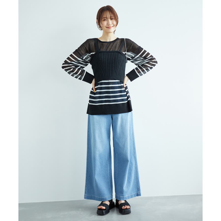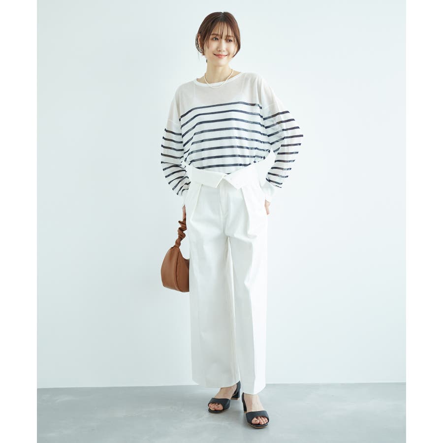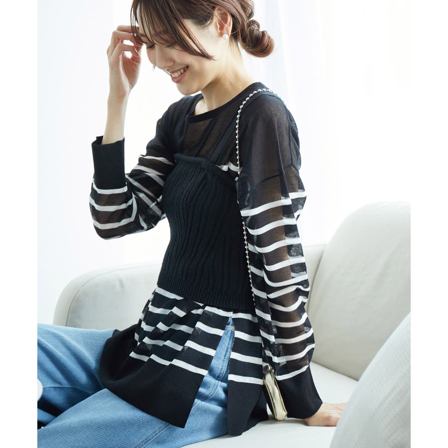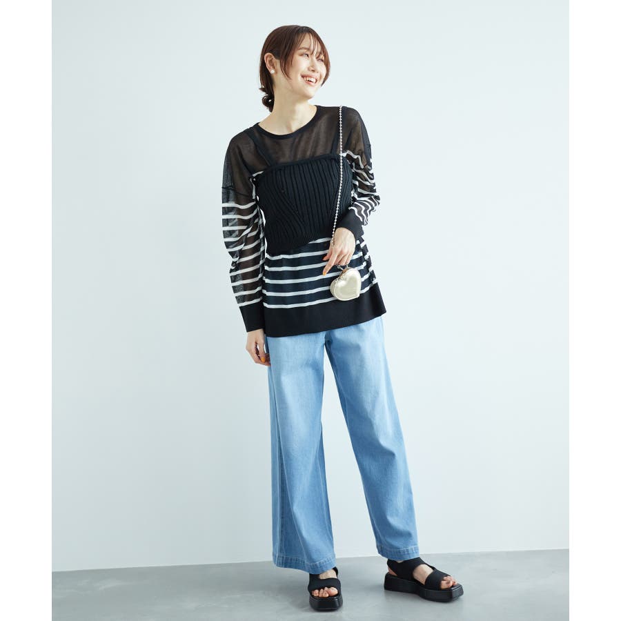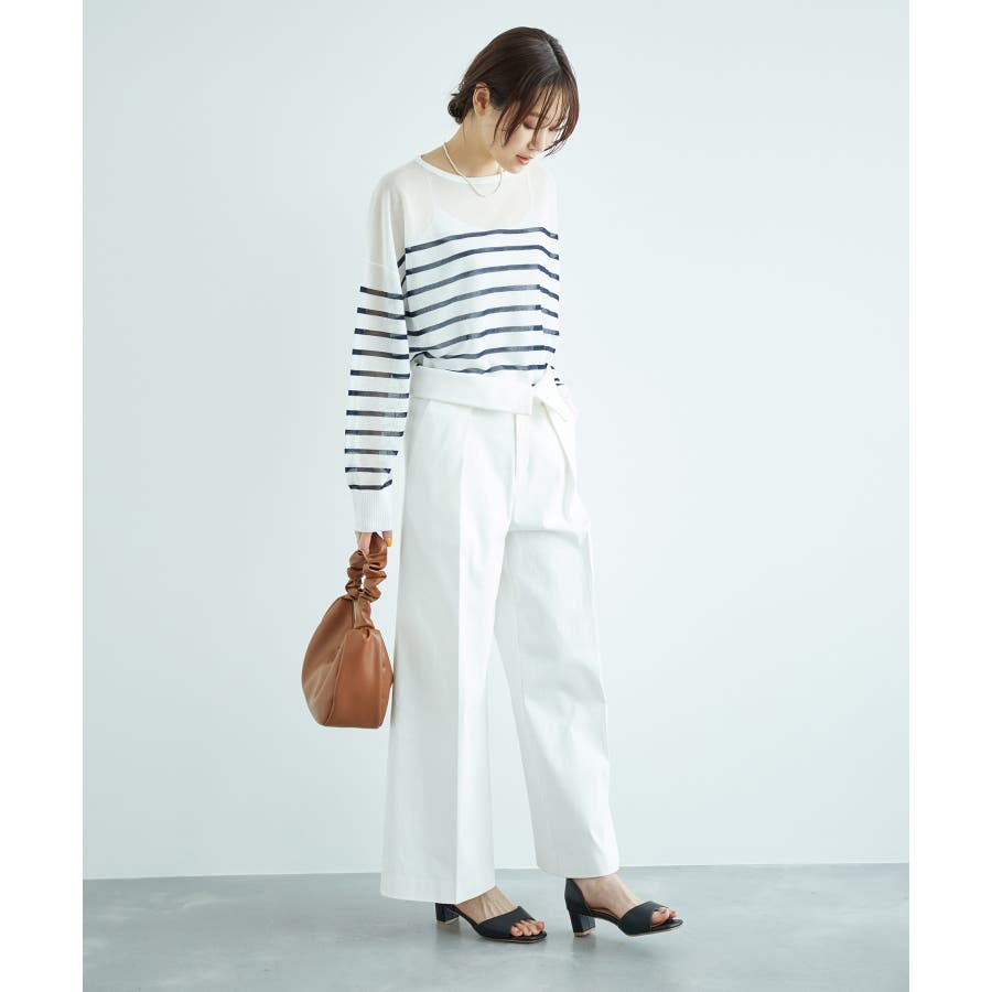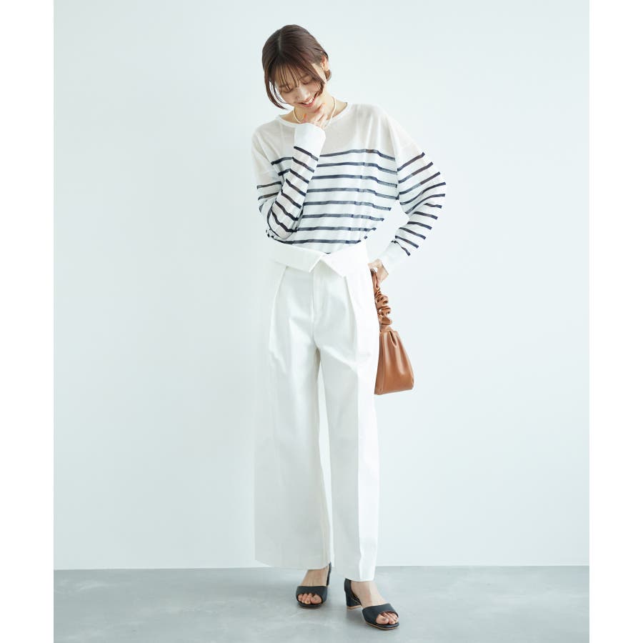 【素材感】 ・シアー素材の糸で編んだボーダーニットプルオーバー。 【デザイン・シルエット】 ・大胆な透け感が魅力的な、ハイゲージ仕立てのボーダーニットプルオーバー。 ・たっぷりとしたワイドシルエットで、抜け感のある着こなしに導く一枚。 ・裾は長めのサイドスリット入り。 【カラー】 ブラック系(02):ブラック×ホワイト キナリ系(17):ホワイト×濃紺 【スタイリングポイント】 ・手持ちのタンクトップやキャミソールに重ねて、涼やかなレイヤードスタイルに。 ----------------------------- 裏地:なし 透け感:あり 伸縮性:ややあり 生地感・厚さ:薄手 季節:春・夏 ----------------------------- ※撮影時の光、お使いのモニター環境によって色の見え方が違う場合がございます。 ※モデル身長:165cm 着用サイズ:38