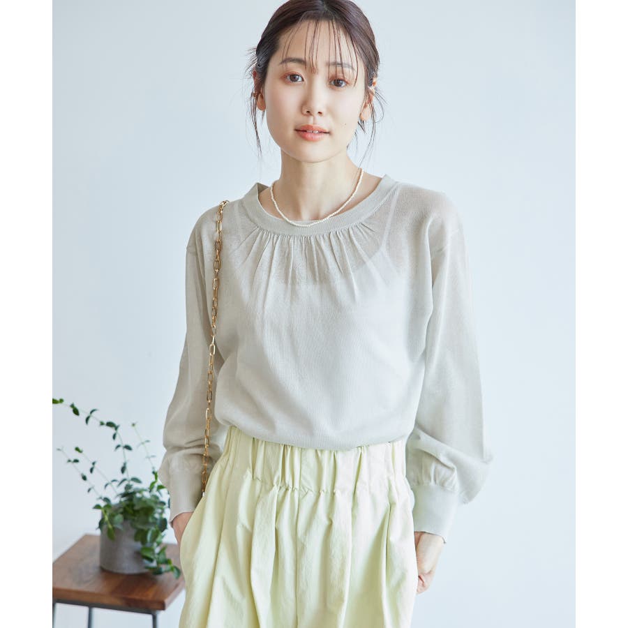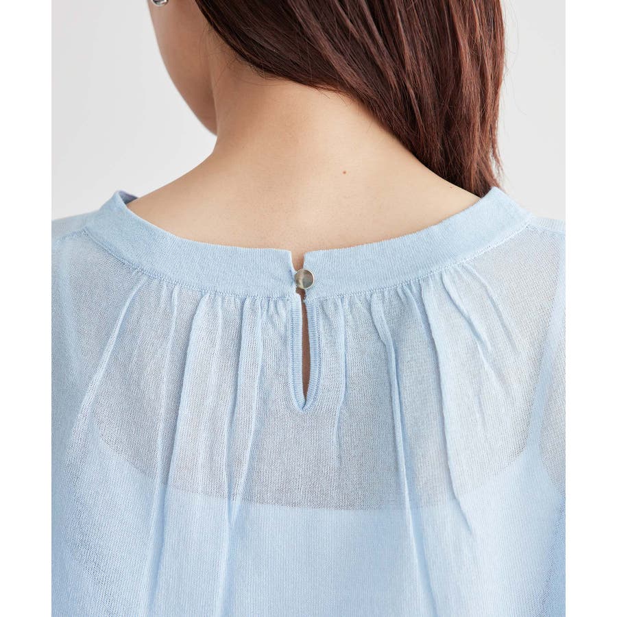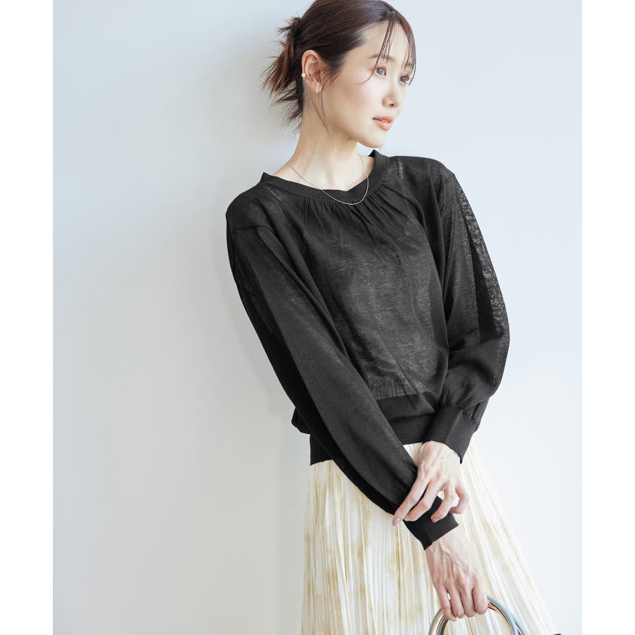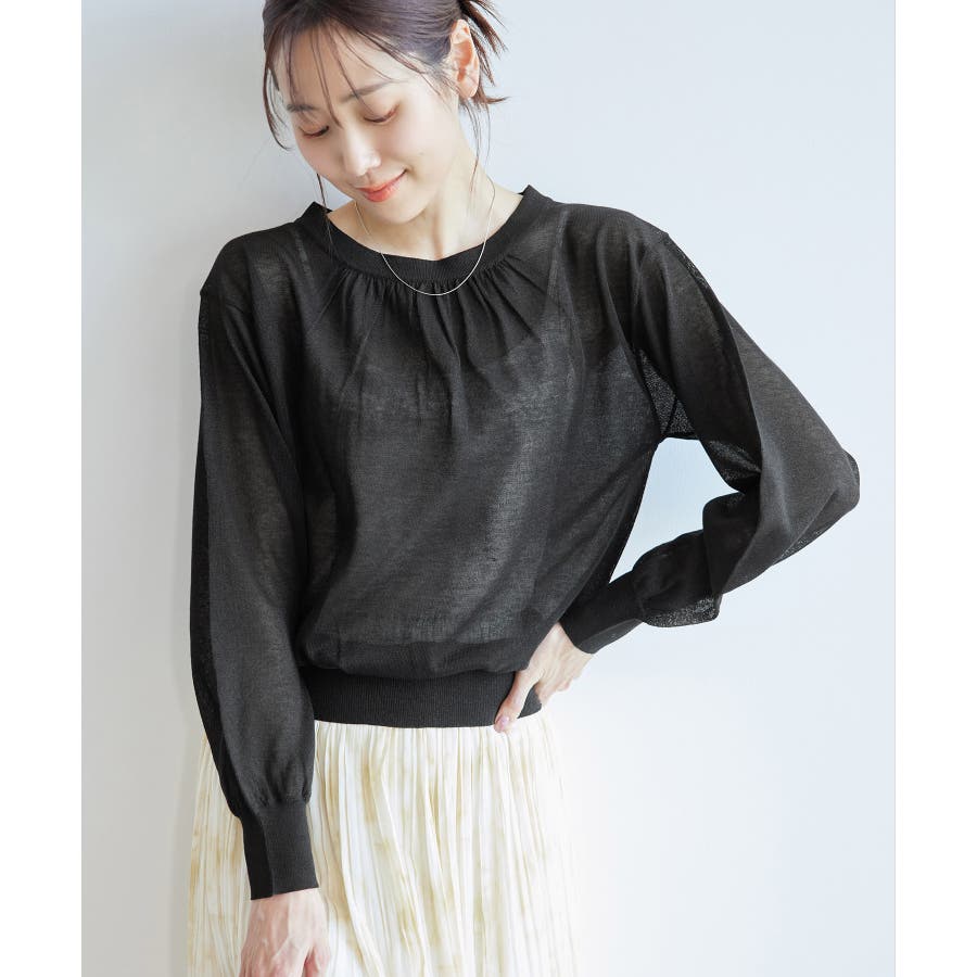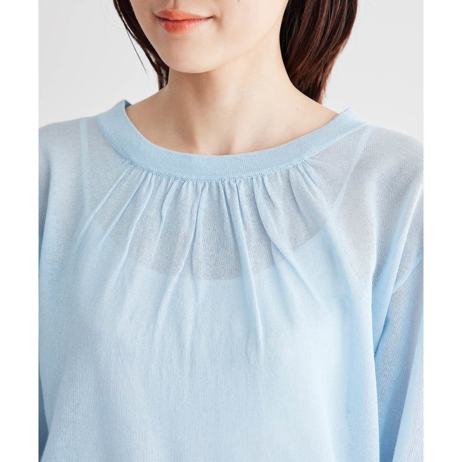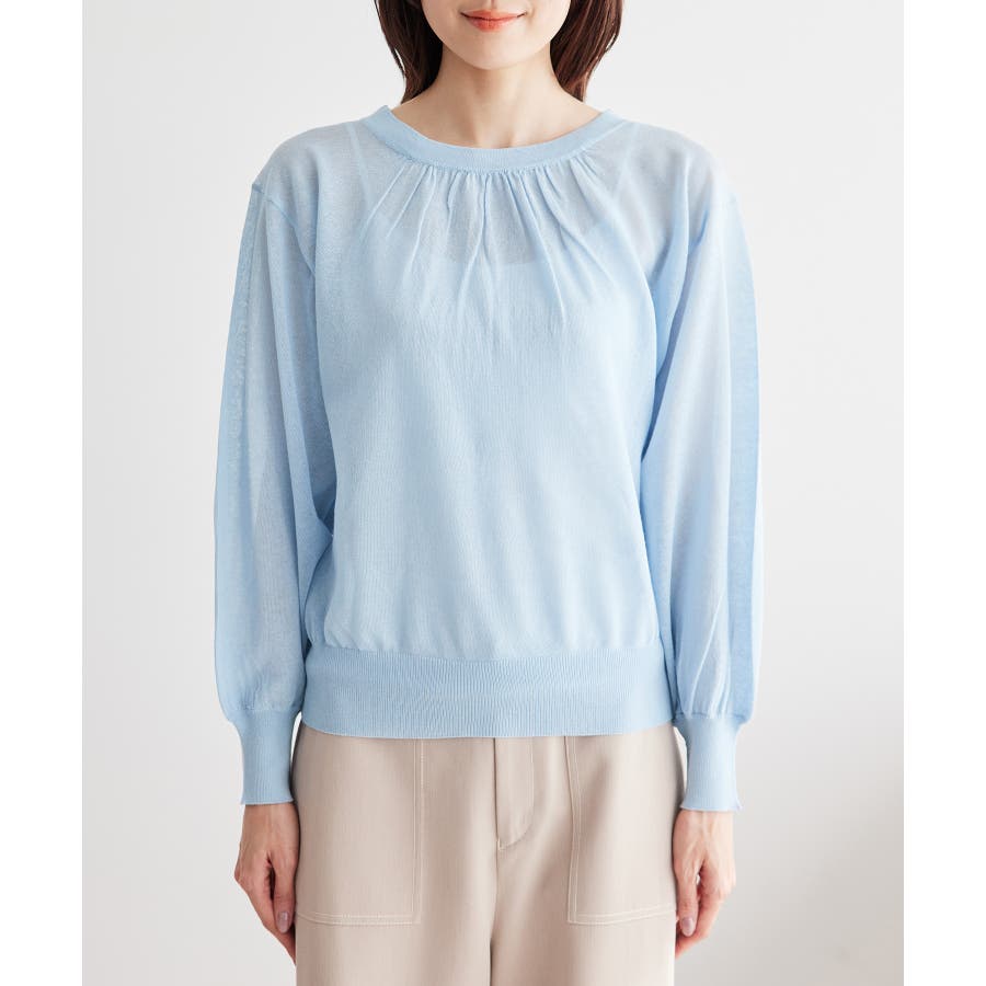 【デザイン・シルエット】 ・透け感のある大人なニットプルオーバー。 ・ネックラインと袖口にギャザーを入れた、ボリュームシルエット。 ・袖口と裾はリブ切り替えで引き締め。 【カラー】 ・ブラック、ライトグレー、ブルーのクールな3色展開。 【スタイリングポイント】 ・キャミソールワンピースとのレイヤードに一押し。 ・華やかな柄物スカートも相性抜群。 ----------------------------- 裏地:なし 透け感:ややあり 伸縮性:ややあり 生地感・厚さ:やや薄手 季節:春・夏 ----------------------------- ※撮影時の光、お使いのモニター環境によって色の見え方が違う場合がございます。 ※モデル身長:165cm 着用サイズ:38