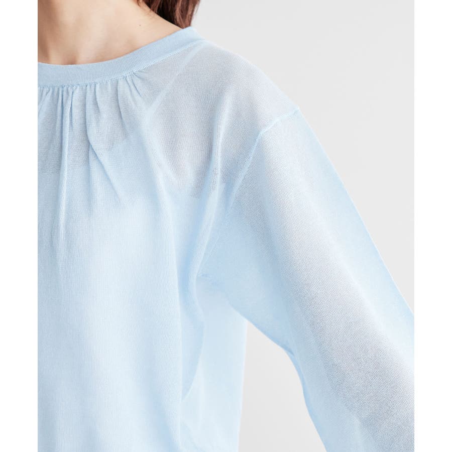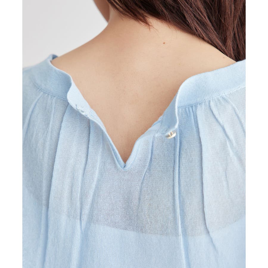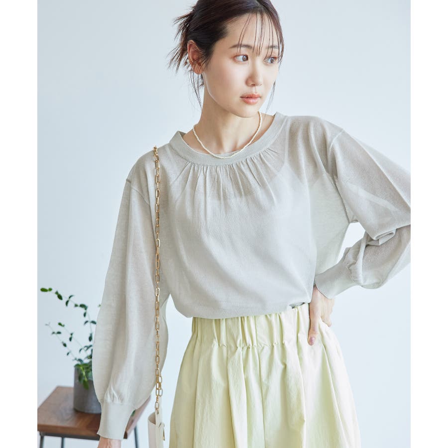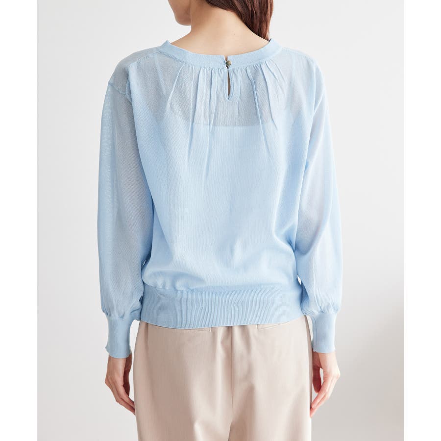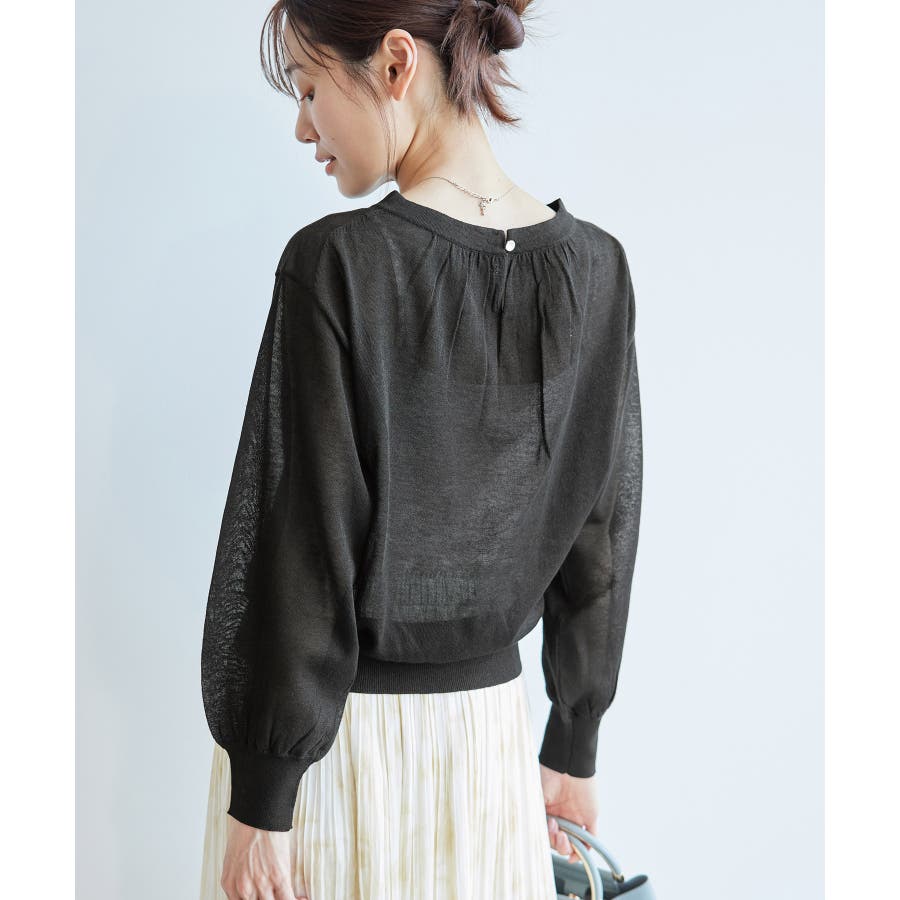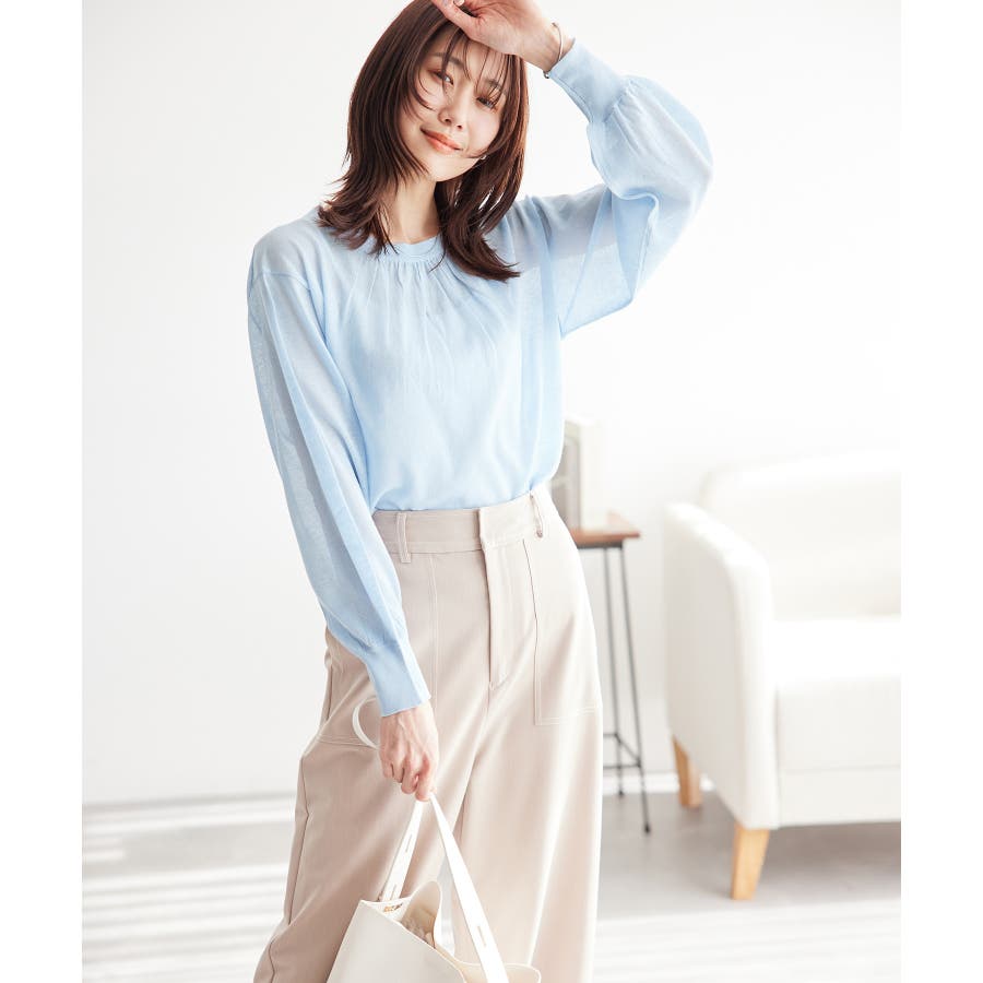 【デザイン・シルエット】 ・透け感のある大人なニットプルオーバー。 ・ネックラインと袖口にギャザーを入れた、ボリュームシルエット。 ・袖口と裾はリブ切り替えで引き締め。 【カラー】 ・ブラック、ライトグレー、ブルーのクールな3色展開。 【スタイリングポイント】 ・キャミソールワンピースとのレイヤードに一押し。 ・華やかな柄物スカートも相性抜群。 ----------------------------- 裏地:なし 透け感:ややあり 伸縮性:ややあり 生地感・厚さ:やや薄手 季節:春・夏 ----------------------------- ※撮影時の光、お使いのモニター環境によって色の見え方が違う場合がございます。 ※モデル身長:165cm 着用サイズ:38