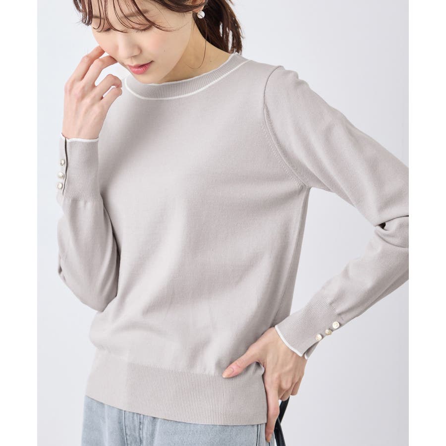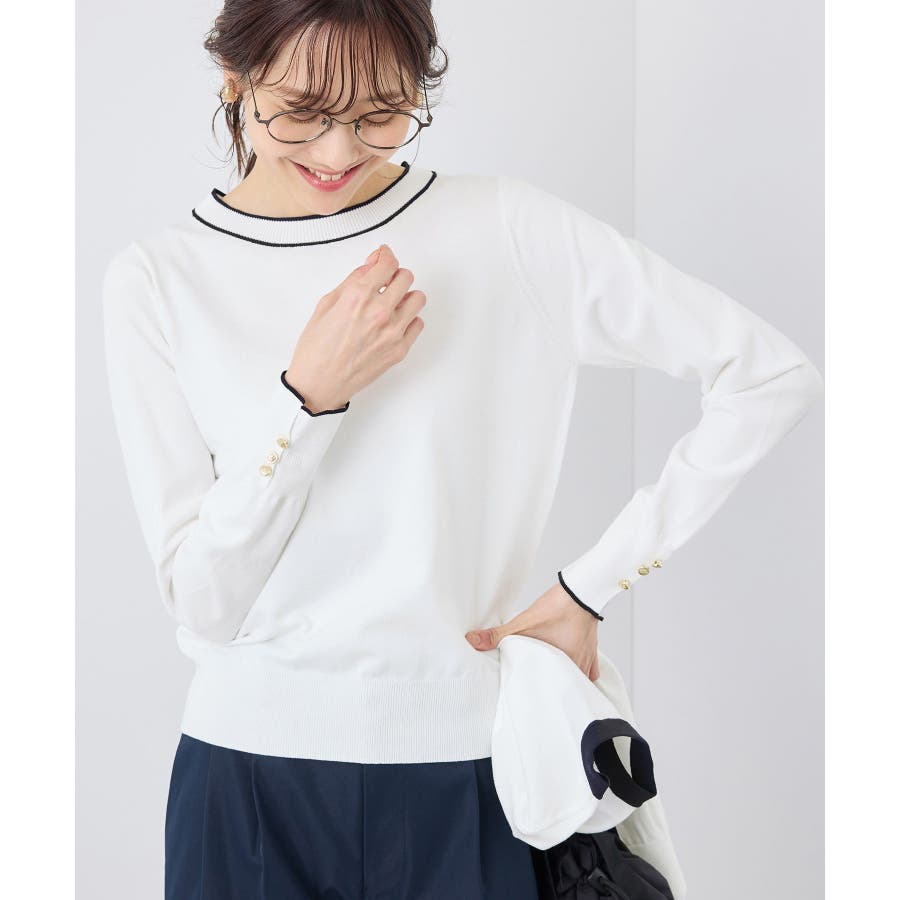 ・ネックと袖口にラインが入った、バイカラーのハイネックニット。