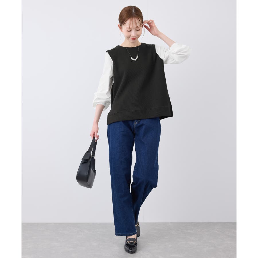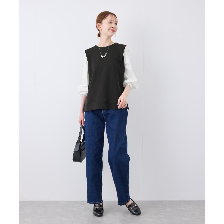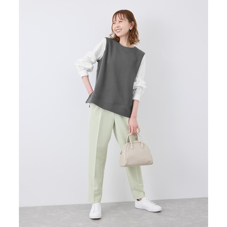 ・シンプルなテーパードパンツ合わせで、きちんと感のあるオフィスコーデに。