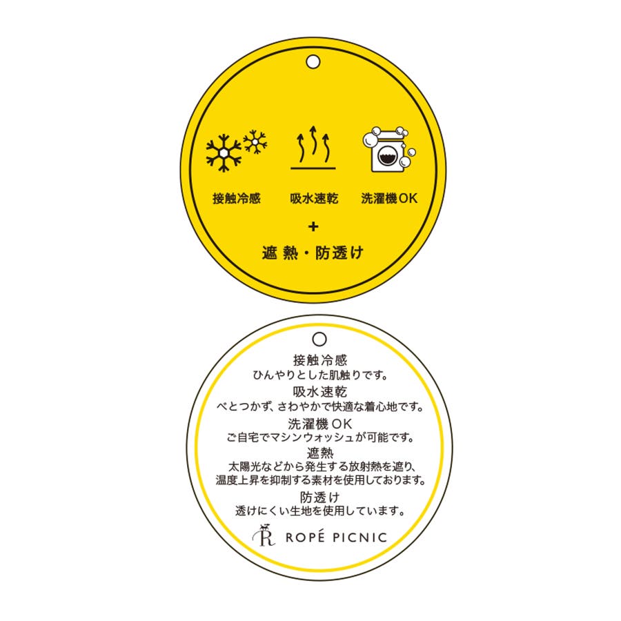 ・ひんやりとした肌触りの「接触冷感」、ベトつかず爽やかな着心地の「吸水速乾」、ご自宅でのお洗濯可能な「洗濯機OK」、太陽光などから発生する放射熱を遮り、温度上昇を抑制する「遮熱素材」、透けにくい生地を使用した「防透け」の多機能素材。