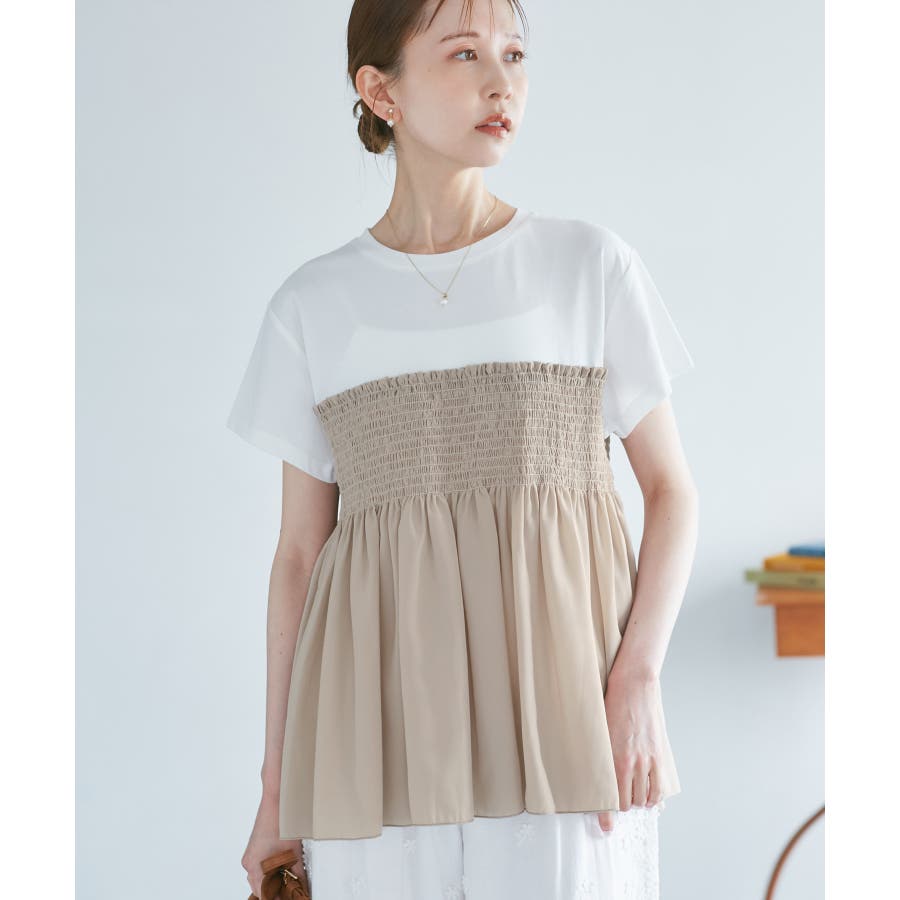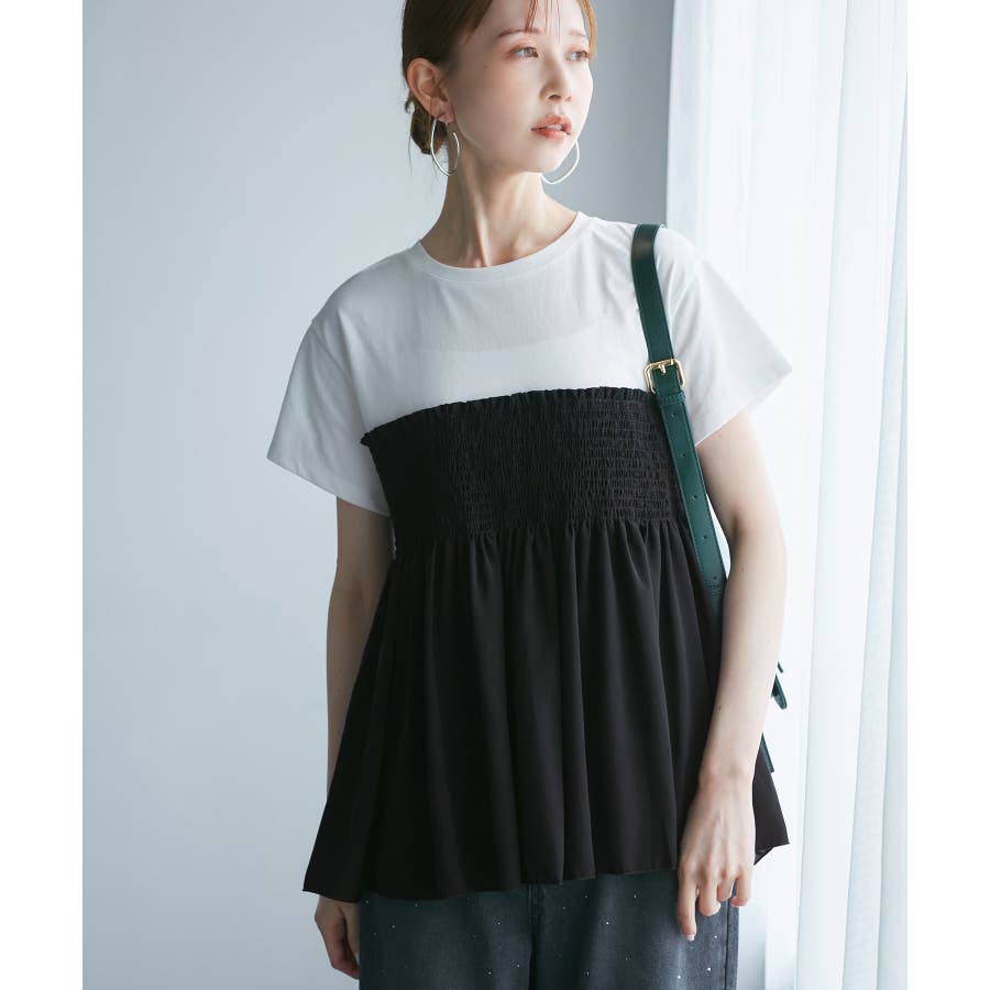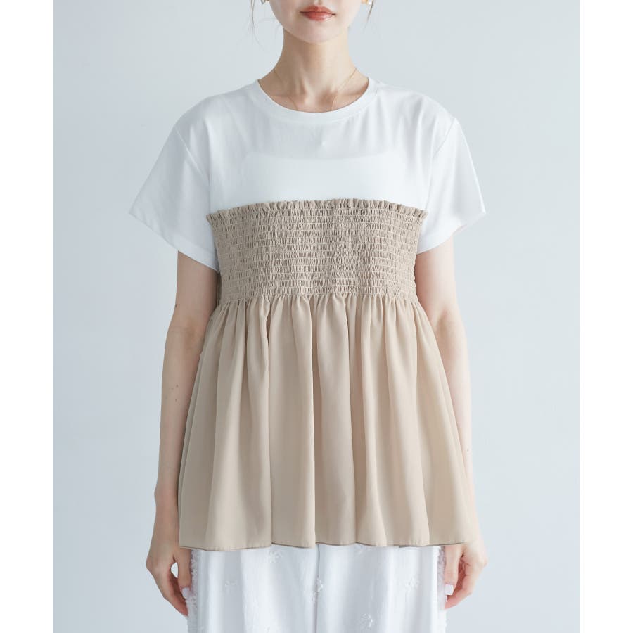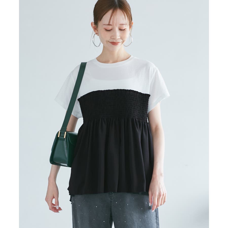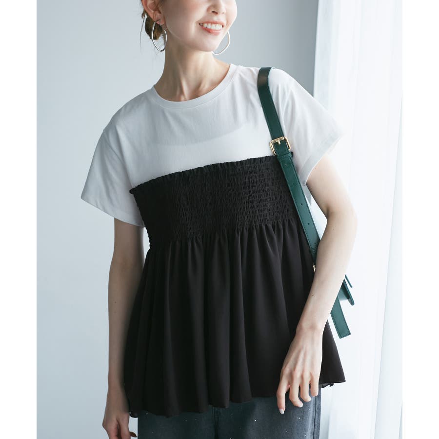 Tシャツにシャーリングがついたトップスで、重ね着風になっています。