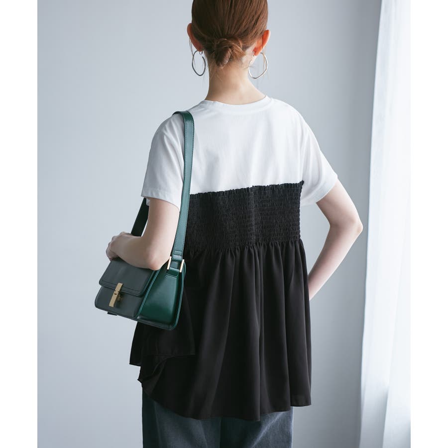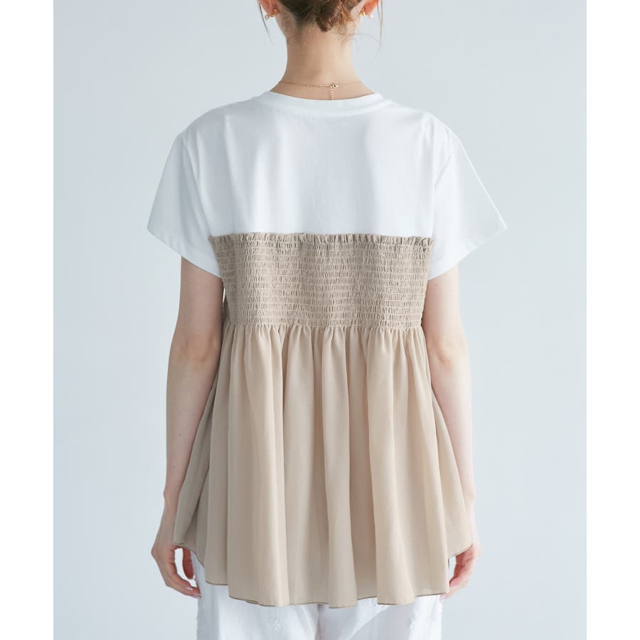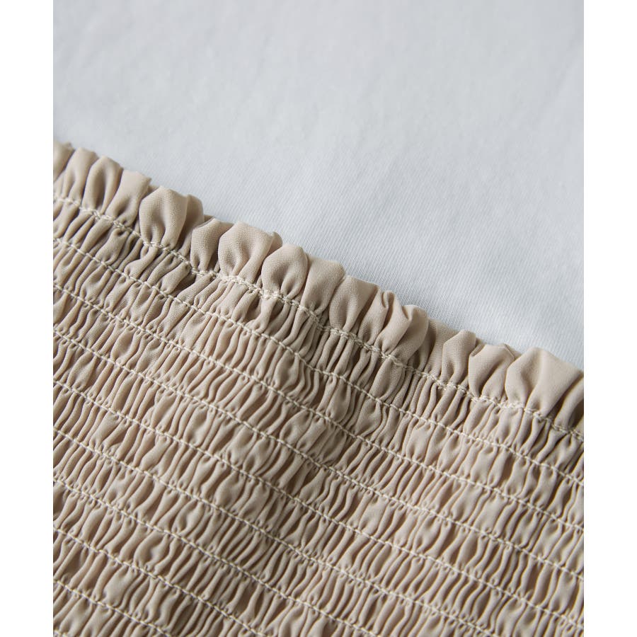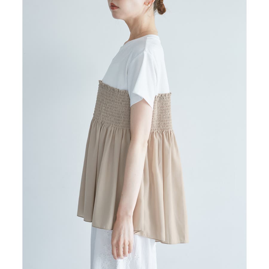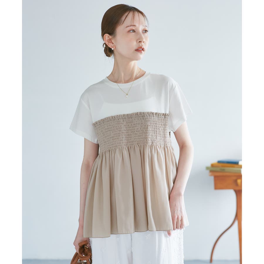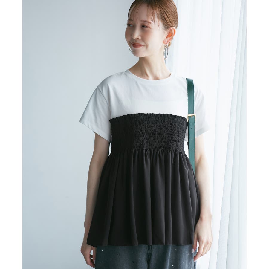 Tシャツにシャーリングがついたトップスで、重ね着風になっています。
