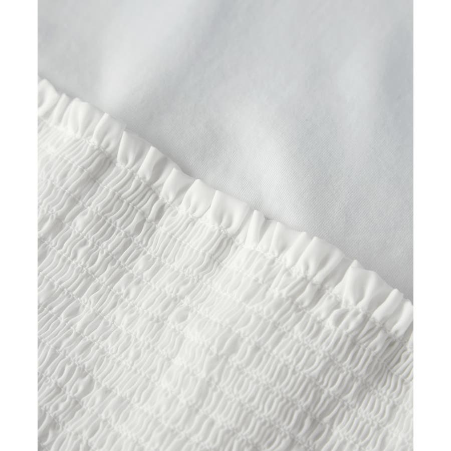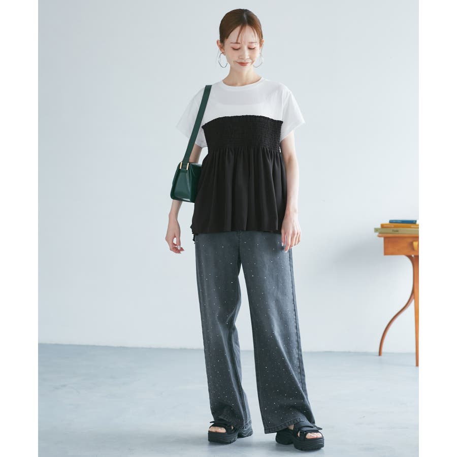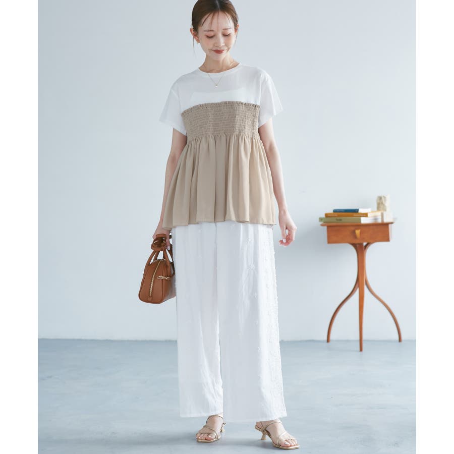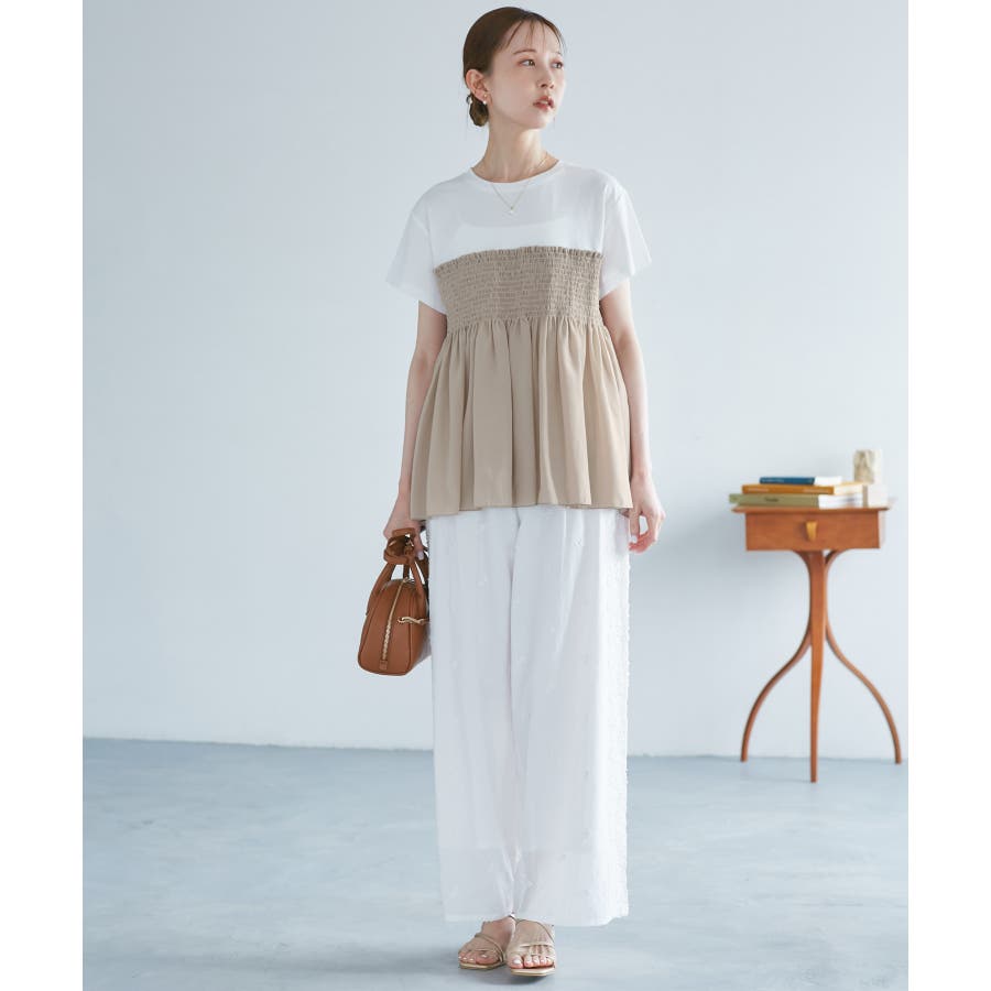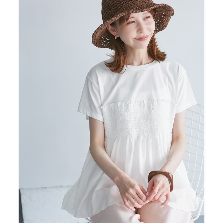 Tシャツにシャーリングがついたトップスで、重ね着風になっています。