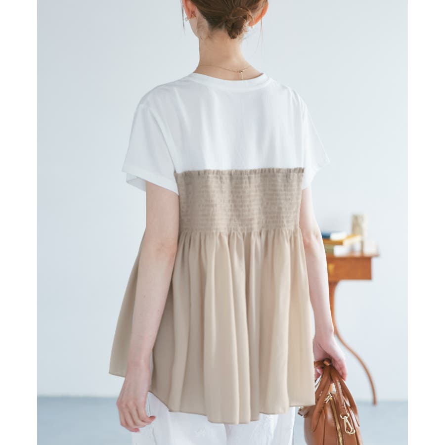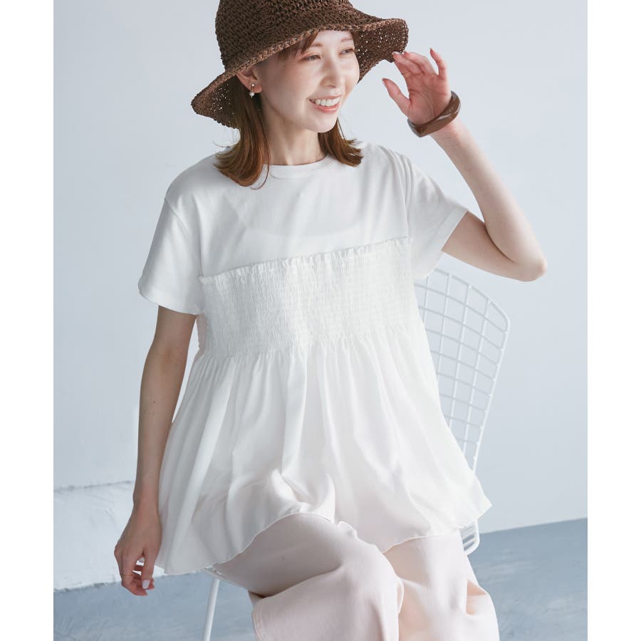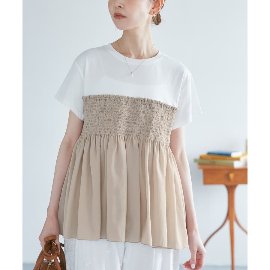・胸元のシャーリングデザインが大人可愛い布帛ドッキングトップス。