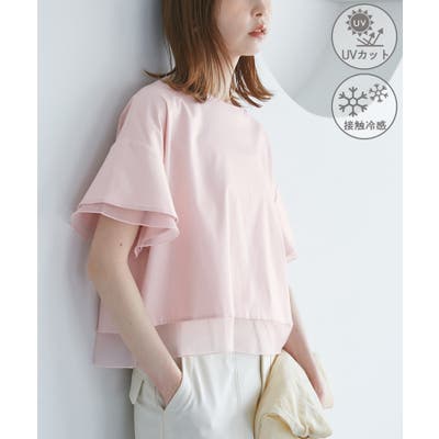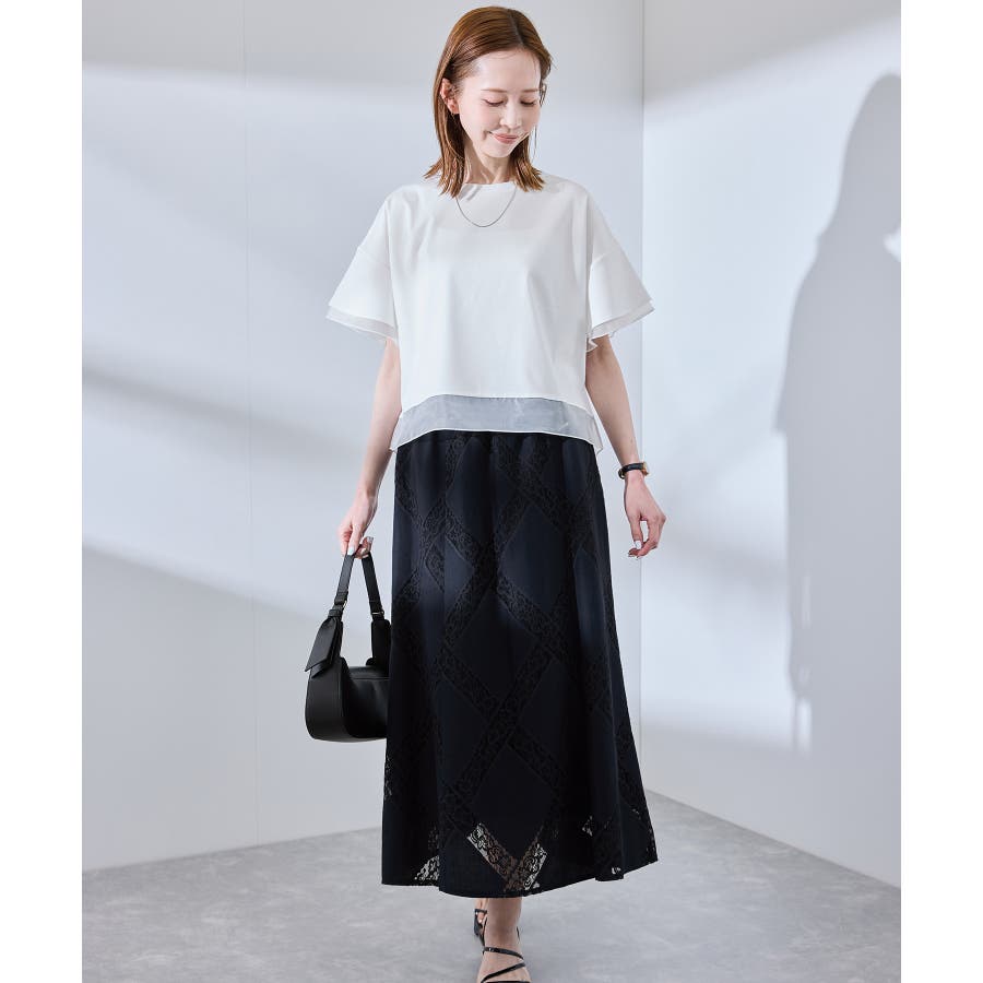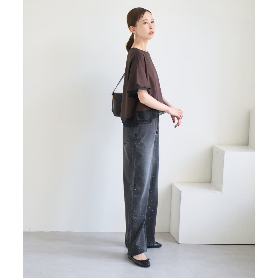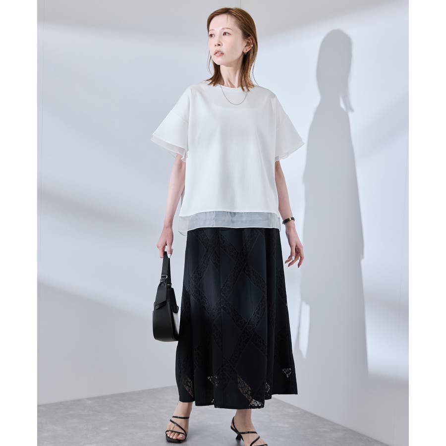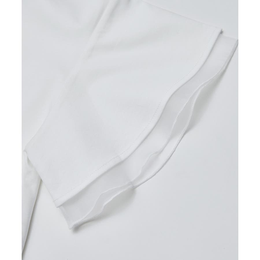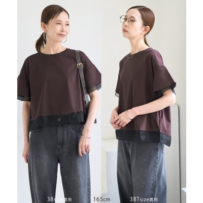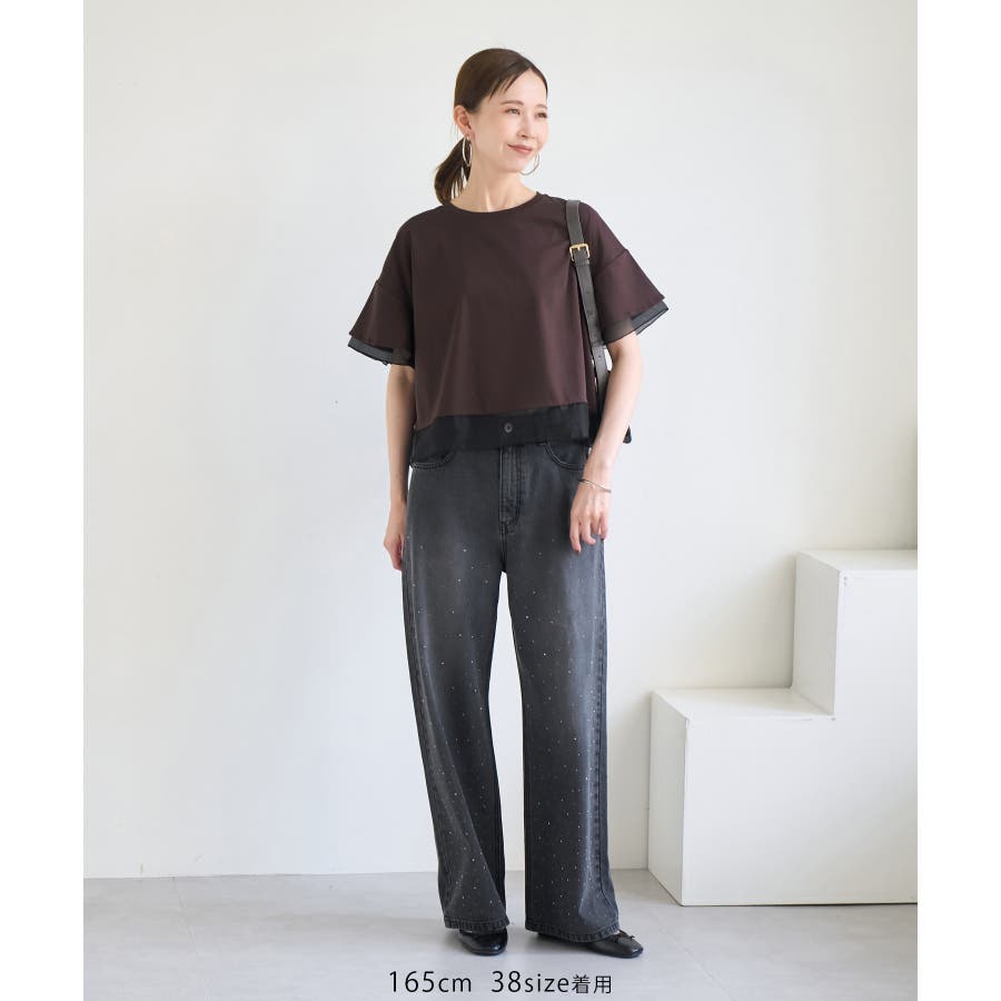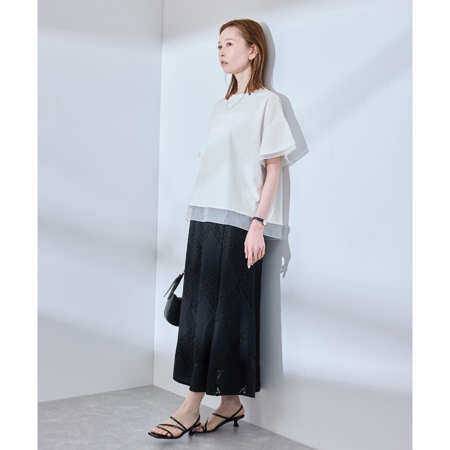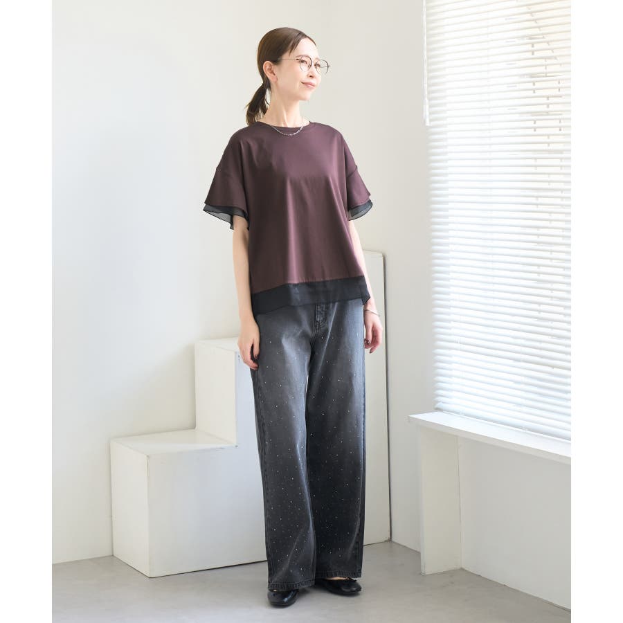 ・袖口や裾は、シアーな布帛素材で切り替えた半袖トップス。