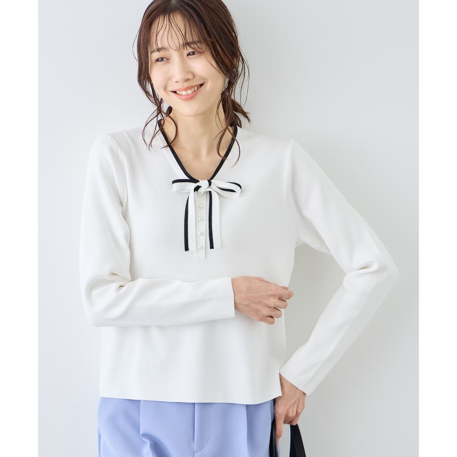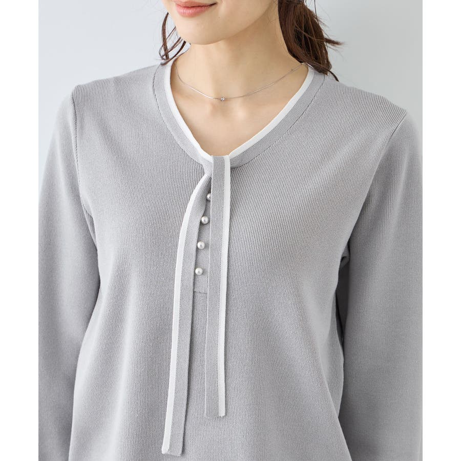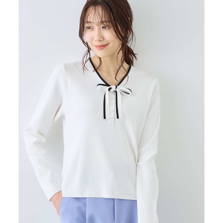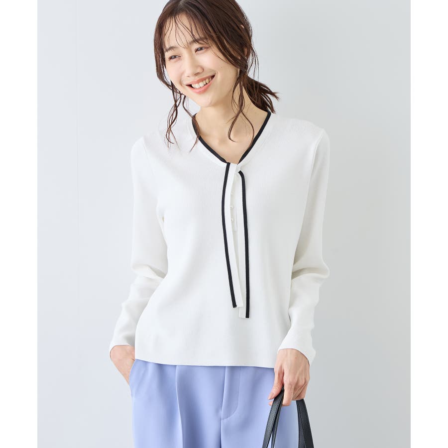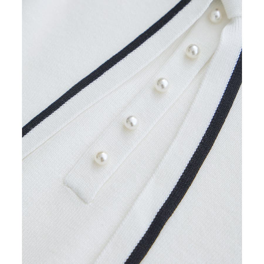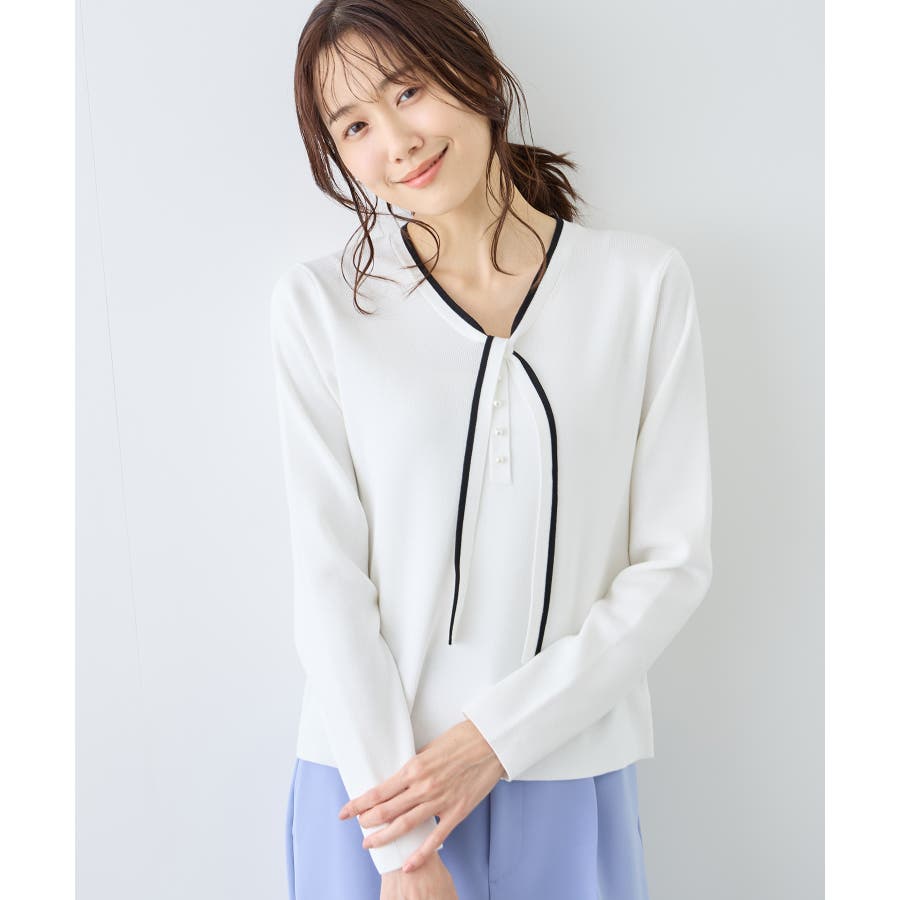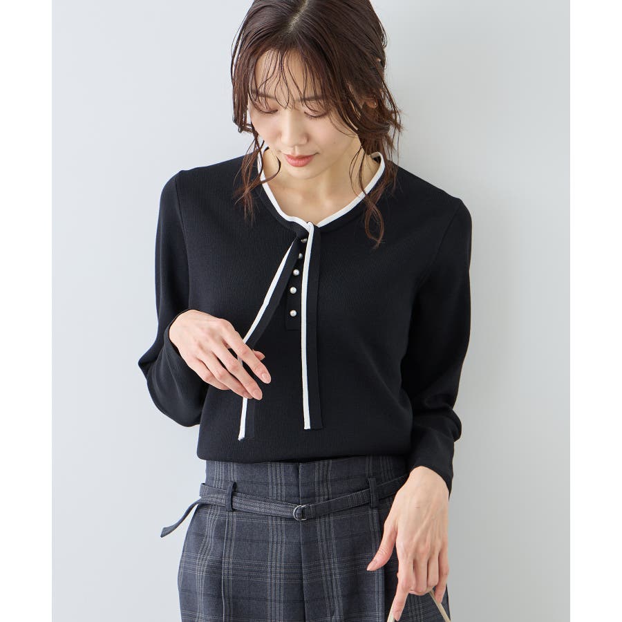 ・配色ラインを効かせ、パールボタンをあしらった華やかなフロントデザイン。