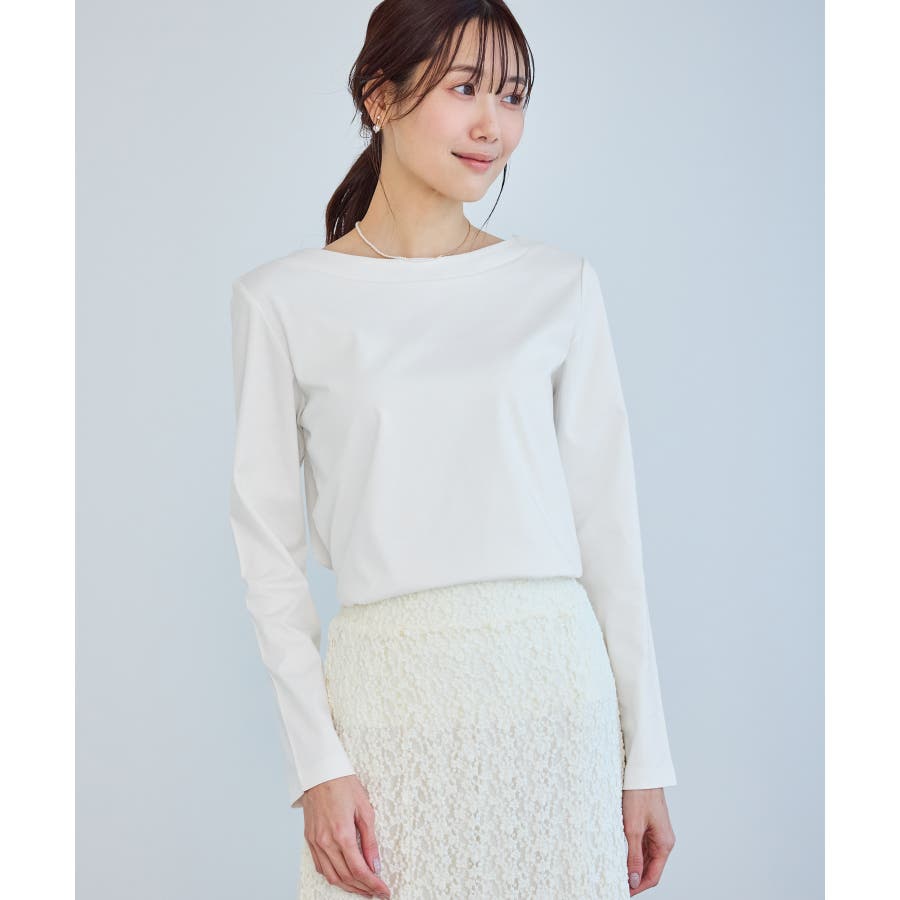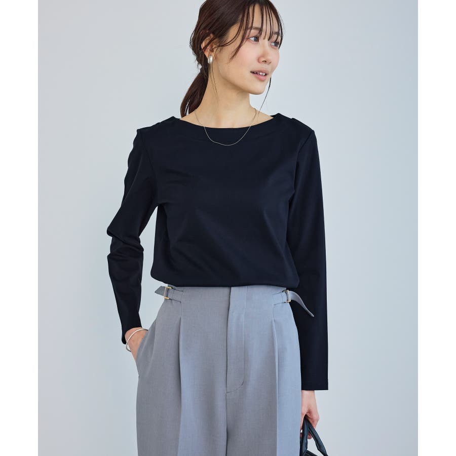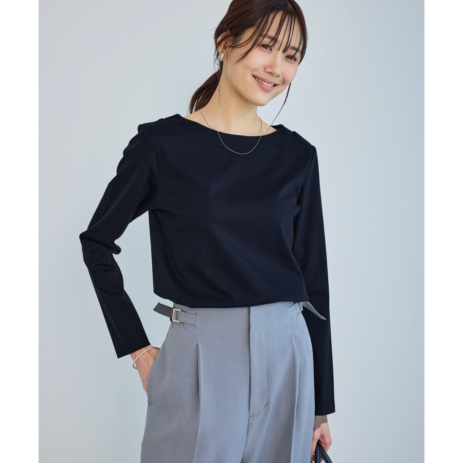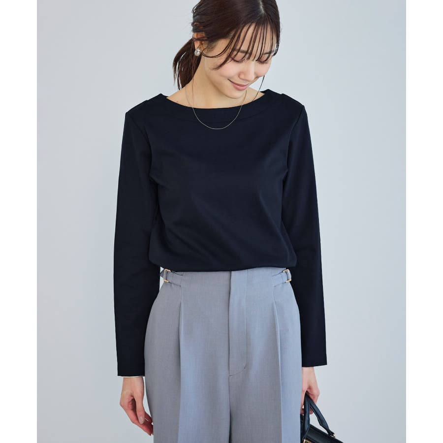 ・程よい抜け感を演出するボートネックデザイン。