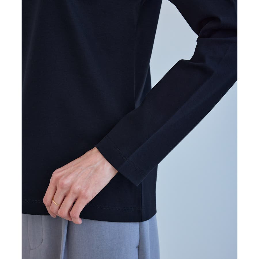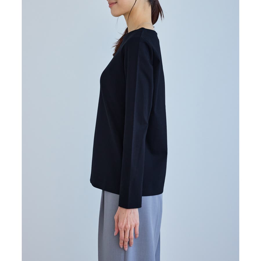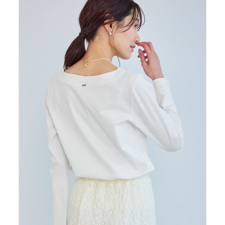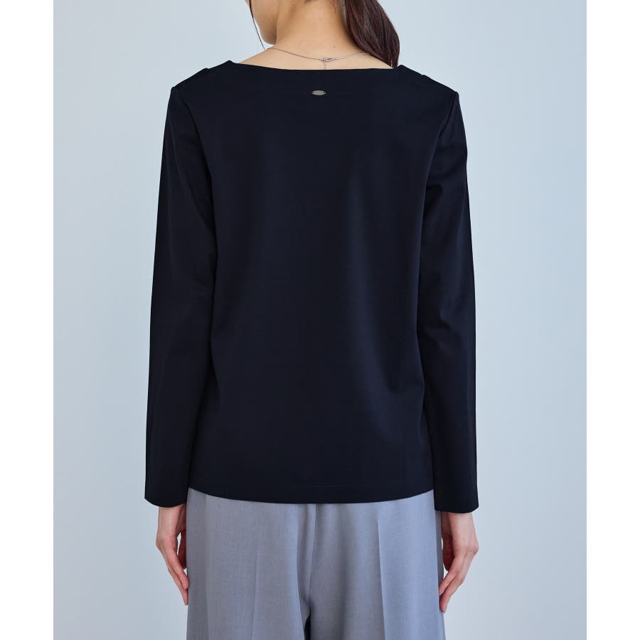 ・衿ぐりの切り替えが、ジャケット着用時のさりげないアクセントに。