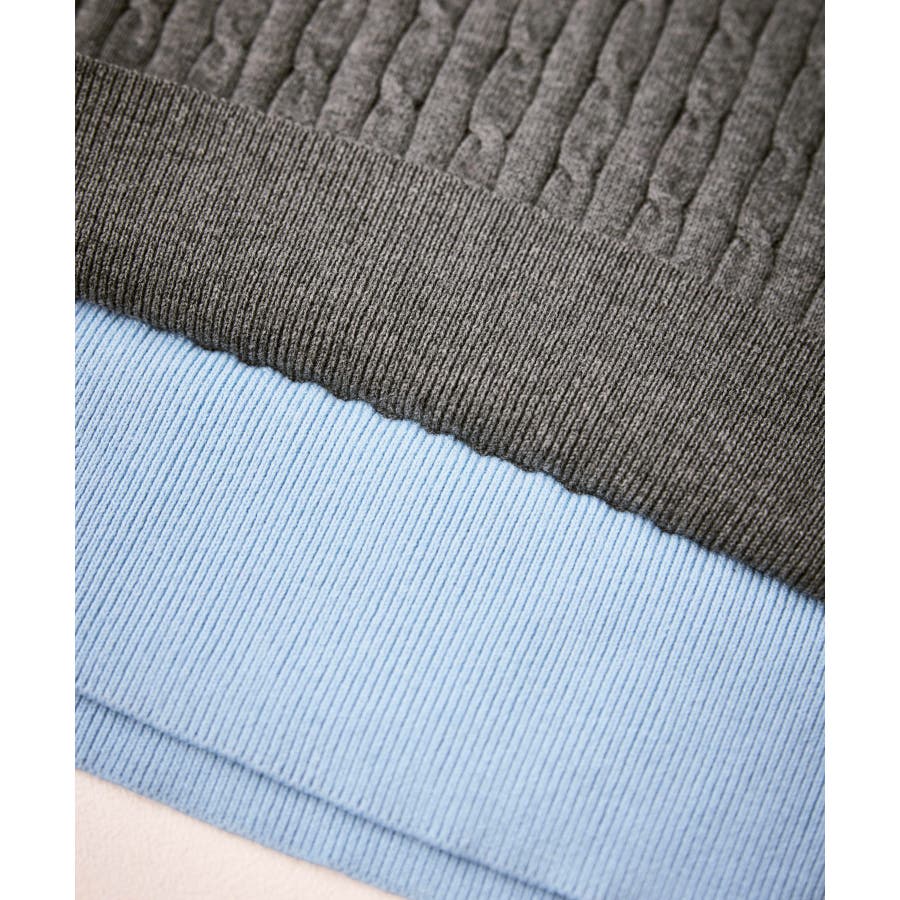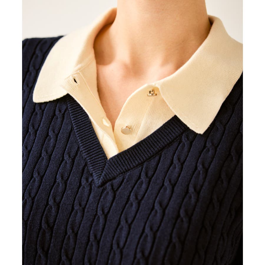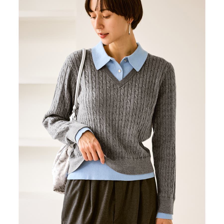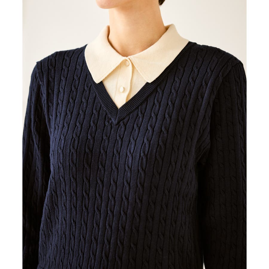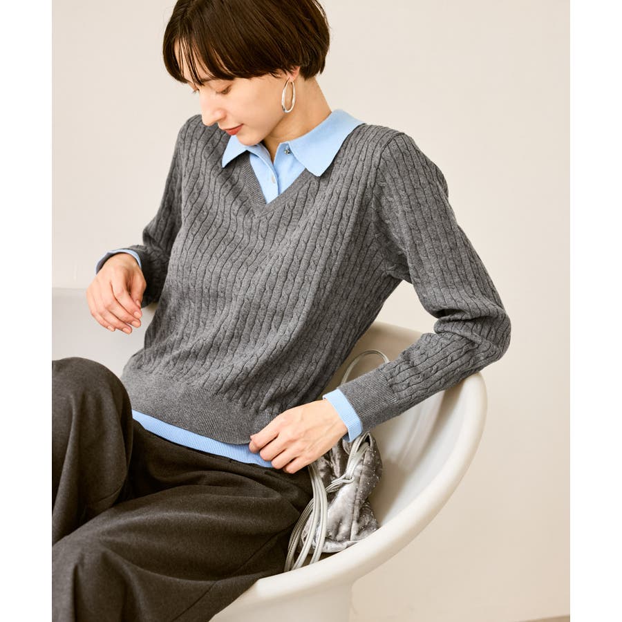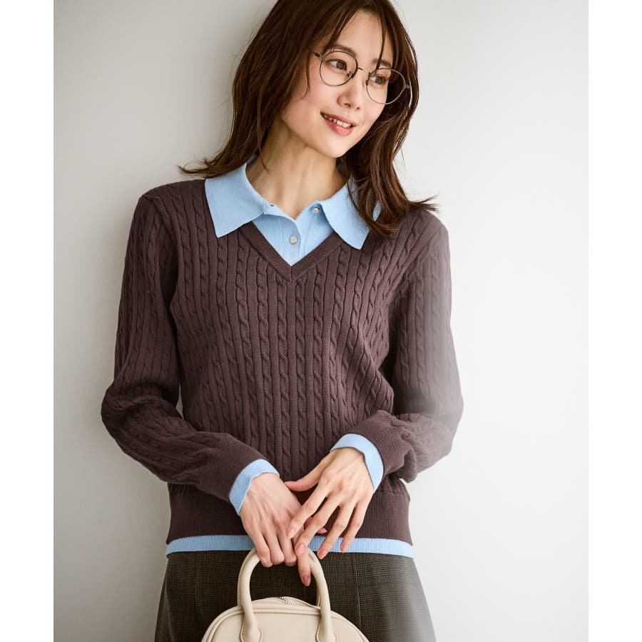 ・Vネックのデザインのレイヤード風で襟部分はフラットな見え方・身頃はリブでオールニットですが表情が違うのもポイント。