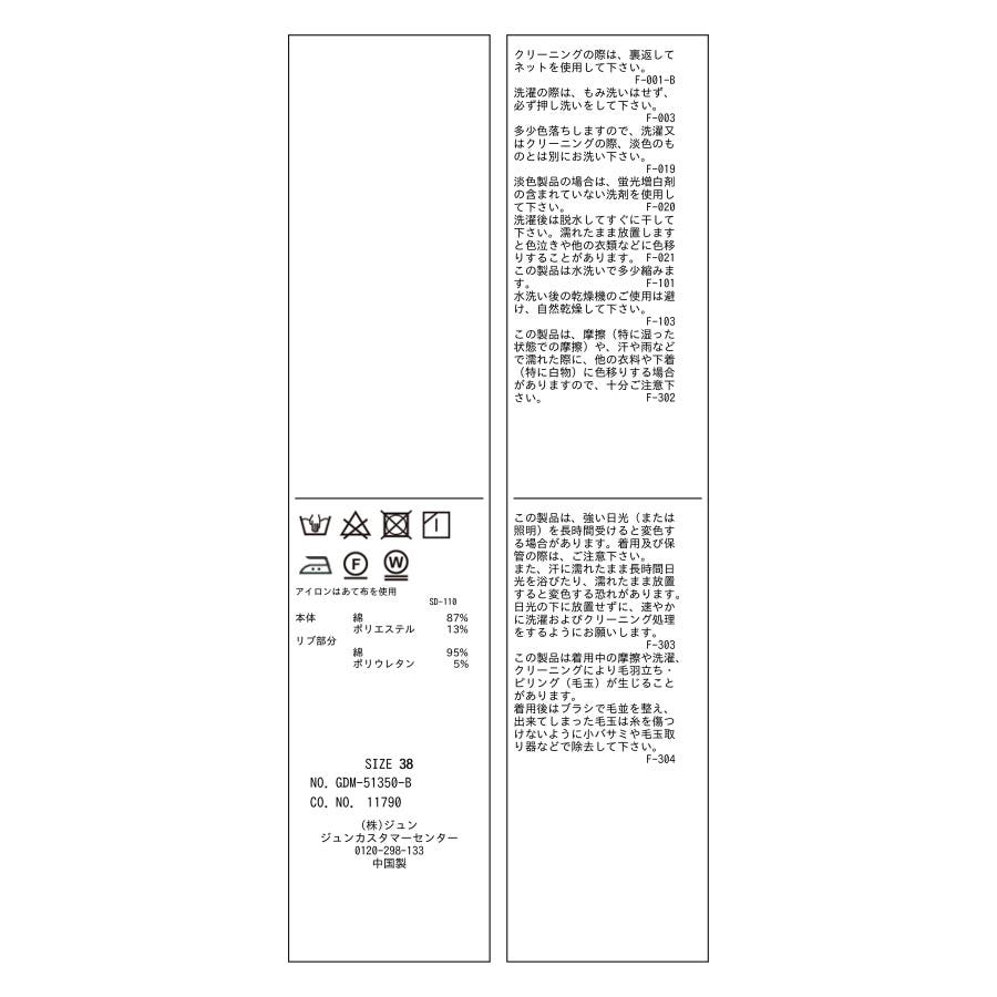 | 素材 | ブラック(01):(本体) 綿 87% ポリエステル 13% (リブ部分) 綿 95% ポリウレタン 5%|グレー(07):(本体) 綿 87% ポリエステル 13% (リブ部分) 綿 95% ポリウレタン 5%|ホワイト(10):(本体) 綿 87% ポリエステル 13% (リブ部分) 綿 95% ポリウレタン 5% |