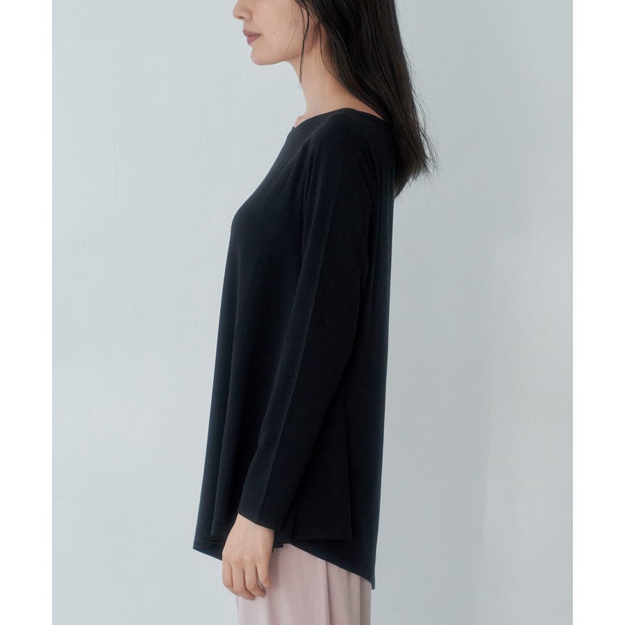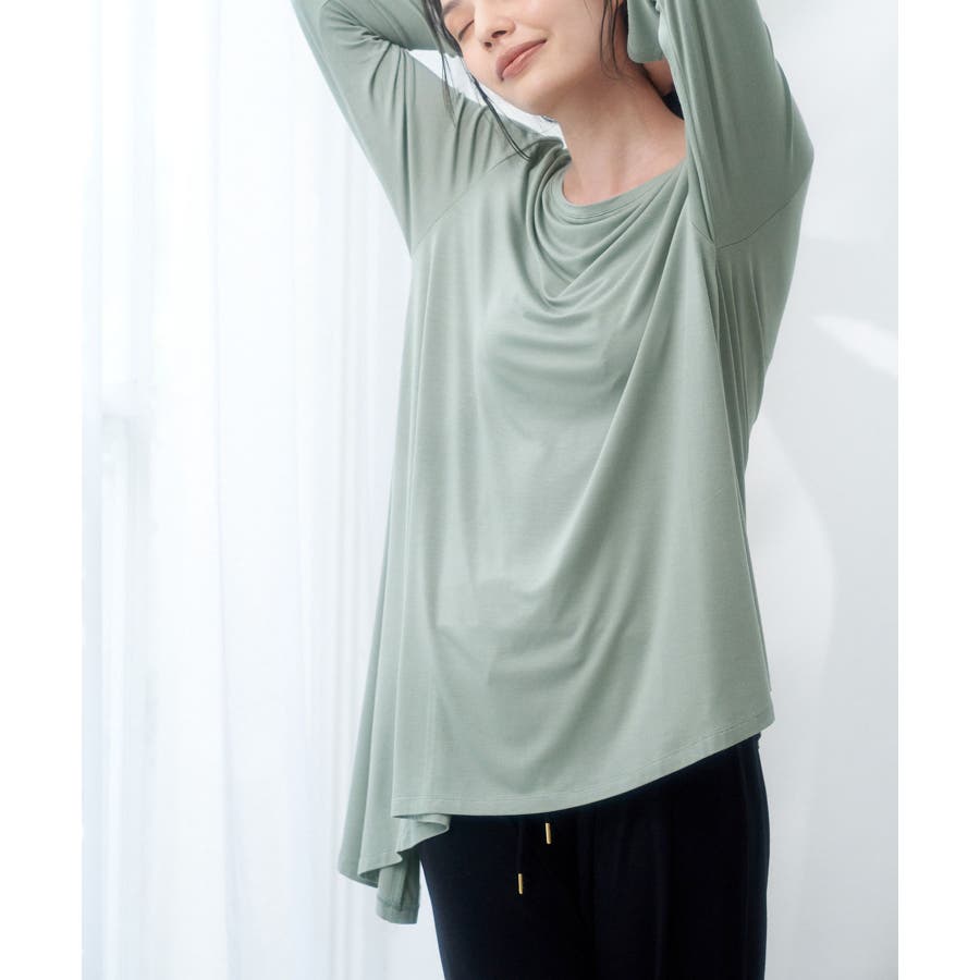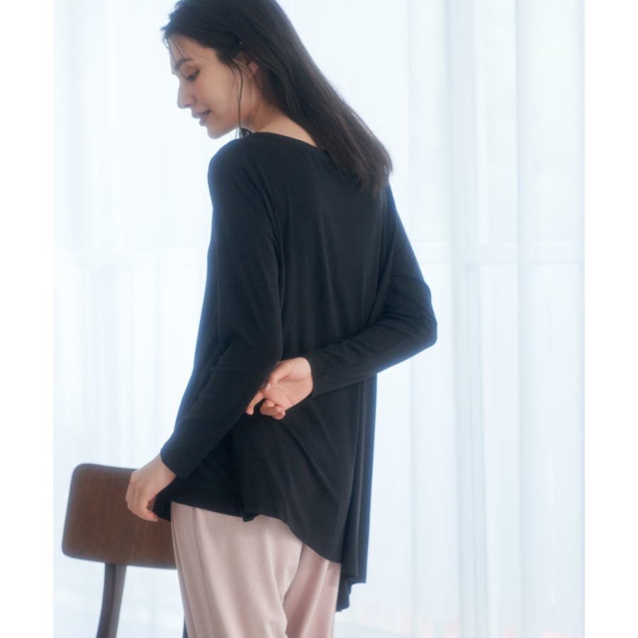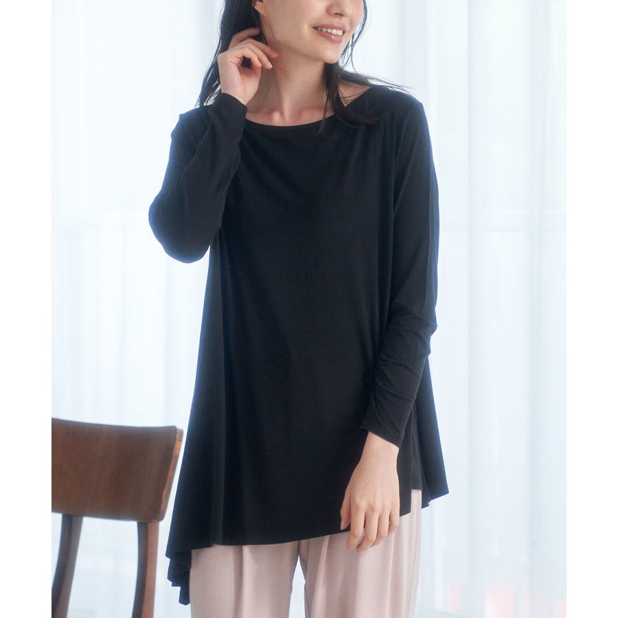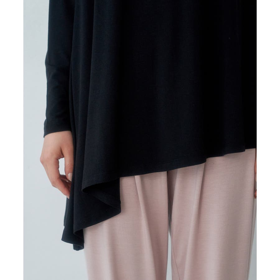 【素材感】 ・薄手のテロンとした素材で肌触り◎ ・伸縮性があり、ストレスフリーな着心地で部屋着はもちろんワンマイルウェアにおすすめ。 【デザイン・シルエット】 ・裾に生まれるドレープ感が魅力的な、アシンメトリーヘムのフレアトップス。 ・豊かに広がるシルエットで、お腹まわりがカバーできるデザイン。 【カラー】 ・ブラック、オリーブ、ピンクの3色展開。 【スタイリングポイント】 ・裾をラフにロールアップしたジーンズなど、カジュアルボトムにマッチ。 ・ベーシックなクルーネックカーディガンを重ねたレイヤードもおすすめ。 ・同素材でフレンチスリーブ(品番:GDM51930)もございます。 ・同素材のパンツ(品番:GDS51920)と合わせてセットアップスタイルもおすすめ。 ----------------------------- 裏地:なし 透け感:ブラック(01)オリーブ(37)はなし、ピンク系(65)はややあり 伸縮性:あり 生地感・厚さ:薄手 季節:春~秋 ----------------------------- ※撮影時の光、お使いのモニター環境によって色の見え方が違う場合がございます。 : □■着用レビュー■□ 〈スタッフA〉 身長:151cm 普段の着用サイズ:36(S) 着用サイズ:38 サイズ感:ネックラインが横に広く、肌見えします。袖は長くフィット感があるので、くしゅくしゅっと着れます。 素材感:とても伸びが良い素材です。薄手でとても柔らかかったです。 着心地:肌触りがとても良く、とてもリラックスして着られました。 おすすめコーデ:ワンマイルウェアにおすすめです。チュニック丈なので、きれいめの細身パンツがバランスが良いです。