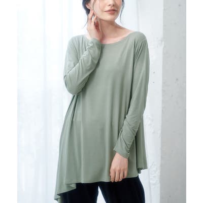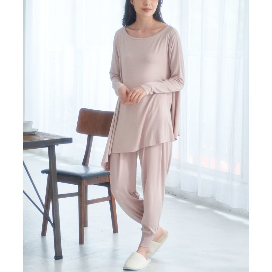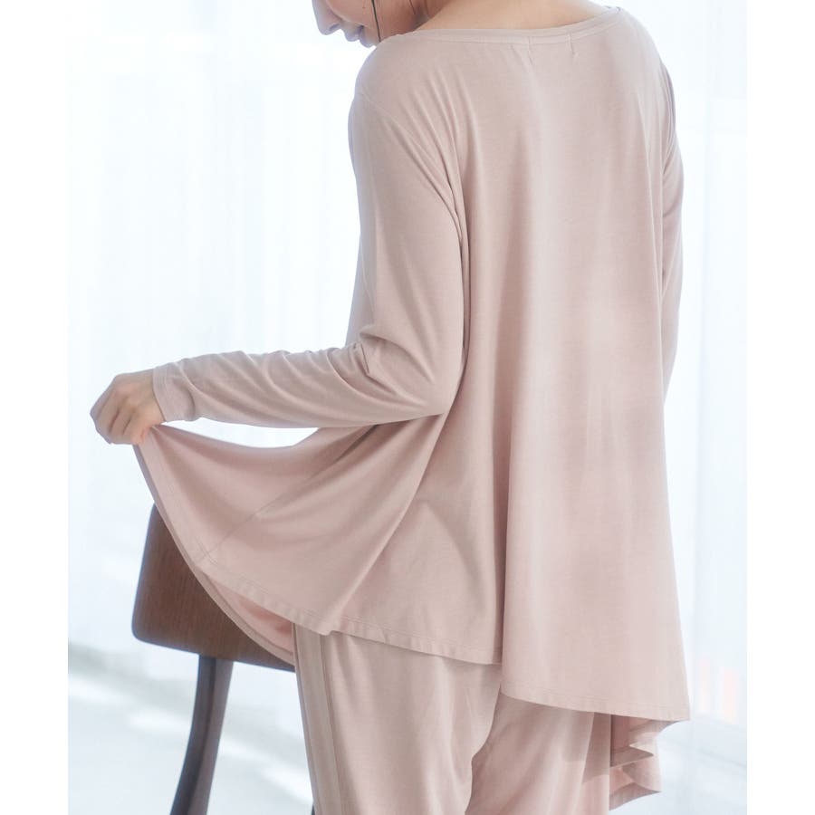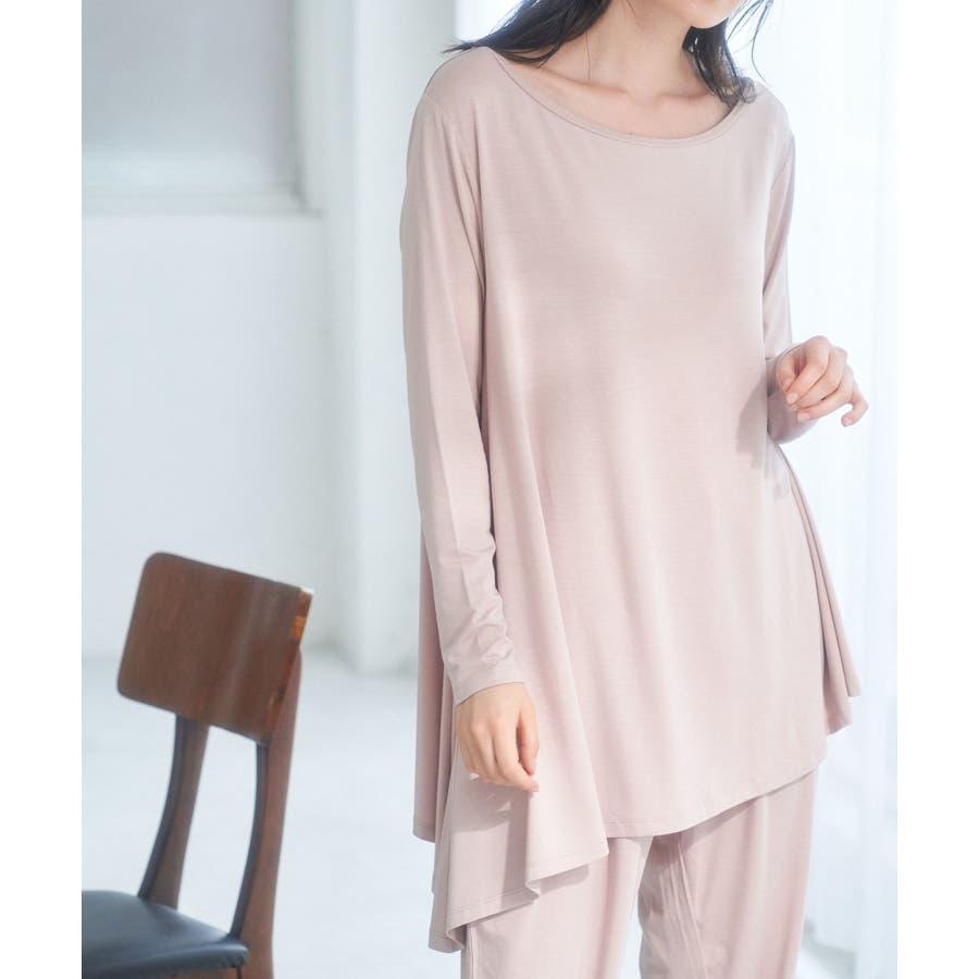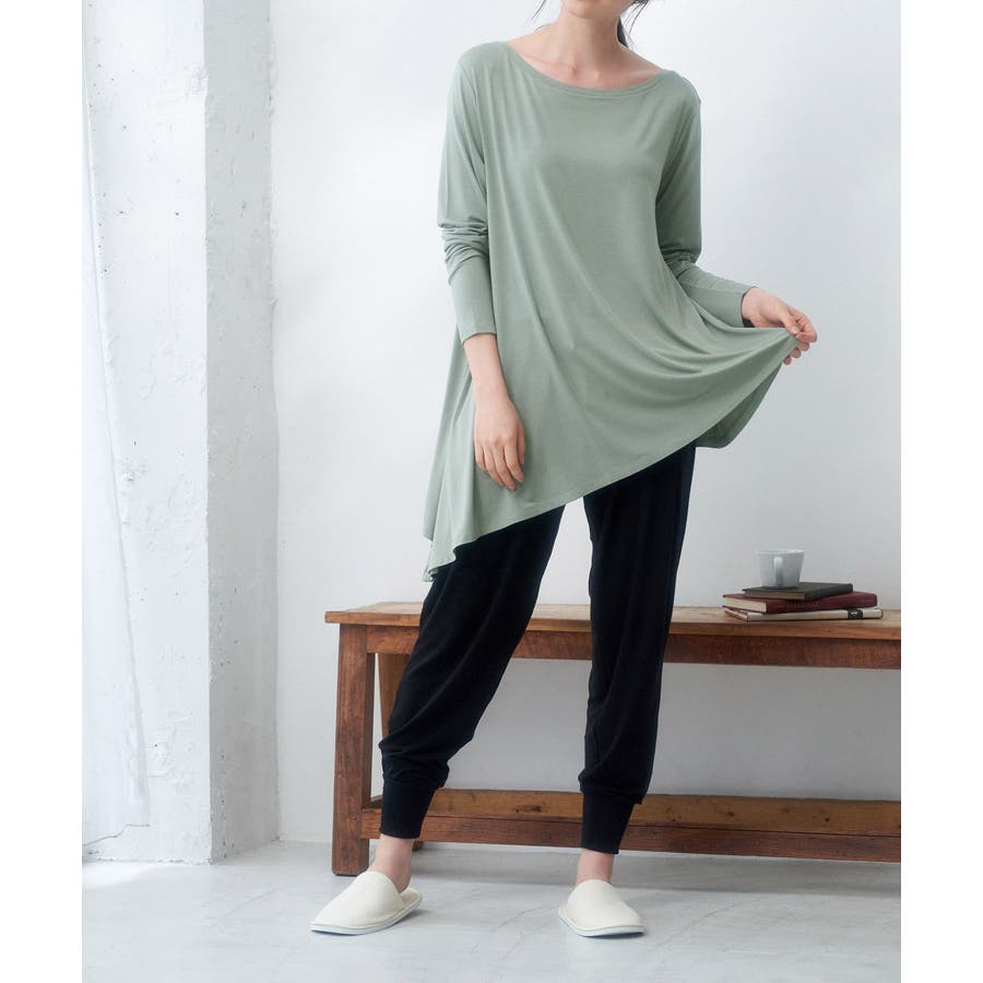 【素材感】 ・薄手のテロンとした素材で肌触り◎ ・伸縮性があり、ストレスフリーな着心地で部屋着はもちろんワンマイルウェアにおすすめ。 【デザイン・シルエット】 ・裾に生まれるドレープ感が魅力的な、アシンメトリーヘムのフレアトップス。 ・豊かに広がるシルエットで、お腹まわりがカバーできるデザイン。 【カラー】 ・ブラック、オリーブ、ピンクの3色展開。 【スタイリングポイント】 ・裾をラフにロールアップしたジーンズなど、カジュアルボトムにマッチ。 ・ベーシックなクルーネックカーディガンを重ねたレイヤードもおすすめ。 ・同素材でフレンチスリーブ(品番:GDM51930)もございます。 ・同素材のパンツ(品番:GDS51920)と合わせてセットアップスタイルもおすすめ。 ----------------------------- 裏地:なし 透け感:ブラック(01)オリーブ(37)はなし、ピンク系(65)はややあり 伸縮性:あり 生地感・厚さ:薄手 季節:春~秋 ----------------------------- ※撮影時の光、お使いのモニター環境によって色の見え方が違う場合がございます。 : □■着用レビュー■□ 〈スタッフA〉 身長:151cm 普段の着用サイズ:36(S) 着用サイズ:38 サイズ感:ネックラインが横に広く、肌見えします。袖は長くフィット感があるので、くしゅくしゅっと着れます。 素材感:とても伸びが良い素材です。薄手でとても柔らかかったです。 着心地:肌触りがとても良く、とてもリラックスして着られました。 おすすめコーデ:ワンマイルウェアにおすすめです。チュニック丈なので、きれいめの細身パンツがバランスが良いです。