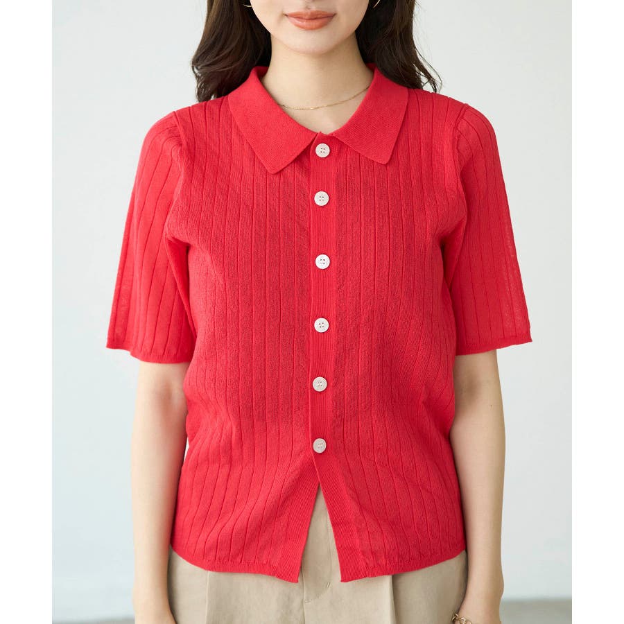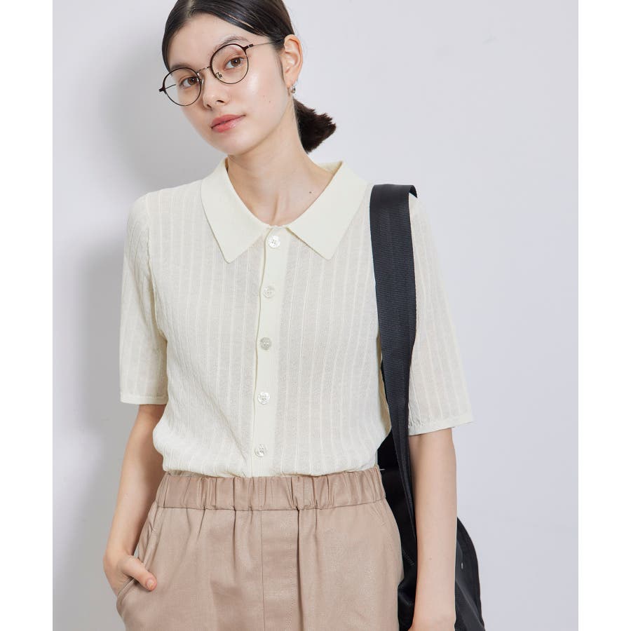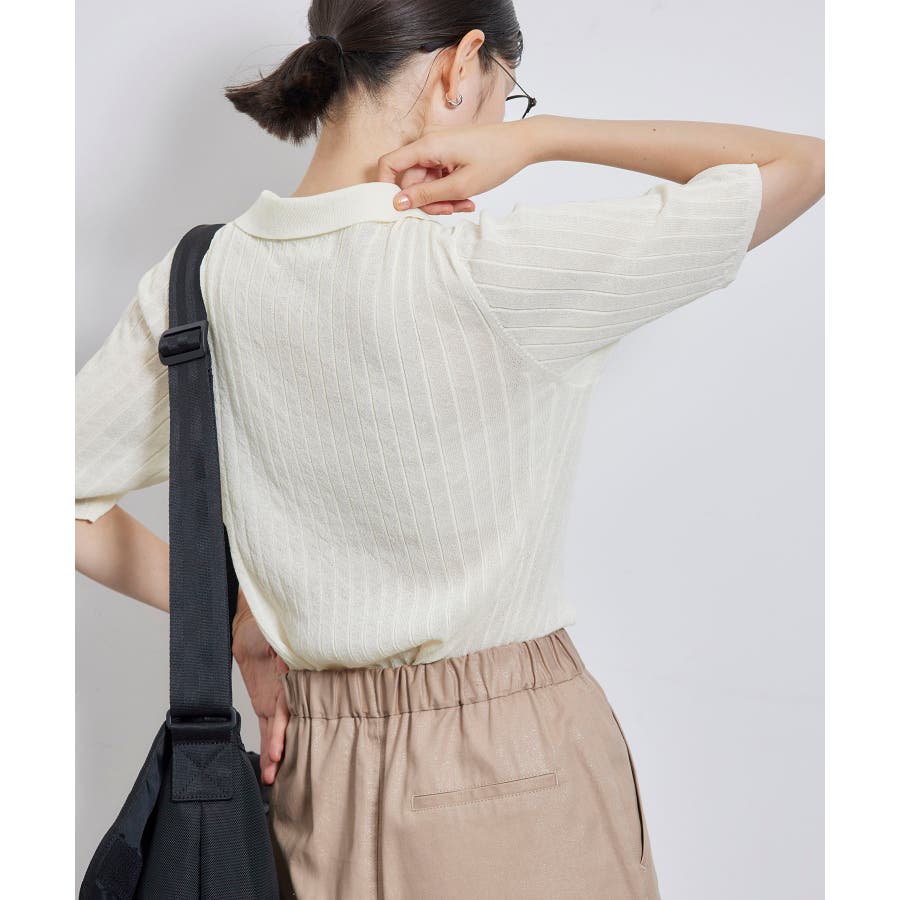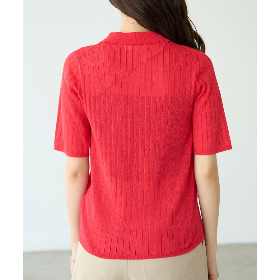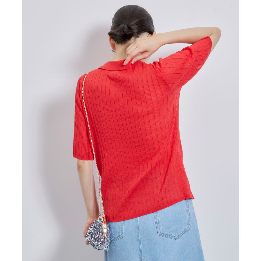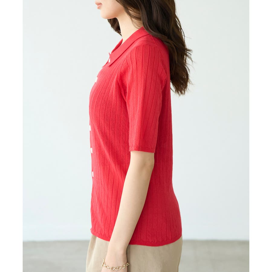 【素材感】 ・梨地見えする表面のシアーポロニット。 【デザイン・シルエット】 ・レトロシックな、ハーフスリーブのポロニットプルオーバー。 ・コンパクトなシルエットですっきり着こなせる一枚。 ・前ボタンを閉めて着用した際に、ヒップに沿って広がる裾がポイント。 【カラー】 ・カラーによって柄が異なります。 オフホワイト(15)レッド(60):無地 キナリ系(17):ボーダー 【スタイリングポイント】 ・レッドはインディゴジーンズと相性抜群。 ・柄物スカートを合わせると華やかに。 ・キュロットパンツ合わせもクラシカルで一押し。 ----------------------------- 裏地:なし 透け感:ややあり 伸縮性:あり 生地感・厚さ:やや薄手 ポケット:なし 季節:春~秋 ----------------------------- ※撮影時の光、お使いのモニター環境によって色の見え方が違う場合がございます。 ※モデル身長:166cm 着用サイズ:38/165cm 着用サイズ:38