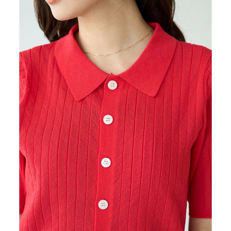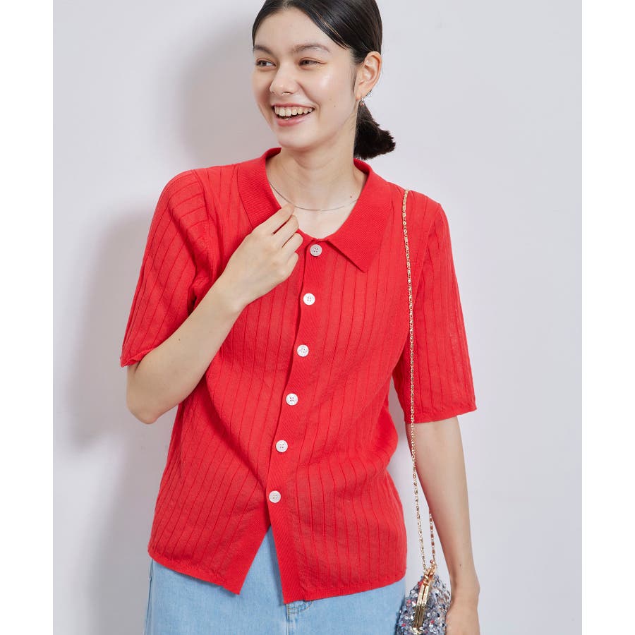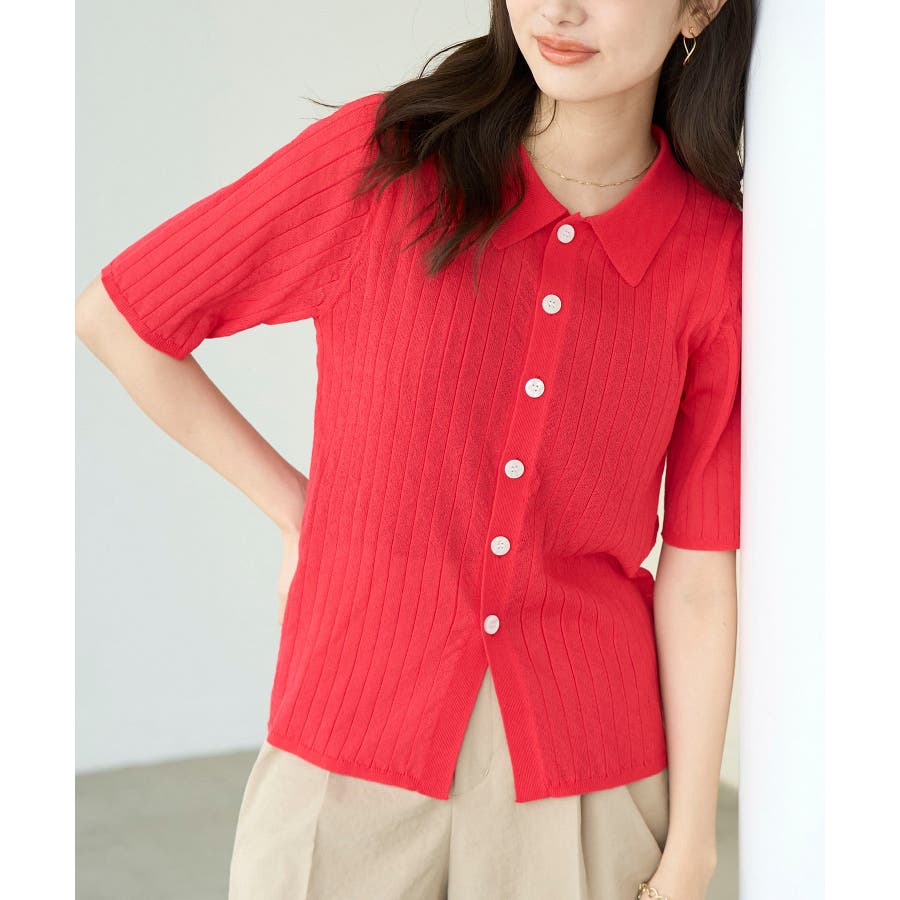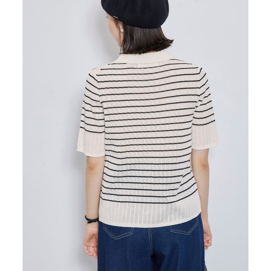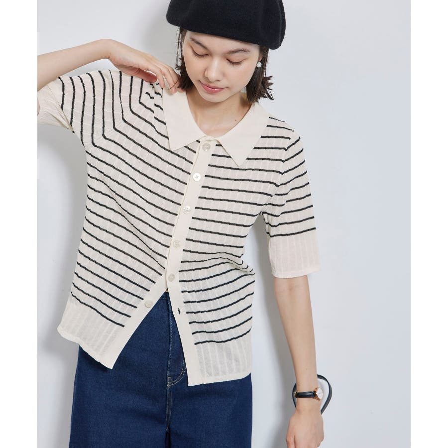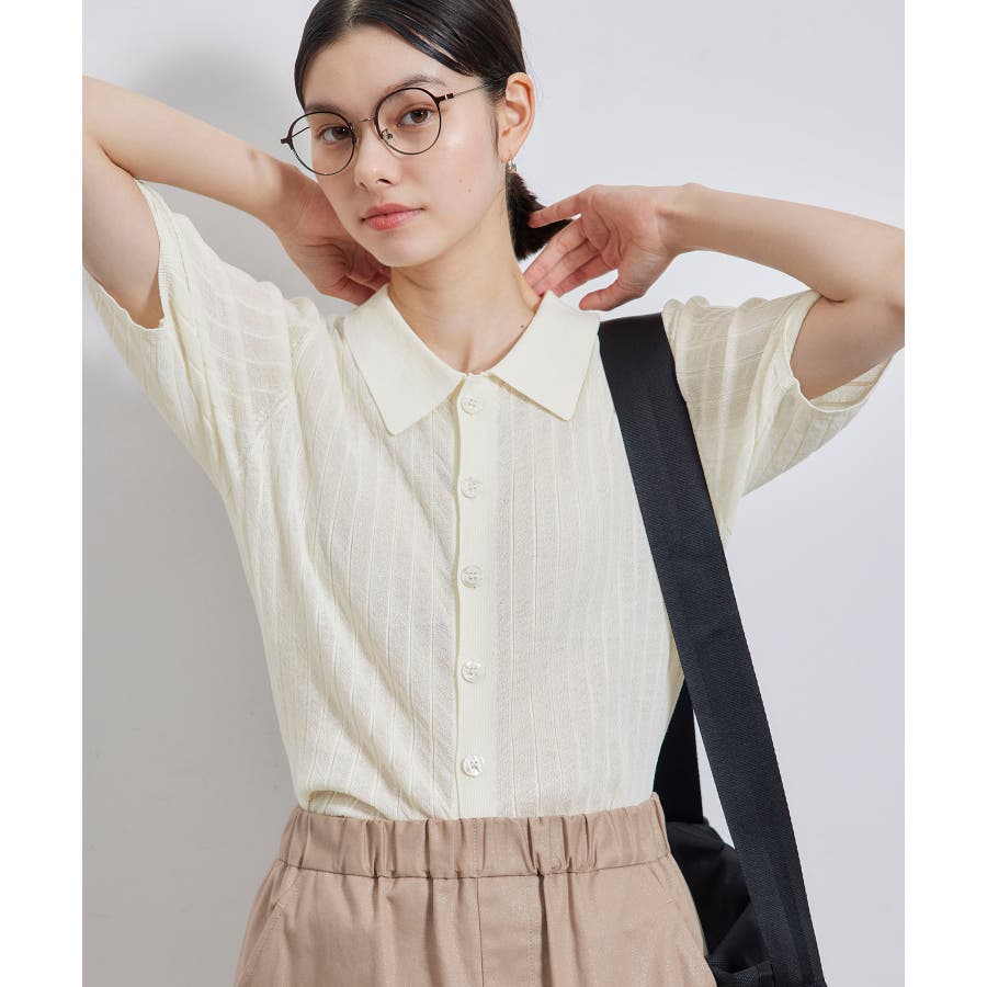 【素材感】 ・梨地見えする表面のシアーポロニット。 【デザイン・シルエット】 ・レトロシックな、ハーフスリーブのポロニットプルオーバー。 ・コンパクトなシルエットですっきり着こなせる一枚。 ・前ボタンを閉めて着用した際に、ヒップに沿って広がる裾がポイント。 【カラー】 ・カラーによって柄が異なります。 オフホワイト(15)レッド(60):無地 キナリ系(17):ボーダー 【スタイリングポイント】 ・レッドはインディゴジーンズと相性抜群。 ・柄物スカートを合わせると華やかに。 ・キュロットパンツ合わせもクラシカルで一押し。 ----------------------------- 裏地:なし 透け感:ややあり 伸縮性:あり 生地感・厚さ:やや薄手 ポケット:なし 季節:春~秋 ----------------------------- ※撮影時の光、お使いのモニター環境によって色の見え方が違う場合がございます。 ※モデル身長:166cm 着用サイズ:38/165cm 着用サイズ:38