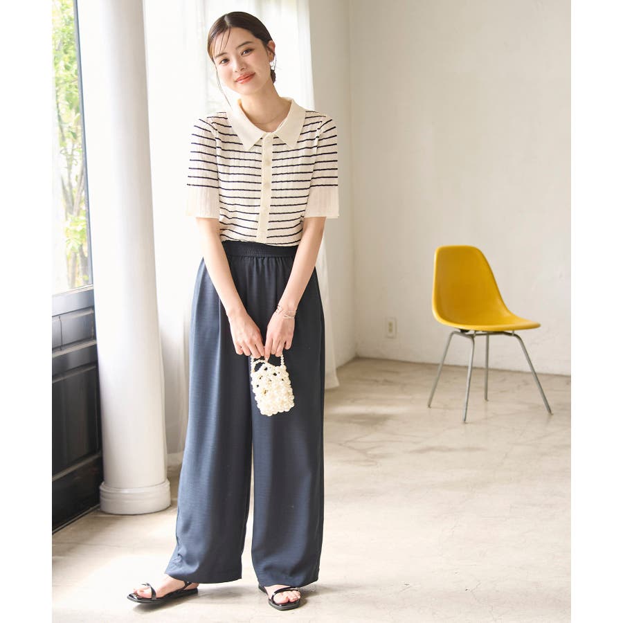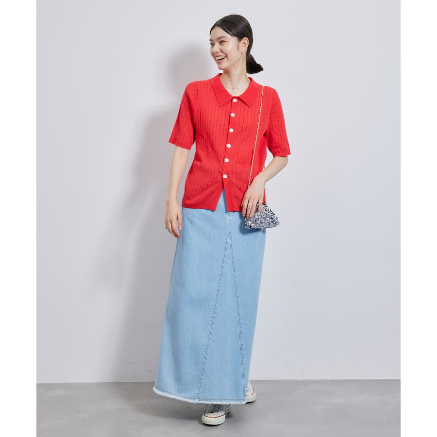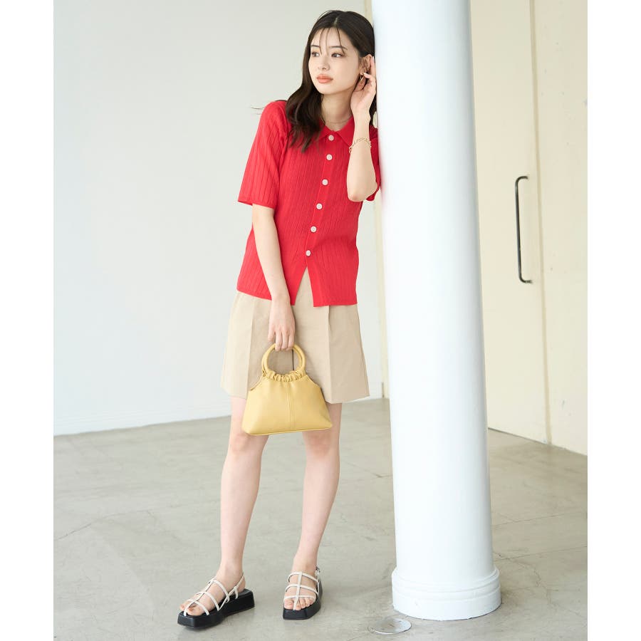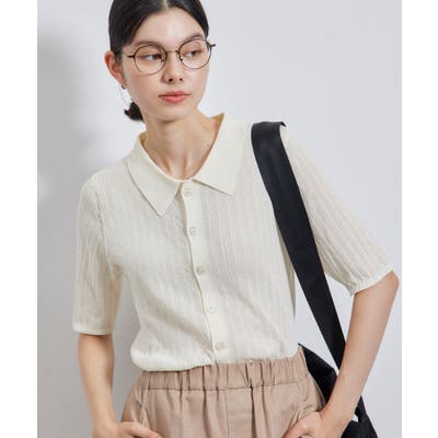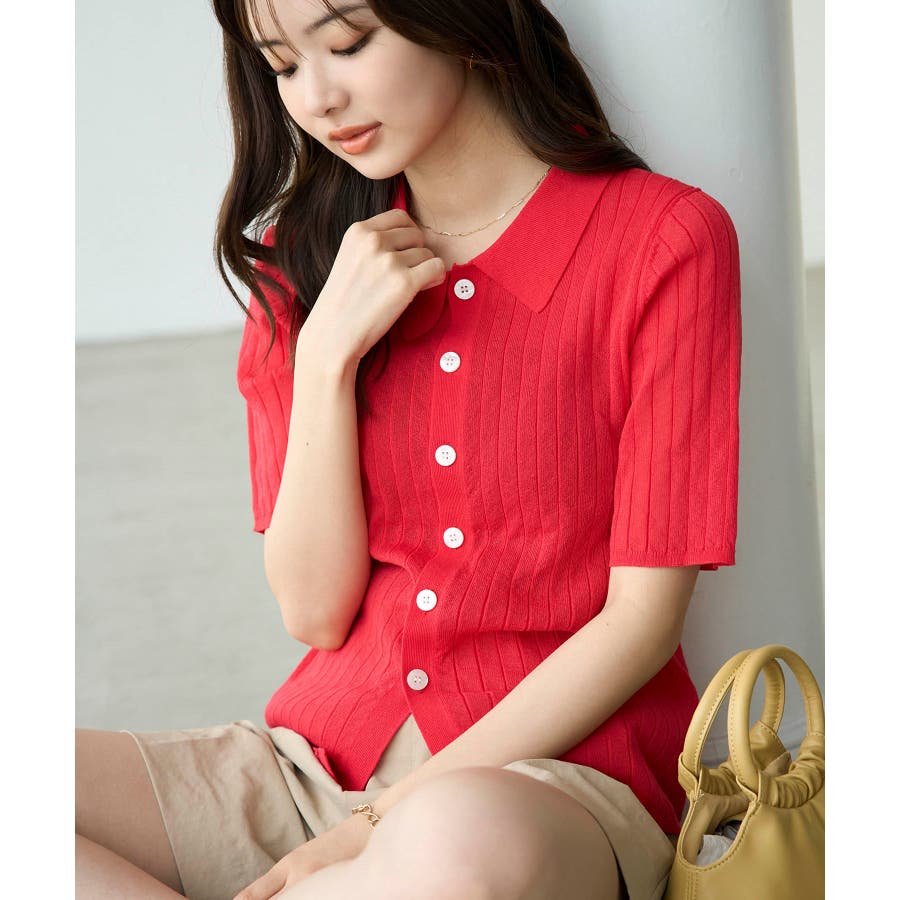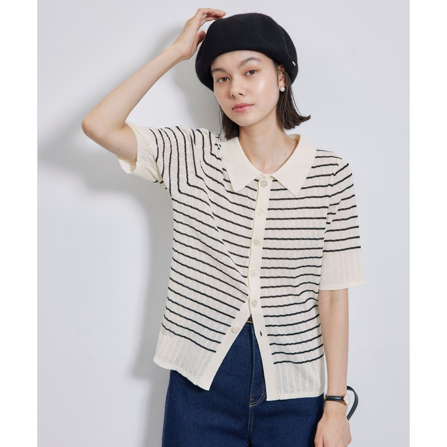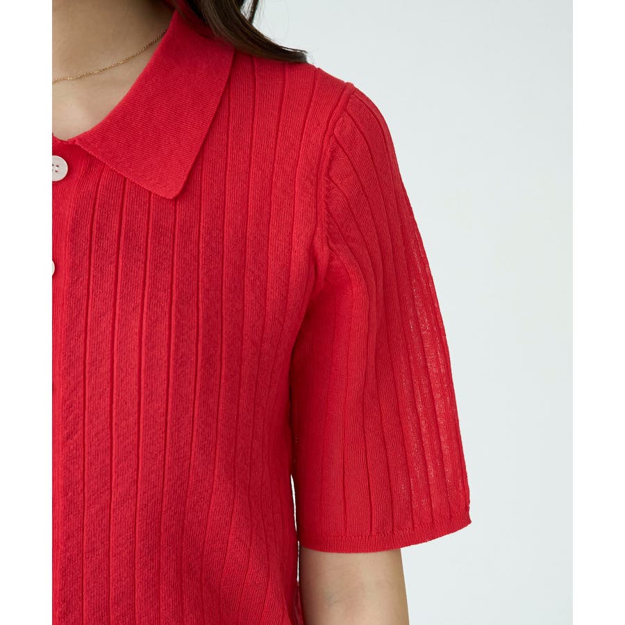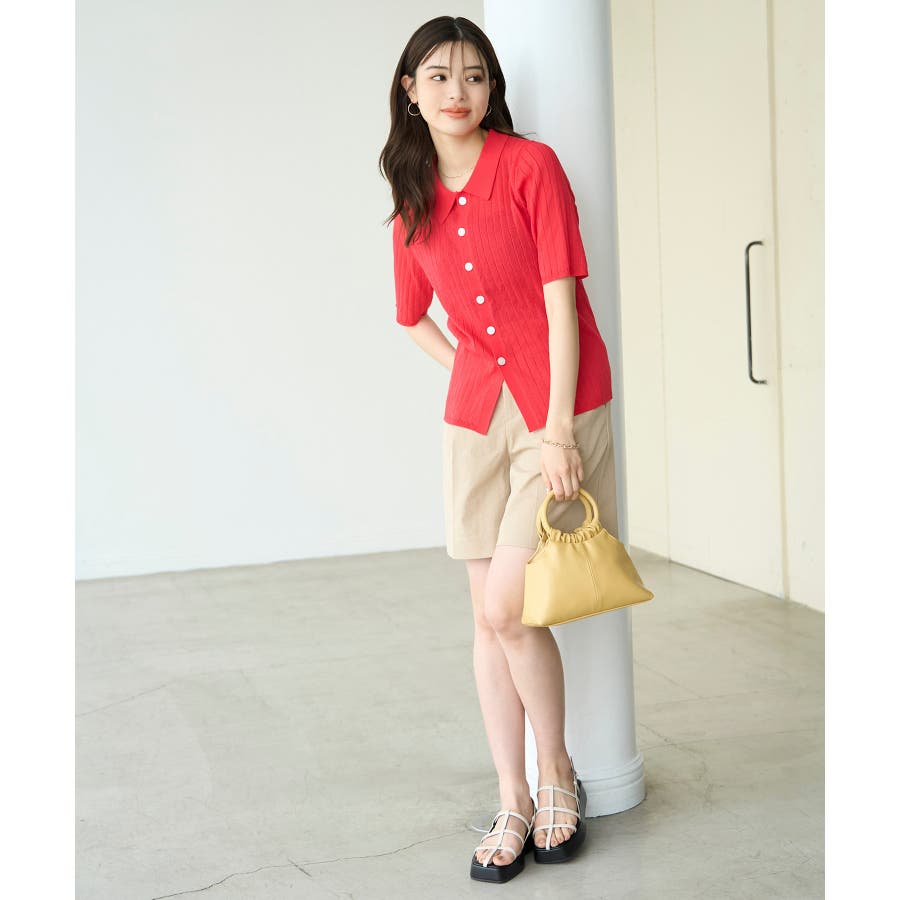 【素材感】 ・梨地見えする表面のシアーポロニット。 【デザイン・シルエット】 ・レトロシックな、ハーフスリーブのポロニットプルオーバー。 ・コンパクトなシルエットですっきり着こなせる一枚。 ・前ボタンを閉めて着用した際に、ヒップに沿って広がる裾がポイント。 【カラー】 ・カラーによって柄が異なります。 オフホワイト(15)レッド(60):無地 キナリ系(17):ボーダー 【スタイリングポイント】 ・レッドはインディゴジーンズと相性抜群。 ・柄物スカートを合わせると華やかに。 ・キュロットパンツ合わせもクラシカルで一押し。 ----------------------------- 裏地:なし 透け感:ややあり 伸縮性:あり 生地感・厚さ:やや薄手 ポケット:なし 季節:春~秋 ----------------------------- ※撮影時の光、お使いのモニター環境によって色の見え方が違う場合がございます。 ※モデル身長:166cm 着用サイズ:38/165cm 着用サイズ:38