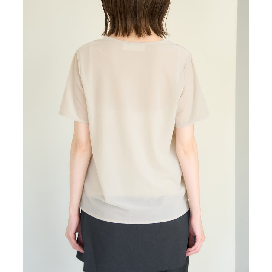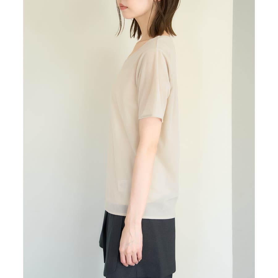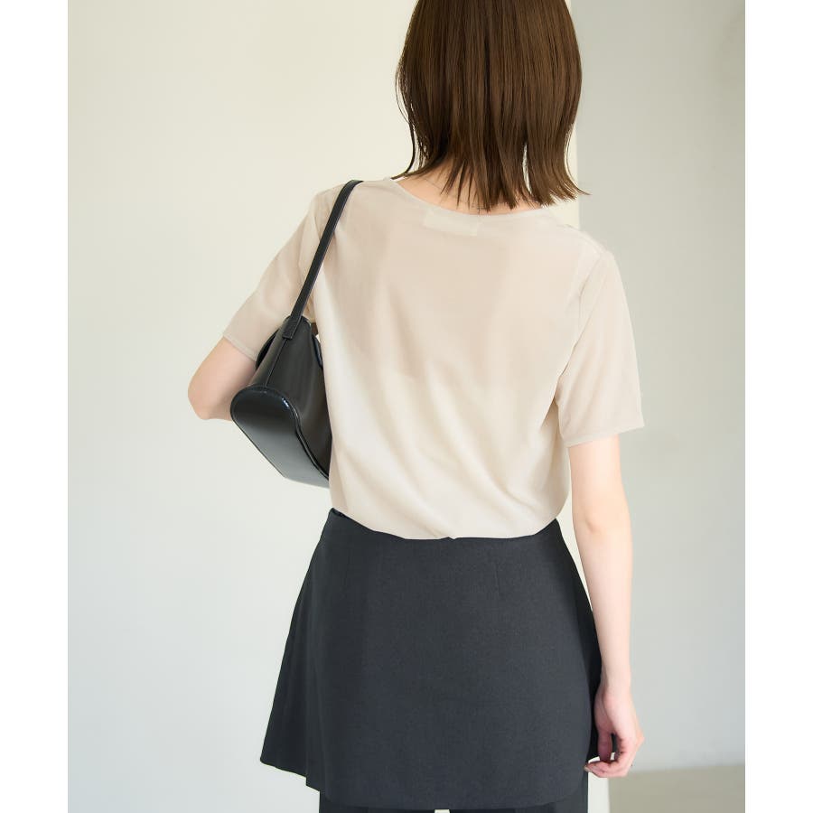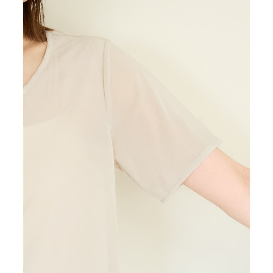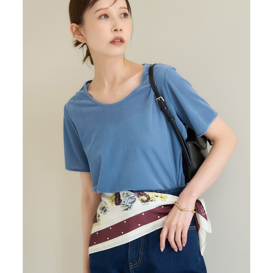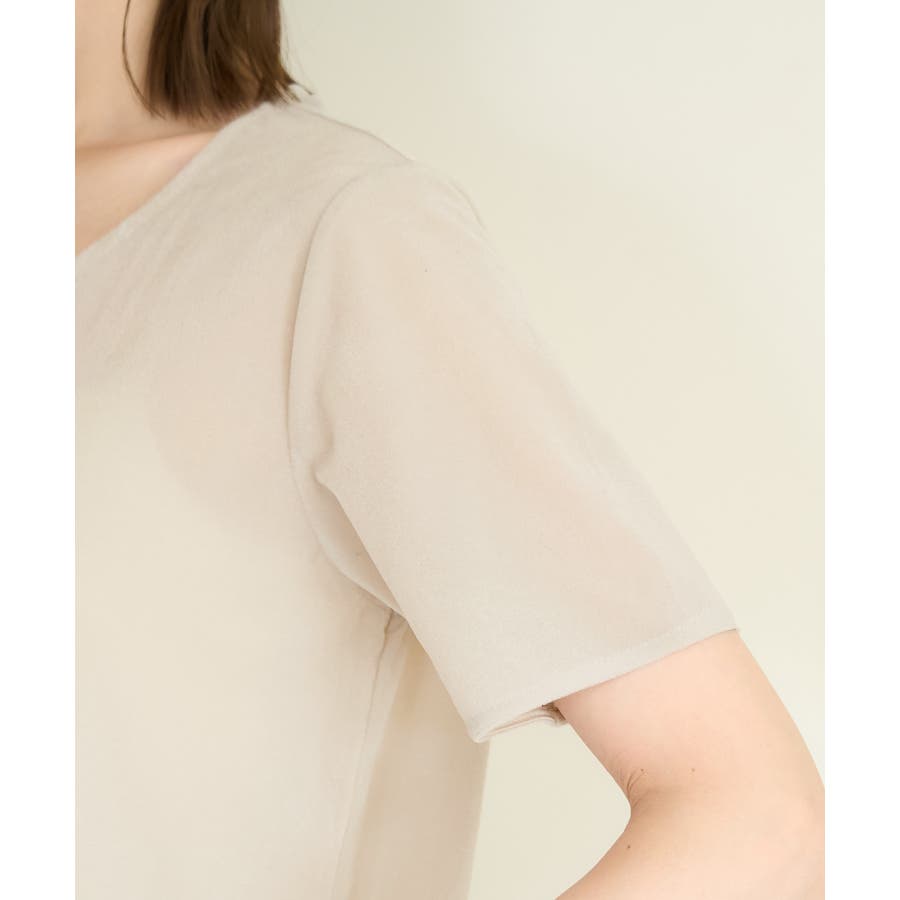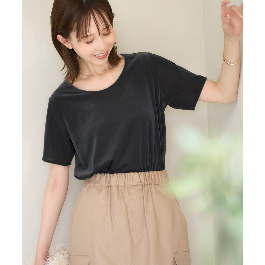 【素材感】 ・シアーベロア素材を使用。 【デザイン・シルエット】 ・自然なラウンドネックのハーフスリーブプルオーバー。 ・シルエットはすっきりとしていて、もたつきがない。 ・同シリーズでノースリーブ(品番:GDM54280)も展開。 【カラー】 ・チャコールグレー、ベージュ、ブルーの3色展開。 【スタイリングポイント】 ・チャコールグレーやブルーは明るめのボトムに合わせるとメリハリが出せる。 ・ベージュは薄めのブルーデニムと好相性。 ・ジャケットやブルゾンにも重ねやすい。 ・ネックレスやスカーフで華やかにしても◎。 ----------------------------- 裏地:なし 透け感:ややあり 伸縮性:ややあり 生地感・厚さ:普通 季節:夏・秋(羽織りをプラスして) ----------------------------- ※撮影時の光、お使いのモニター環境によって色の見え方が違う場合がございます。 ※モデル身長:165cm 着用サイズ:38