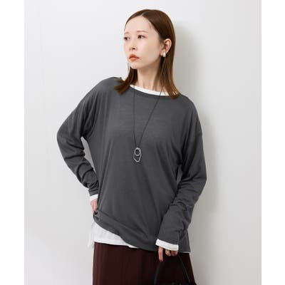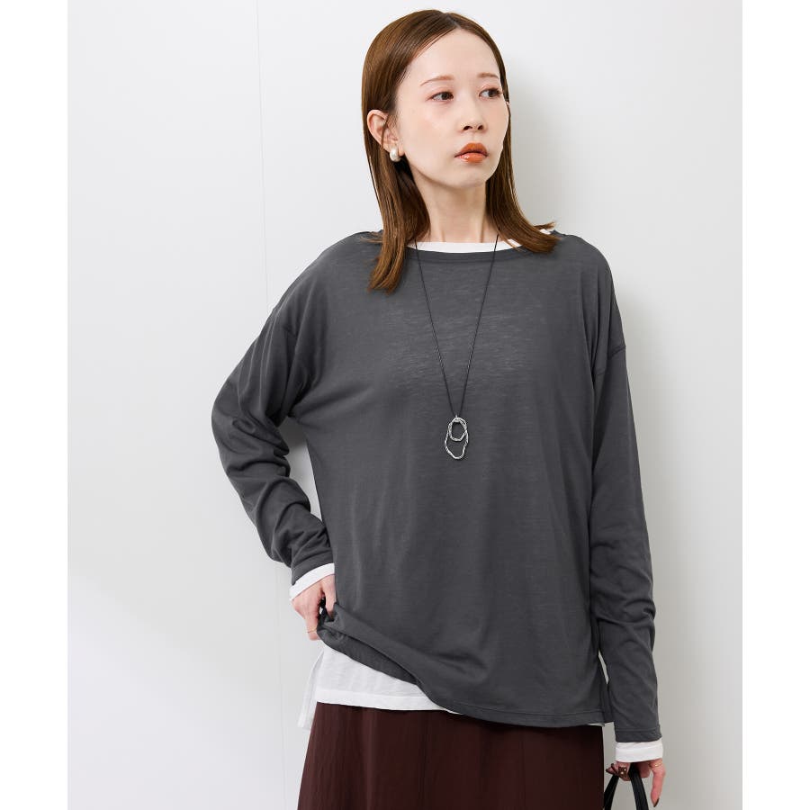 ・横に広く開いたボートネック風のデザインで、首元からデコルテラインがきれい見え&女性らしい抜け感をプラス。