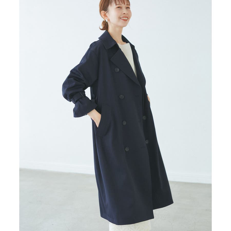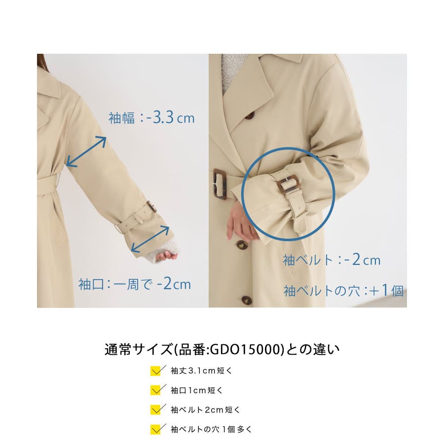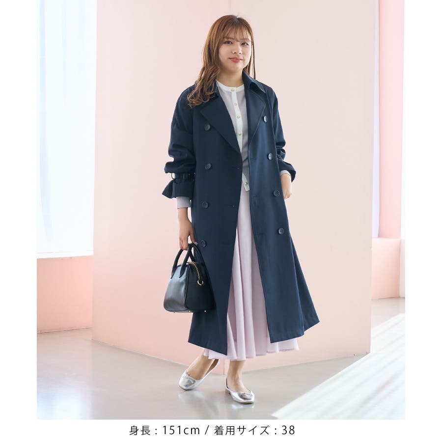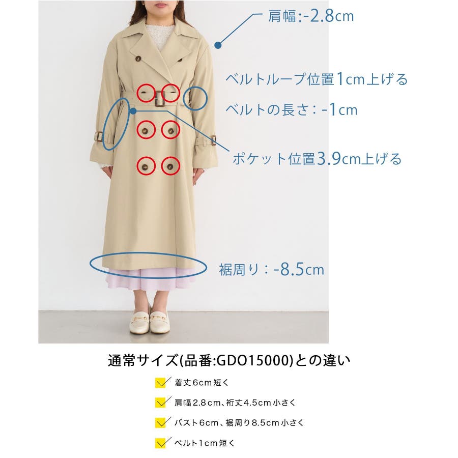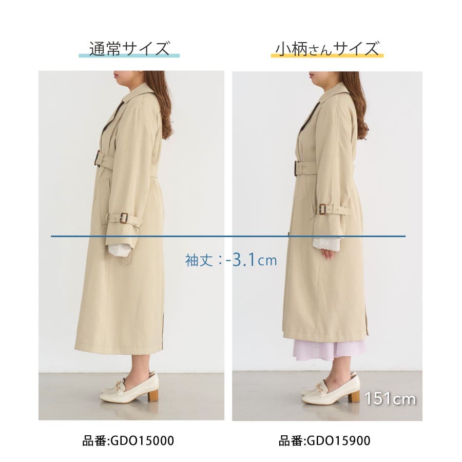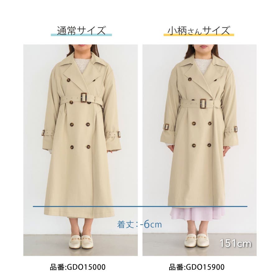 皆様の声で生まれた!小柄さん向けトレンチコートが登場! : 【素材感】 ・気温の変動などで変わりつつある季節感にも対応できて、長く着られるように軽めの素材を採用。 ・柔らかい素材感を活かして、小柄さんでも着られている感がでないシルエット。 ・花粉ガード、撥水加工を施した機能素材。 【デザイン・シルエット】 ・人気の小柄さん、低身長さん向けシリーズ。 ・低身長でもバランス良く着られる着丈にこだわったトレンチコート。 ・袖口のベルトのみで、合わせやすくすっきりデザイン。 ・手の入れやすい角度のフロントポケット付き。 ・レギュラーサイズの(品番:GDO15000)も展開。 【カラー】 ・ベージュ、ネイビーのベーシックカラー2色展開。 【スタイリングポイント】 ・きれいめな通勤着の羽織にぴったり。 ・フーディーやジーンズのスタイルに羽織って休日仕様にも。 ・ロングスカート合わせもモダンなバランスでおすすめ。 ・レギュラー丈(品番:GDO15000)をベースに、小柄さん向けに寸法を修正しつつ、全体のデザインバランスは崩さないようボタンやフロントの重ね、ウエストベルトのループ位置の調整を行いました。 ・袖口のベルトのホールをレギュラー丈(品番:GDO15000)よりも1つ多く開け、手首が華奢な方でもしっかりと止まりボリューム感が出るよう変更。 ----------------------------- 裏地:あり 透け感:なし 伸縮性:なし 生地感・厚さ:普通 ポケット:あり その他仕様:取り外し可能な共布ベルト付き 季節:春・秋 ----------------------------- ※撮影時の光、お使いのモニター環境によって色の見え方が違う場合がございます。 ※スタッフ身長:148cm 着用サイズ:38