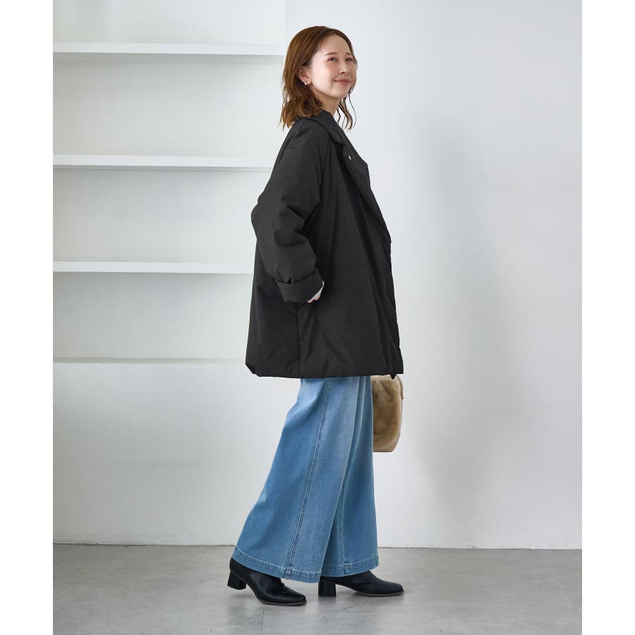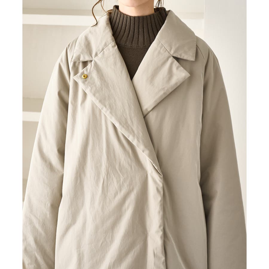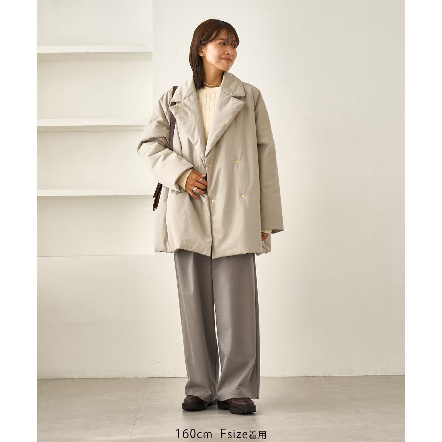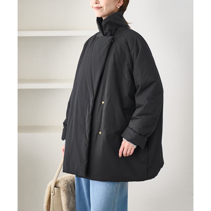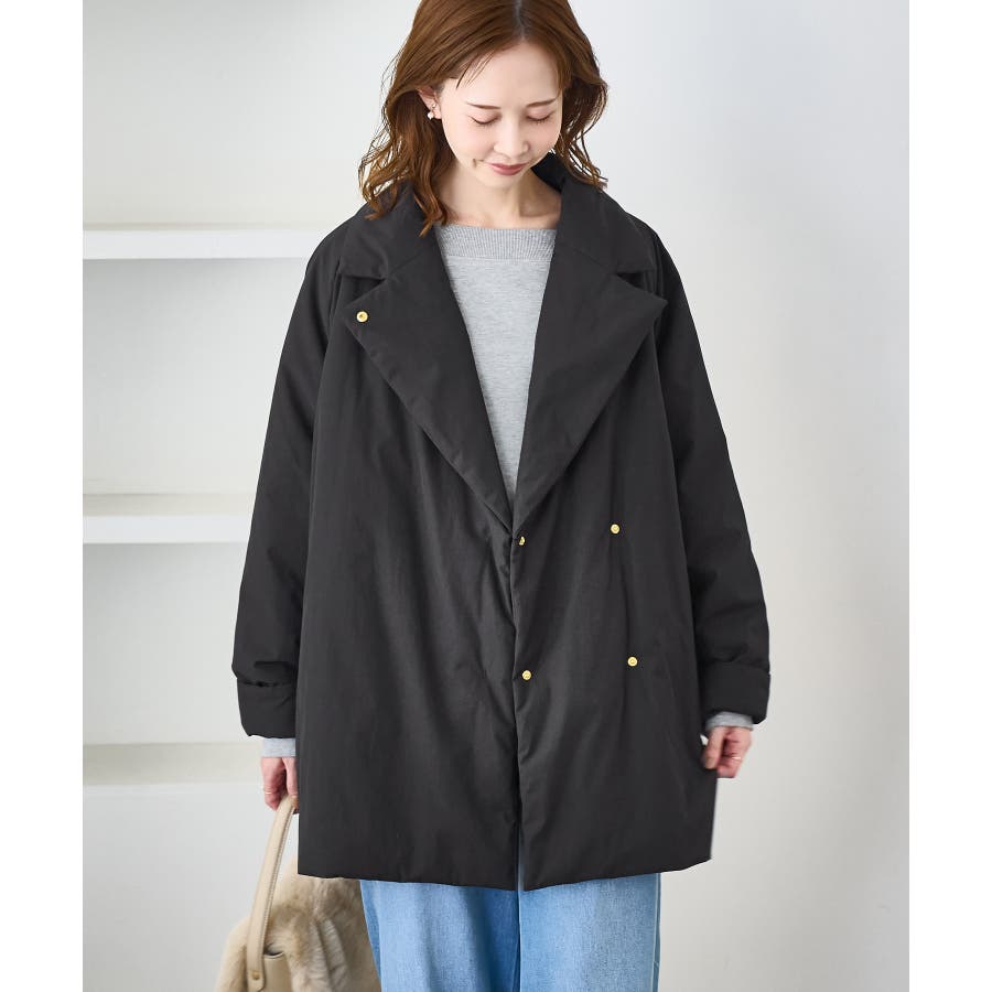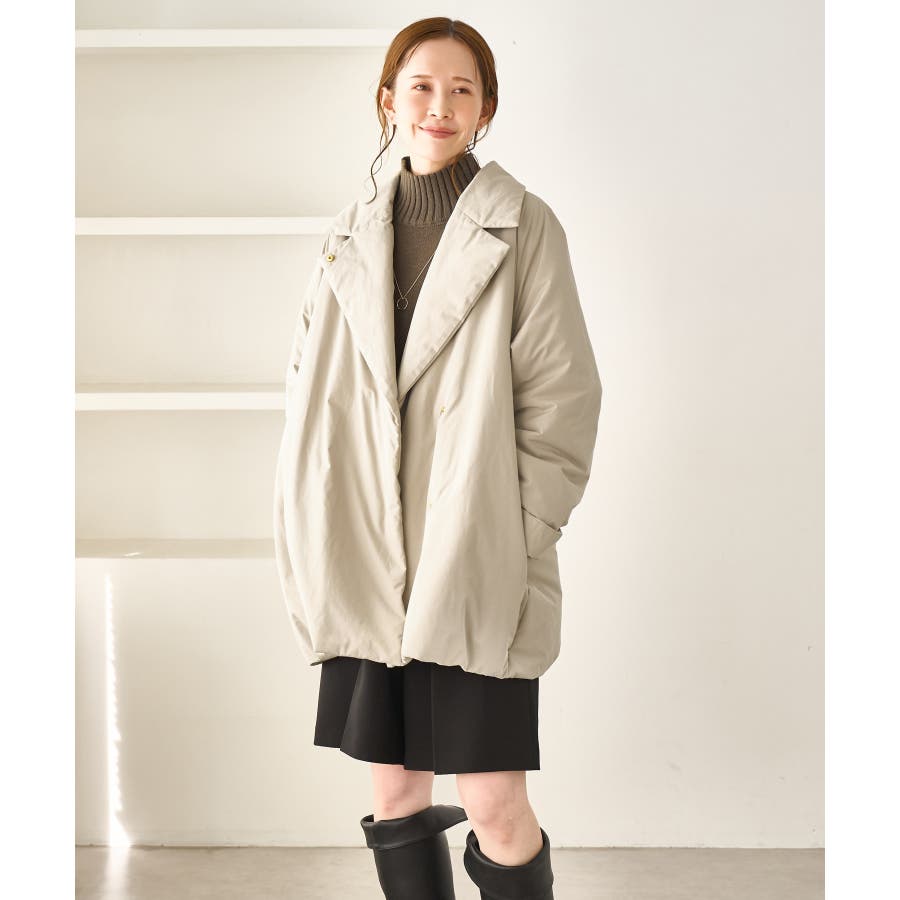 ・フロントのドットボタンの開閉でテーラードデザイン、上衿を立てるとスタンドデザインに。着こなしに変化を与える中綿アウター。