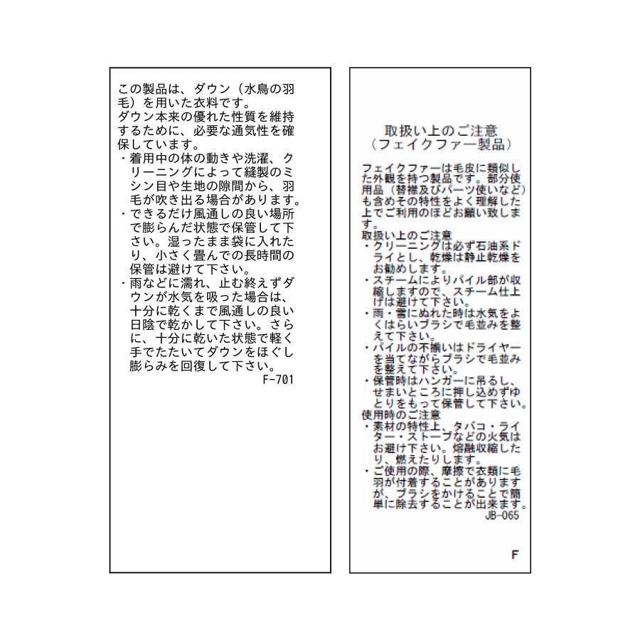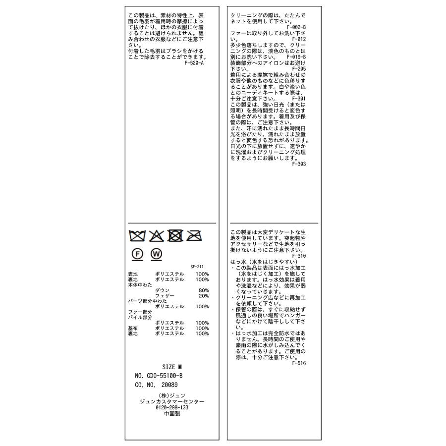 | 素材 | (表地) ポリエステル 100% (裏地) ポリエステル 100% (本体中わた) ダウン 80% フェザー 20% (パーツ部分中わた) ポリエステル 100% (ファー部分) (パイル部分) ポリエステル 100% (基布) ポリエステル 100% (裏地) ポリエステル 100% |