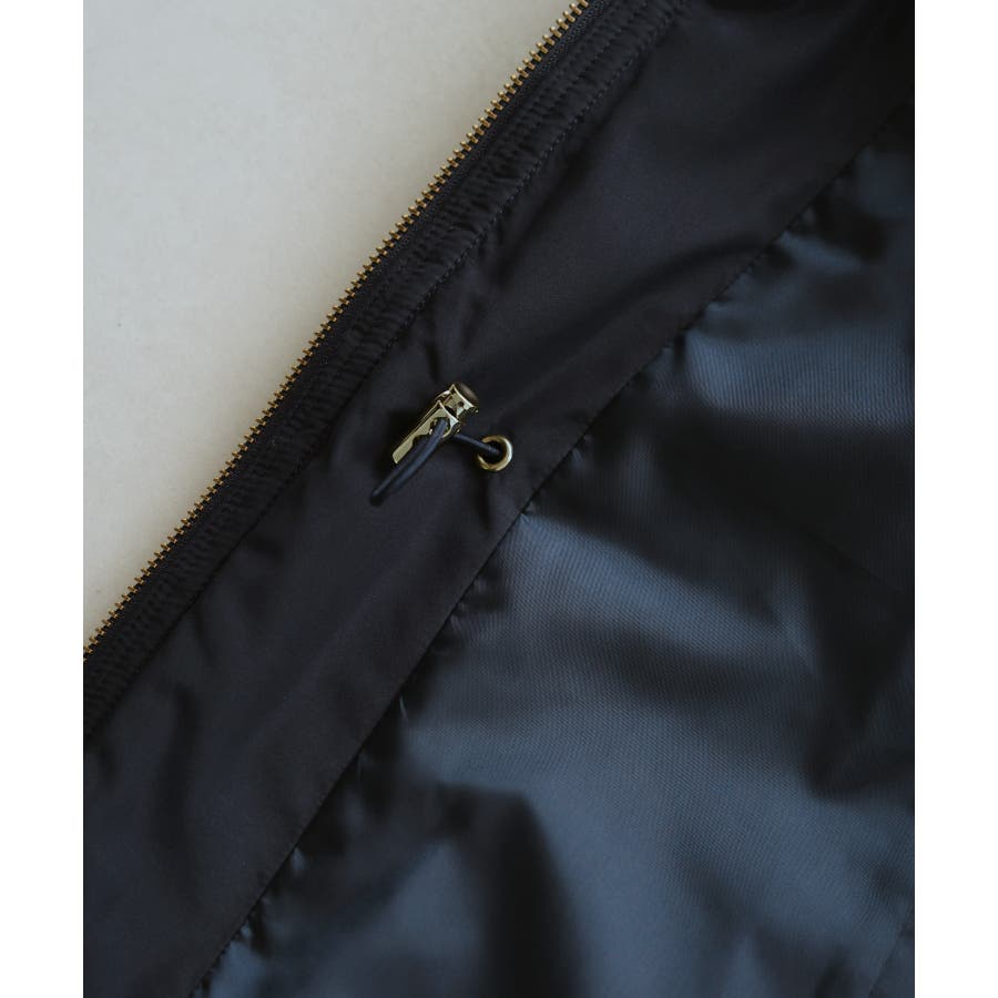 ・風を遮るスタンドネックと、顔まわりを華やかにするメタルボタンがポイント。