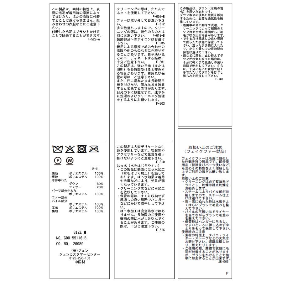 | 素材 | (表地) ポリエステル 100% (裏地) ポリエステル 100% (本体中わた) ダウン 80% フェザー 20% (パーツ部分中わた) ポリエステル 100% (ファー部分) (パイル部分) ポリエステル 100% (基布) ポリエステル 100% (裏地) ポリエステル 100% |