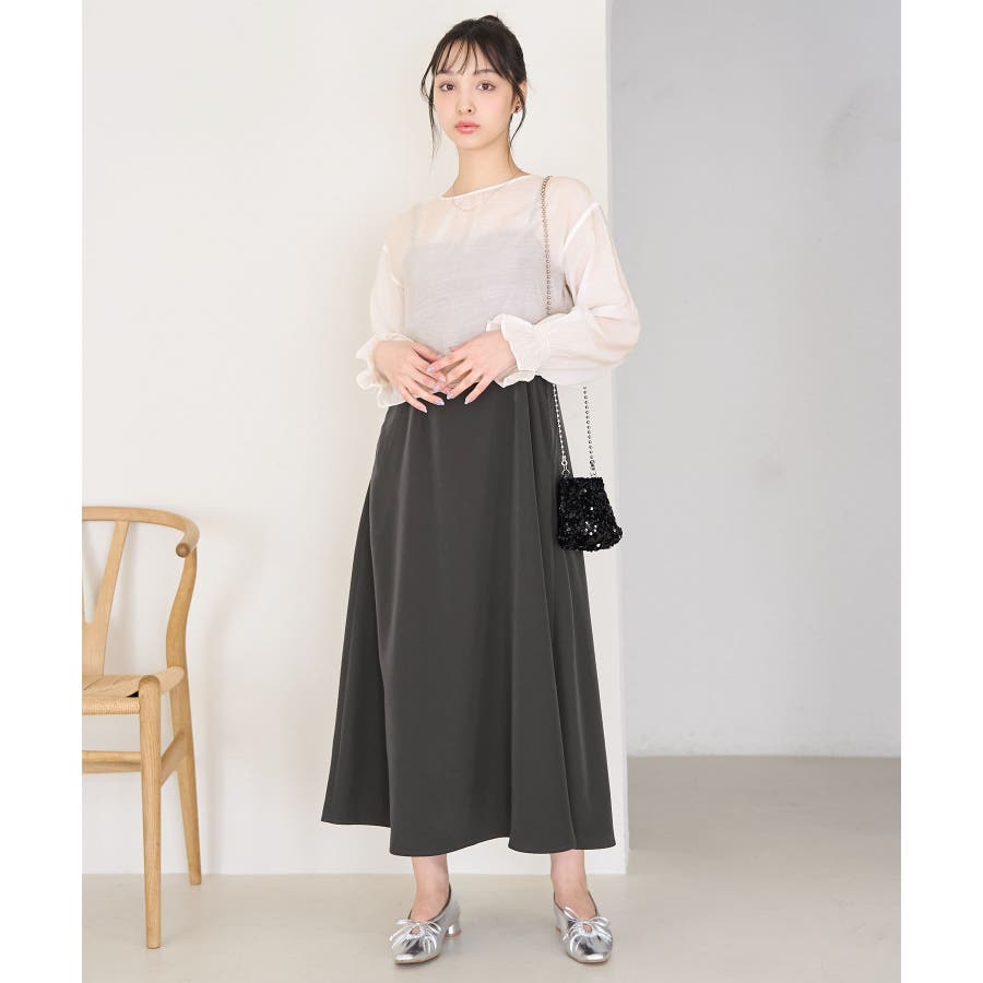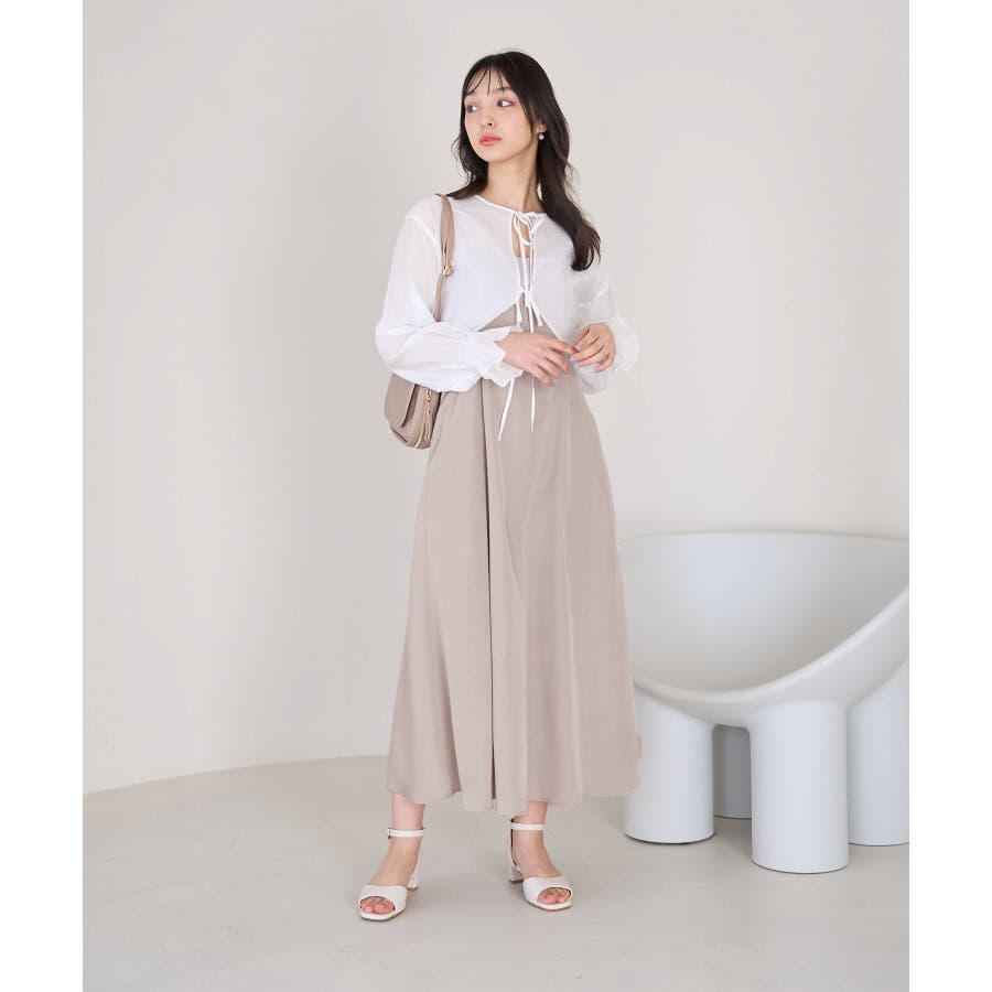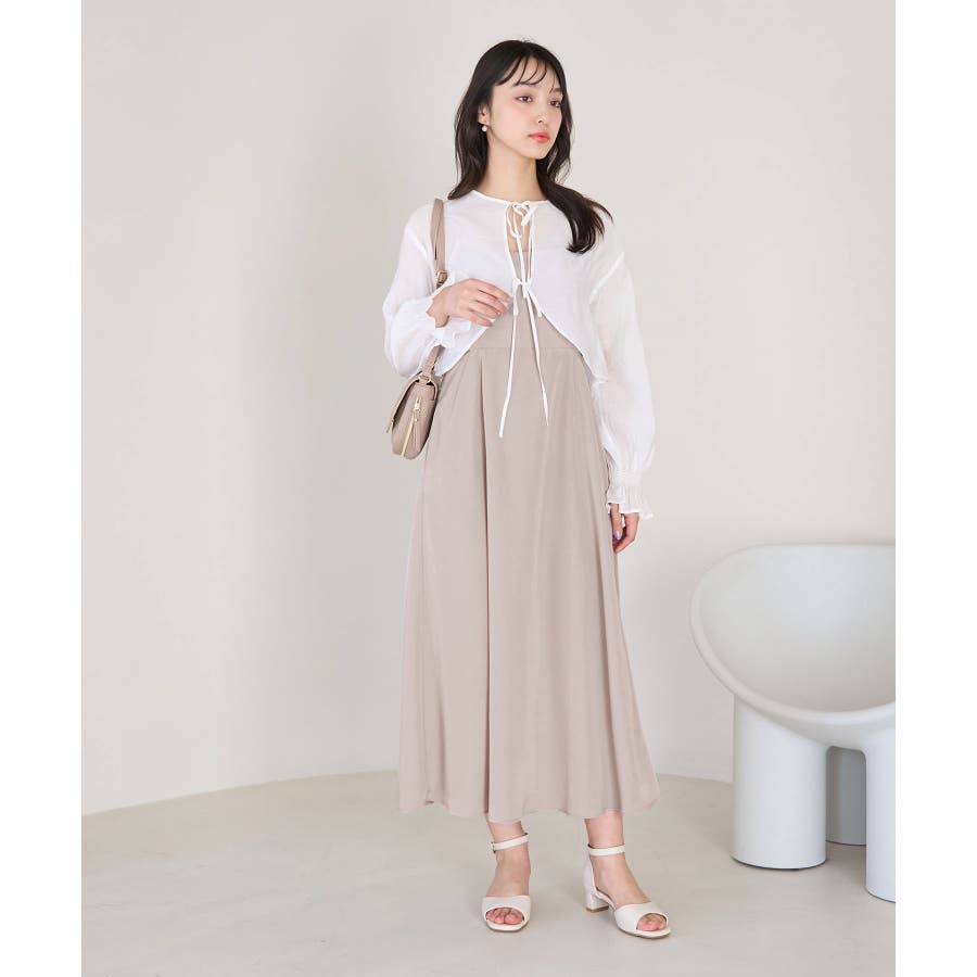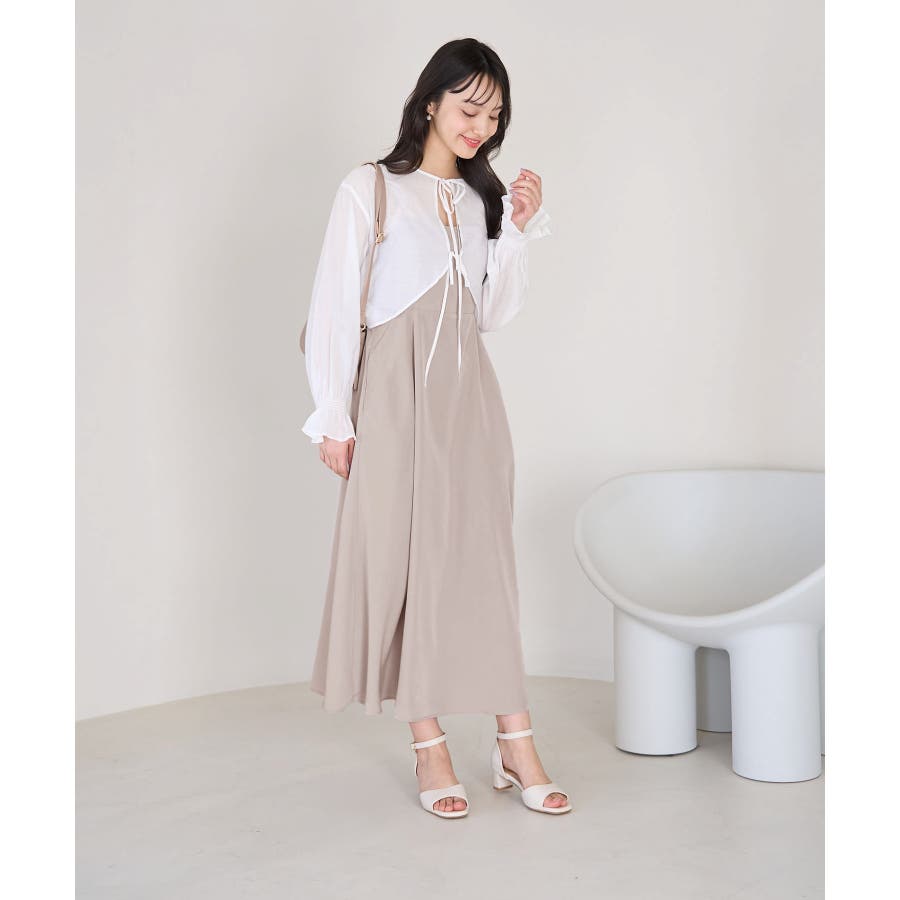 【デザイン・シルエット】 ・おしゃれなレイヤードを楽しめる、長袖ブラウスとキャミソールドレスのセットアイテム。 ・ブラウスは透け感を楽しめるシアー素材で、ギュッと袖口を絞ったキャンディスリーブがスウィート。 ・キャミソールドレスはストラップアジャスタブル仕様で、トップは後ろ側がギャザー使い。 ・ブラウスは前後2WAYで着用可能。 【カラー】 ・チャコール(06):ライトベージュブラウス×チャコールワンピース ・ベージュ系(28):オフホワイトブラウス×ベージュワンピース 【スタイリングポイント】 ・それぞれ単品でも着回し可能。 ・寒い日には、ブラウスを薄手のタートルネックプルオーバーと重ねて。 ・キャミソールドレスは、インナーにTシャツを重ねてもOK。 ----------------------------- 裏地:ブラウスはなし、ワンピースはあり 透け感:ブラウスはあり、ワンピースはなし 伸縮性:なし 生地感・厚さ:ブラウスは薄手、ワンピースは普通 ポケット:ブラウスはなし、ワンピースはあり その他仕様:ブラウスは袖口ゴム、ワンピースは後ろファスナーあり 季節:春・夏 ----------------------------- ※撮影時の光、お使いのモニター環境によって色の見え方が違う場合がございます。 ※モデル身長:163cm 着用サイズ:38