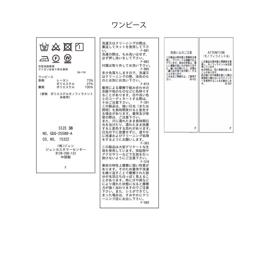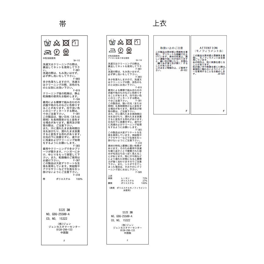 | 素材 | (上衣) (表側) レーヨン 73% ポリエステル 27% (裏側) ポリエステル 100% (ワンピース) (表側) レーヨン 73% ポリエステル 27% (裏側) ポリエステル 100% (帯) ポリエステル 100% |