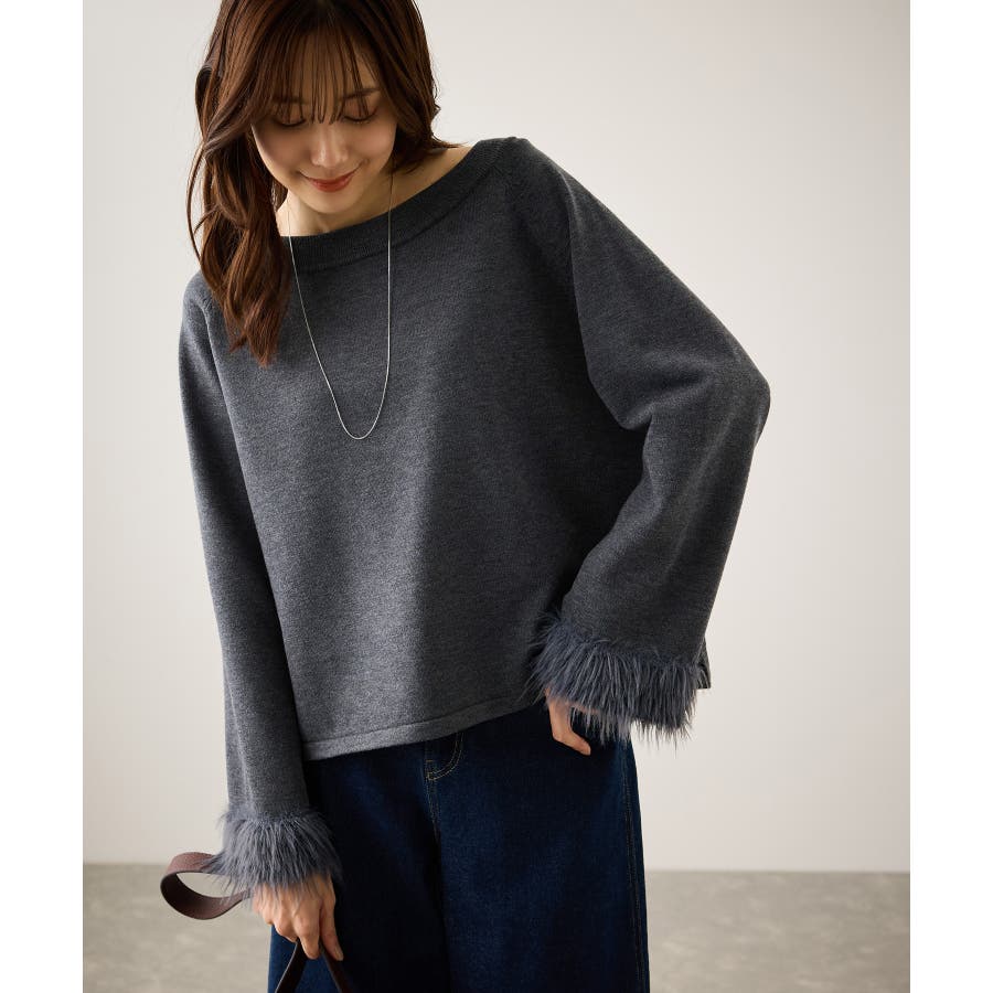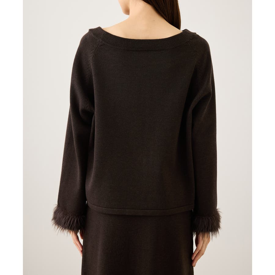 ・しっかりと肉感のあるダブルジャカードの編み地をベースに袖口にはポイントとなるファーライクなフェザーヤーンを使用。