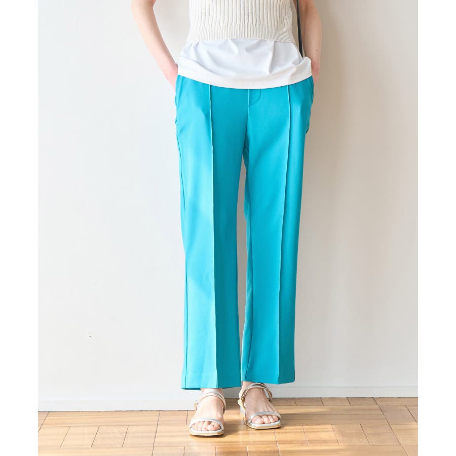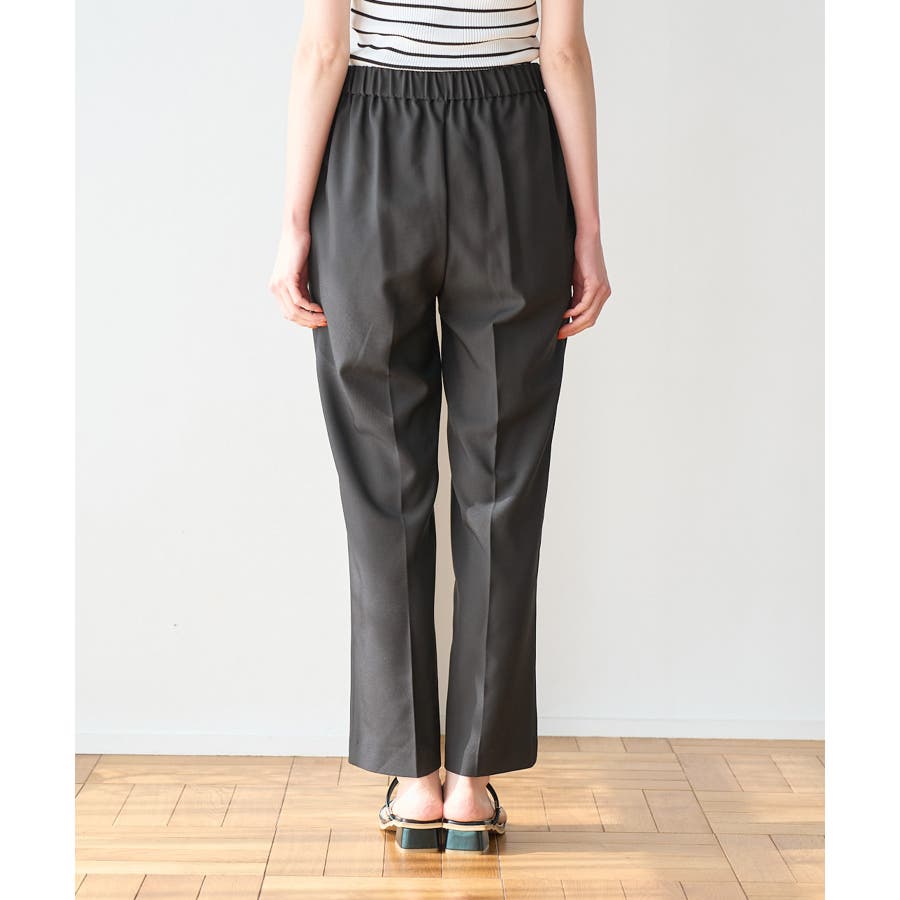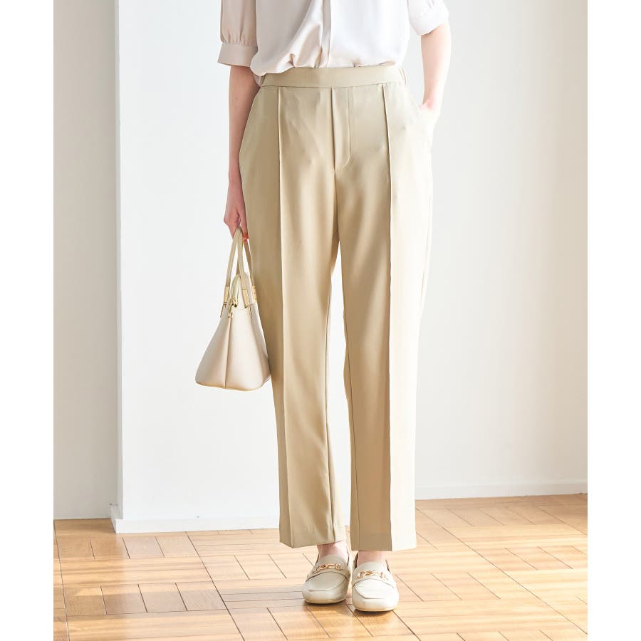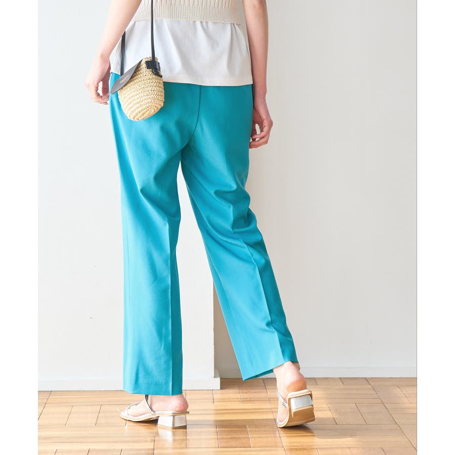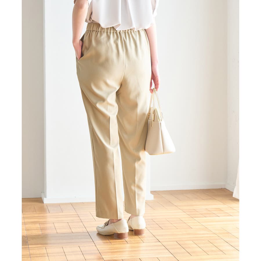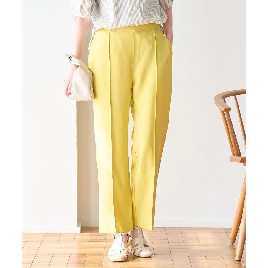 ラクして美を叶える【ラク美】シリーズのラク美パンツから夏素材になって新登場! : 【素材感】 ・薄手で伸縮性のある素材を使用した夏用ラク美パンツ。 【デザイン・シルエット】 ・ラクに着られて美シルエットをキープする、「ラク美」シリーズ。 ・フロントのピンタックが縦ラインを強調し美脚効果に期待。 ・気になるヒップ周りもきれいに見え、膝から裾にかけてのシルエットもすっきりと見せてくれる。 ・軽快なアンクル丈のスティックパンツ。 ・ベルトラインは後ろ側がゴム仕様。 【カラー】 ・ブラック、ベージュ、ターコイズブルー、イエローの4色展開。 【スタイリングポイント】 ・ジャケットやシャツ、ブラウスに合わせてお仕事用に。 ・すっきりとした着丈で、パンプスにもフラットシューズにも合わせやすい。 【前回のラク美パンツ(品番:GDS13010)との違い】 ・夏まで着やすい素材に変更したことで、肌にはりつかず、足のラインを拾わないサイズ感に変更。 ・縦ラインを強調して脚長効果が期待できるピンタックディテールに変更。 ・前回と比べ幅が広く、すっきりとしたシルエットのストレートラインに。 ----------------------------- 裏地:なし 透け感:なし 伸縮性:あり 生地感・厚さ:やや薄手 ポケット::あり ウエスト:後ろゴム 季節:春・夏 ----------------------------- ※撮影時の光、お使いのモニター環境によって色の見え方が違う場合がございます。 ※モデル身長:165cm 着用サイズ:38