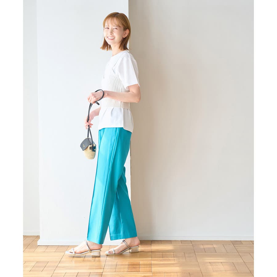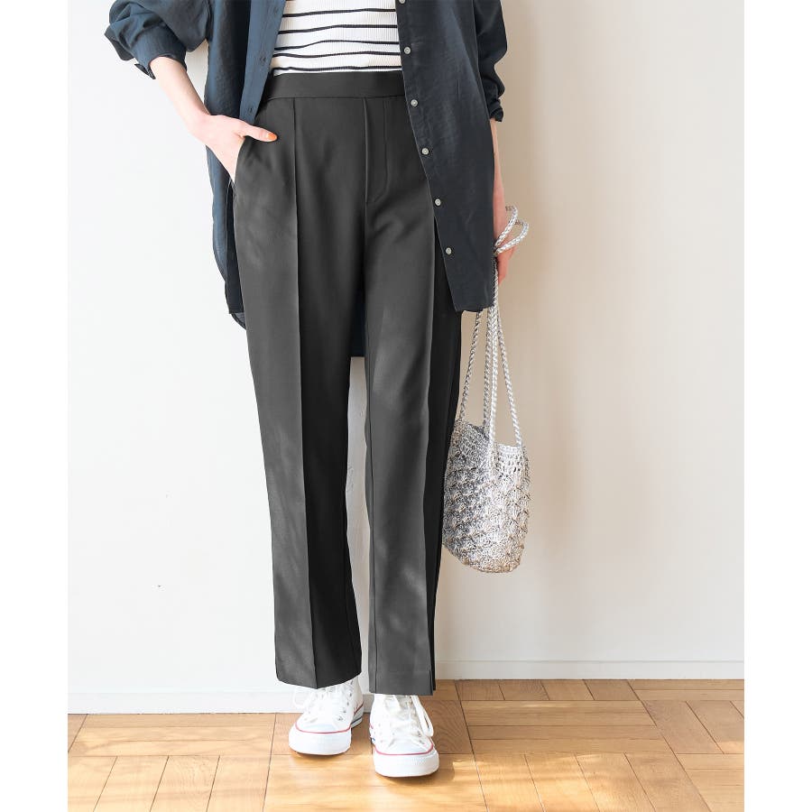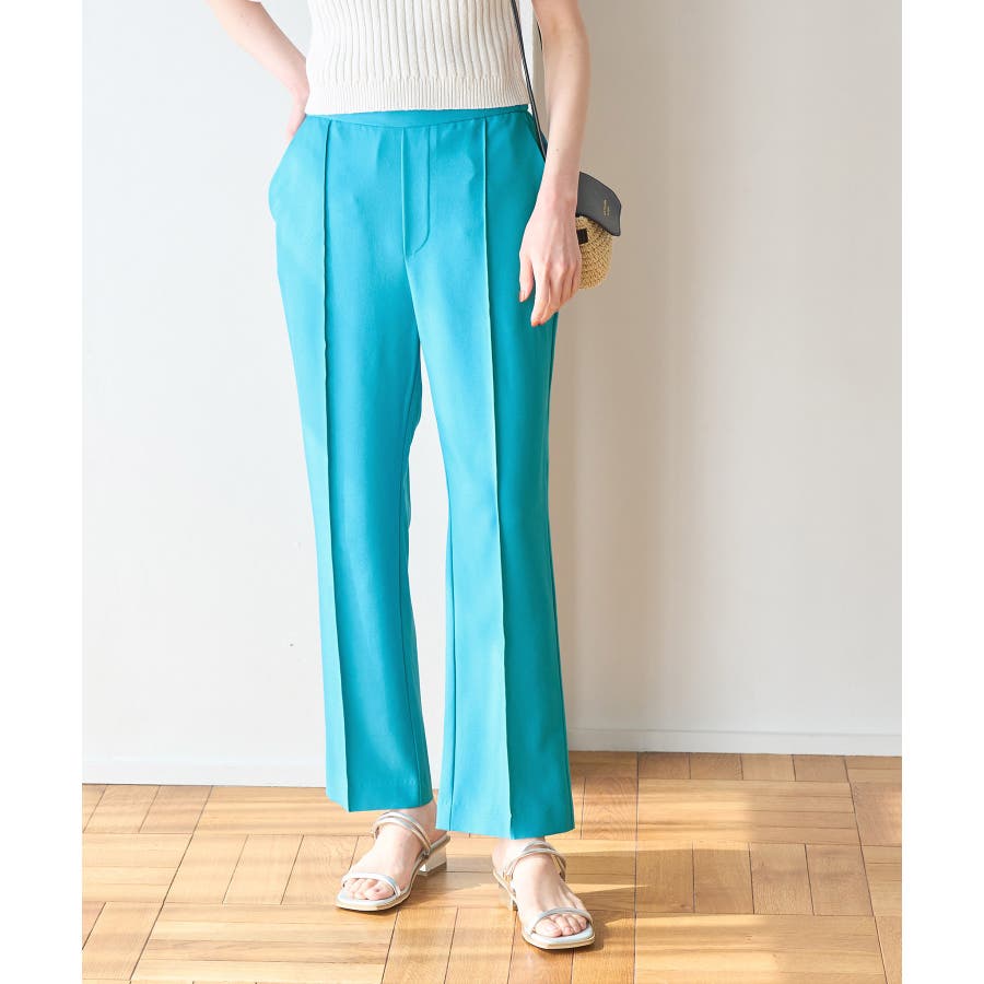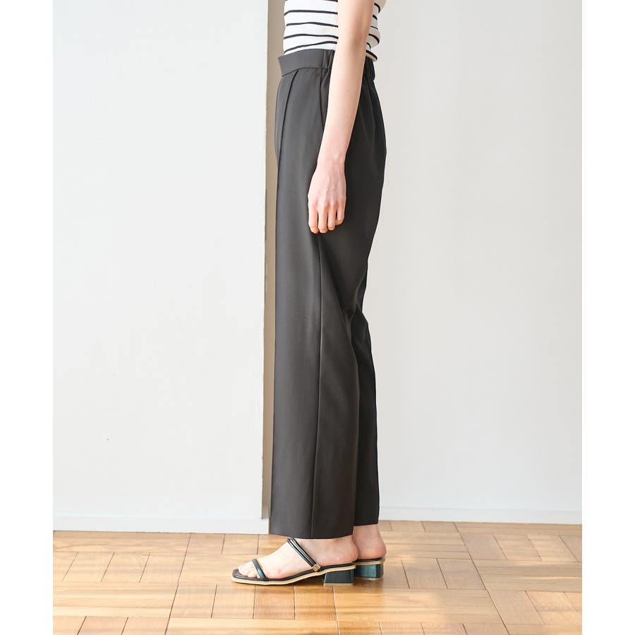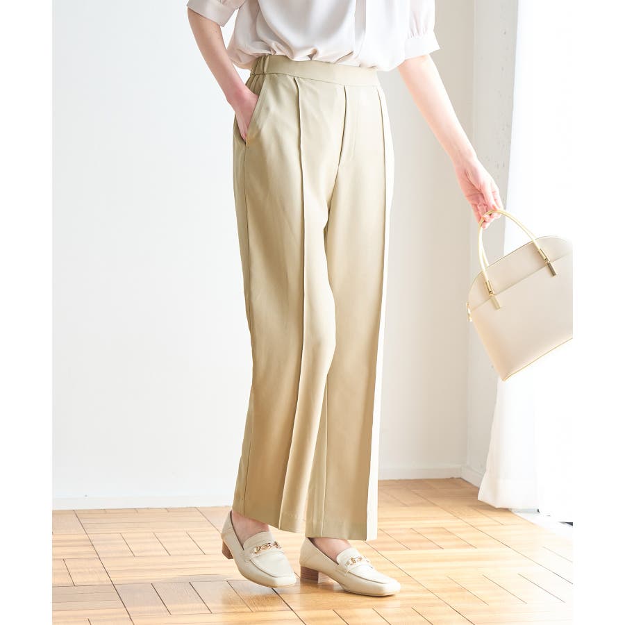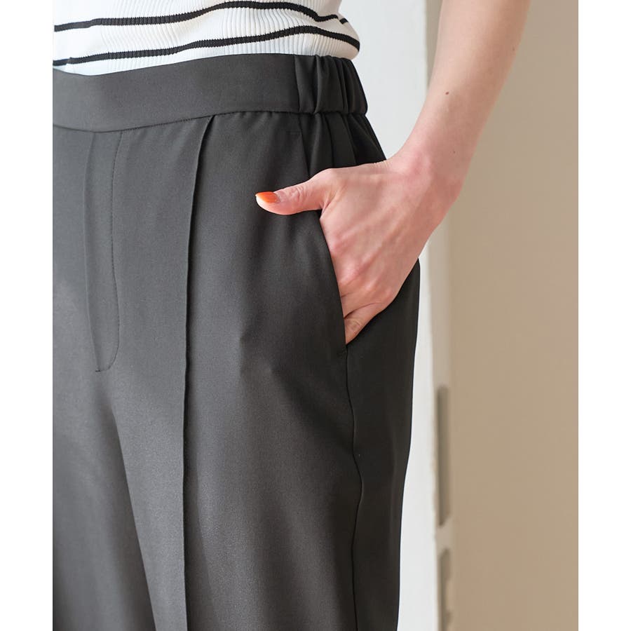 ラクして美を叶える【ラク美】シリーズのラク美パンツから夏素材になって新登場! : 【素材感】 ・薄手で伸縮性のある素材を使用した夏用ラク美パンツ。 【デザイン・シルエット】 ・ラクに着られて美シルエットをキープする、「ラク美」シリーズ。 ・フロントのピンタックが縦ラインを強調し美脚効果に期待。 ・気になるヒップ周りもきれいに見え、膝から裾にかけてのシルエットもすっきりと見せてくれる。 ・軽快なアンクル丈のスティックパンツ。 ・ベルトラインは後ろ側がゴム仕様。 【カラー】 ・ブラック、ベージュ、ターコイズブルー、イエローの4色展開。 【スタイリングポイント】 ・ジャケットやシャツ、ブラウスに合わせてお仕事用に。 ・すっきりとした着丈で、パンプスにもフラットシューズにも合わせやすい。 【前回のラク美パンツ(品番:GDS13010)との違い】 ・夏まで着やすい素材に変更したことで、肌にはりつかず、足のラインを拾わないサイズ感に変更。 ・縦ラインを強調して脚長効果が期待できるピンタックディテールに変更。 ・前回と比べ幅が広く、すっきりとしたシルエットのストレートラインに。 ----------------------------- 裏地:なし 透け感:なし 伸縮性:あり 生地感・厚さ:やや薄手 ポケット::あり ウエスト:後ろゴム 季節:春・夏 ----------------------------- ※撮影時の光、お使いのモニター環境によって色の見え方が違う場合がございます。 ※モデル身長:165cm 着用サイズ:38
