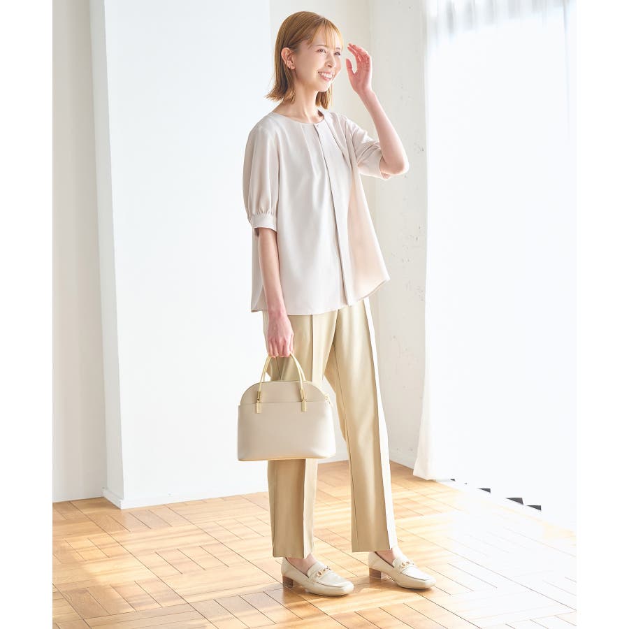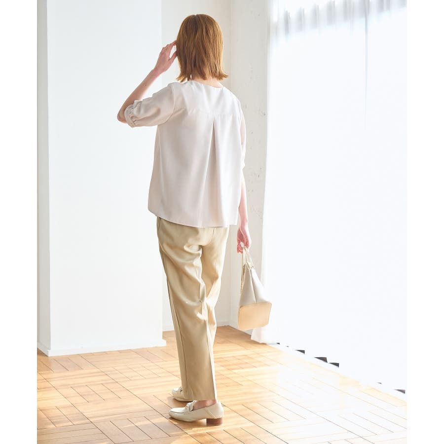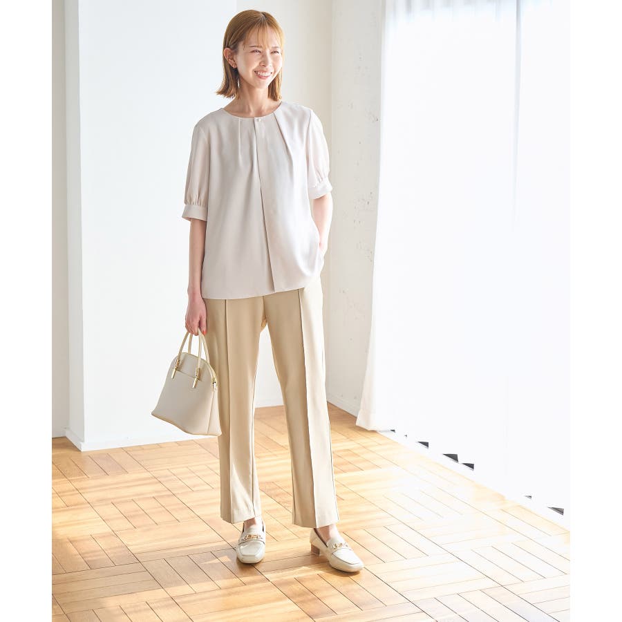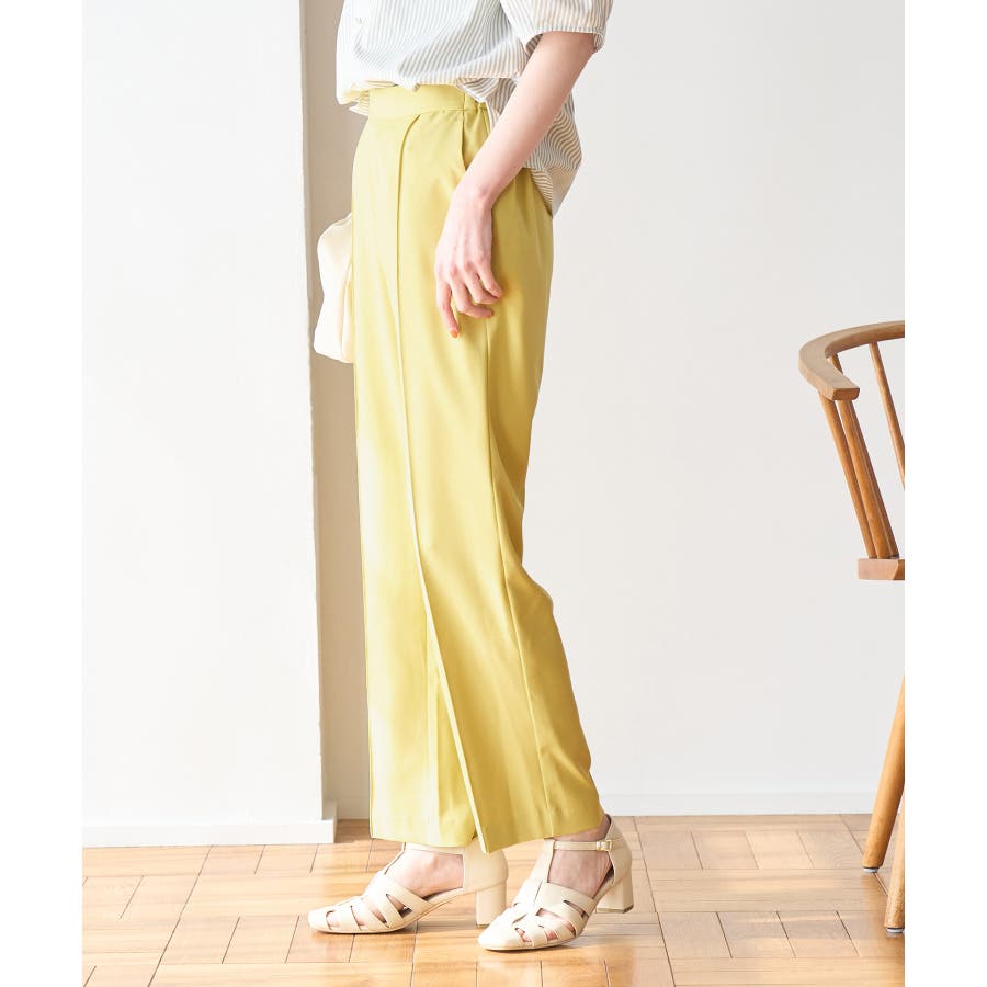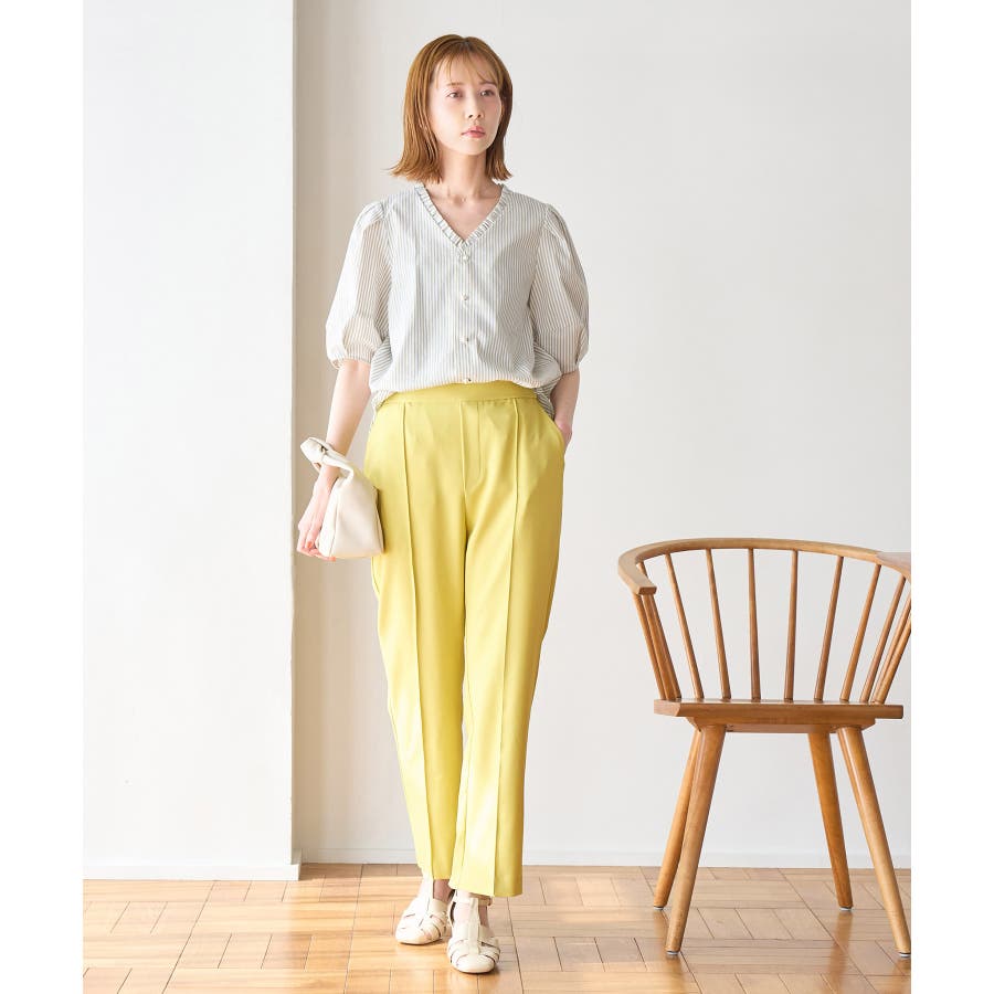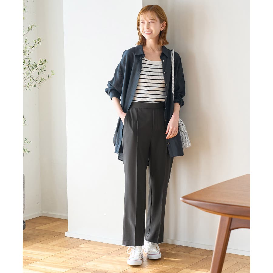 ラクして美を叶える【ラク美】シリーズのラク美パンツから夏素材になって新登場! : 【素材感】 ・薄手で伸縮性のある素材を使用した夏用ラク美パンツ。 【デザイン・シルエット】 ・ラクに着られて美シルエットをキープする、「ラク美」シリーズ。 ・フロントのピンタックが縦ラインを強調し美脚効果に期待。 ・気になるヒップ周りもきれいに見え、膝から裾にかけてのシルエットもすっきりと見せてくれる。 ・軽快なアンクル丈のスティックパンツ。 ・ベルトラインは後ろ側がゴム仕様。 【カラー】 ・ブラック、ベージュ、ターコイズブルー、イエローの4色展開。 【スタイリングポイント】 ・ジャケットやシャツ、ブラウスに合わせてお仕事用に。 ・すっきりとした着丈で、パンプスにもフラットシューズにも合わせやすい。 【前回のラク美パンツ(品番:GDS13010)との違い】 ・夏まで着やすい素材に変更したことで、肌にはりつかず、足のラインを拾わないサイズ感に変更。 ・縦ラインを強調して脚長効果が期待できるピンタックディテールに変更。 ・前回と比べ幅が広く、すっきりとしたシルエットのストレートラインに。 ----------------------------- 裏地:なし 透け感:なし 伸縮性:あり 生地感・厚さ:やや薄手 ポケット::あり ウエスト:後ろゴム 季節:春・夏 ----------------------------- ※撮影時の光、お使いのモニター環境によって色の見え方が違う場合がございます。 ※モデル身長:165cm 着用サイズ:38