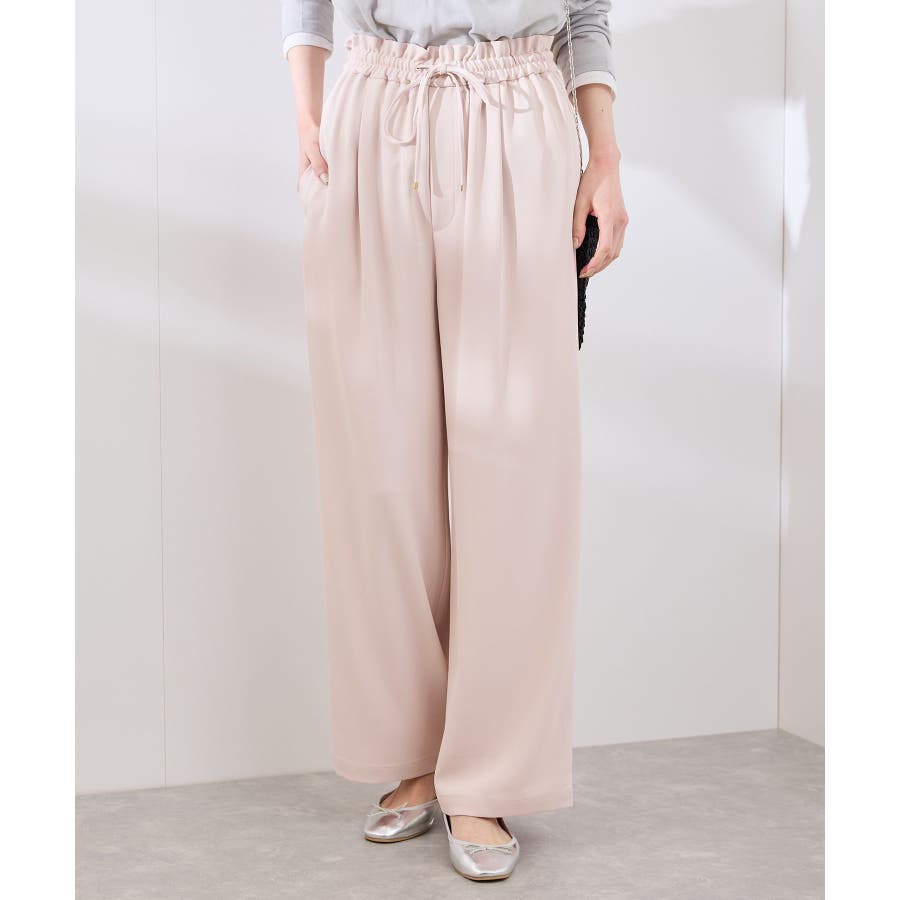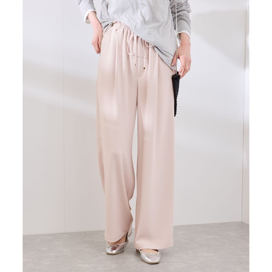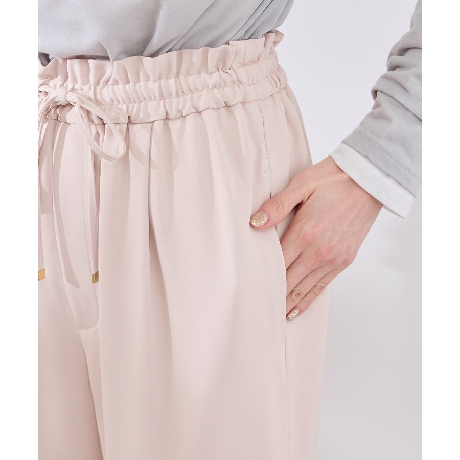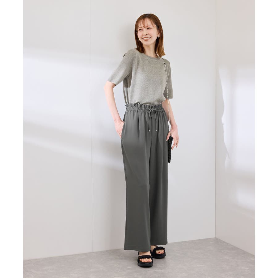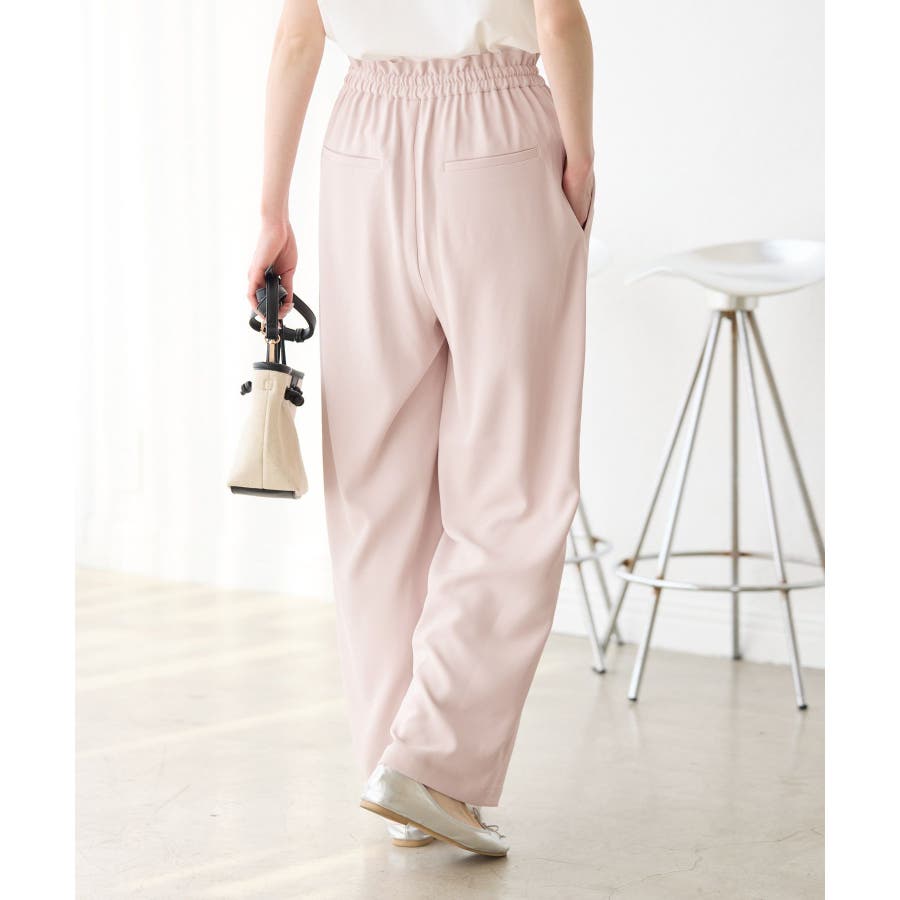 【素材感】 ・落ち感のある合繊素材のワイドシルエットのジョグパンツ。 ・ハリ感もある素材なので、足のラインを拾いにくい。 たてラインをきれいに見せます。 【デザイン・シルエット】 ・ニュアンスカラーが春を感じさせるイージーワイドパンツ。 ・ギャザーウエストとドローストリングで快適な穿き心地。 ・フロントタックと、バックの片玉縁ポケットで、きれいめな要素もプラス。 【カラー】 ・チャコールグレー、ベージュ、サックスブルー、ピンクの4色展開。 【スタイリングポイント】 ・ピンクはブラックを合わせると甘さを抑えられる。 ・ボーダートップスに合わせて、リラクシーなマリンコーデに。 ・足もとはフラットサンダルで抜け感を演出して。 ・トップスはブラウスやシャツを合わせれば、オフィススタイルの完成。 ---------------------------- 裏地:なし 透け感:なし 伸縮性:あり 生地感・厚さ:普通 ポケット:あり(後ろはフェイク) ファスナー:なし その他仕様:ウエストゴム、内側紐あり 季節:春・夏・秋 ----------------------------- ※撮影時の光、お使いのモニター環境によって色の見え方が違う場合がございます。 ※モデル身長:165cm 着用サイズ:38