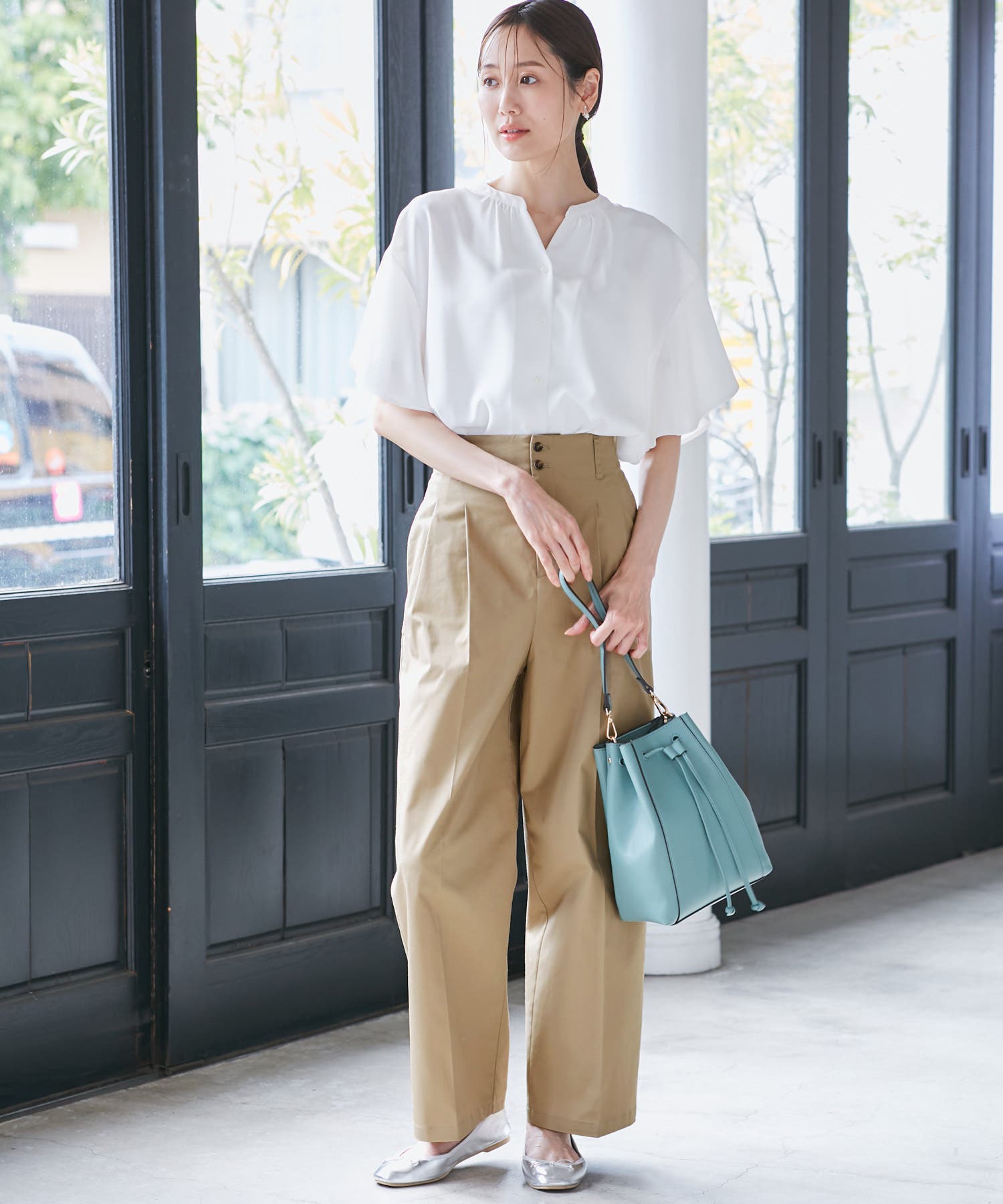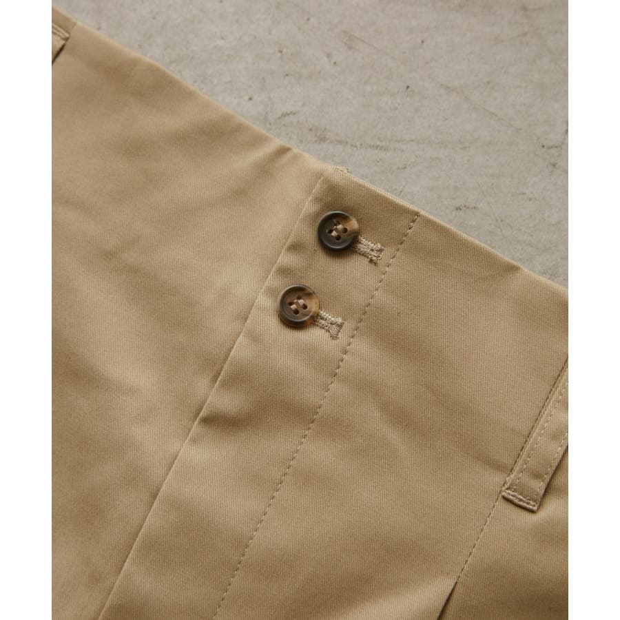 ・ハイウエスト、ボタンデザイン含めカジュアル過ぎないチノパンに仕上げた1着。