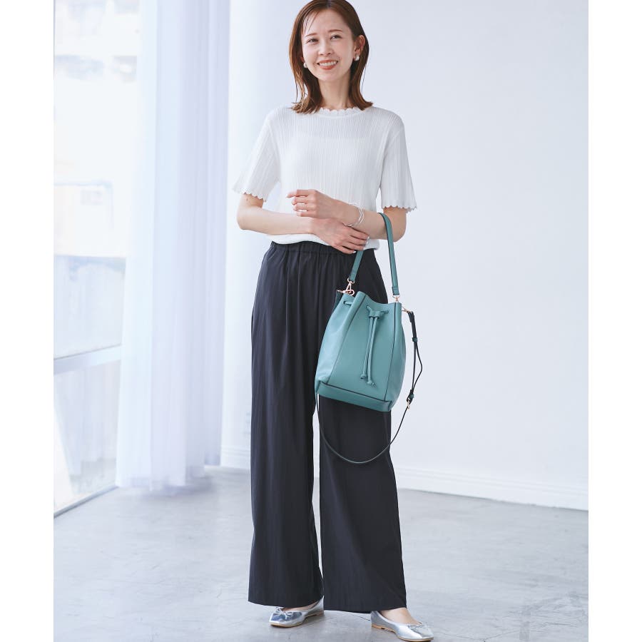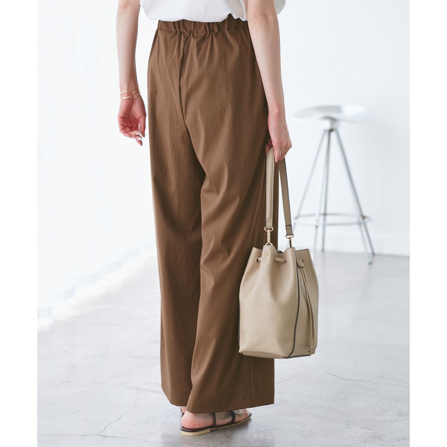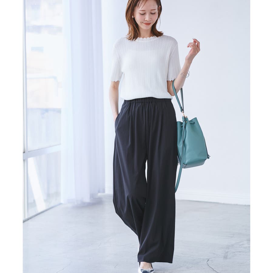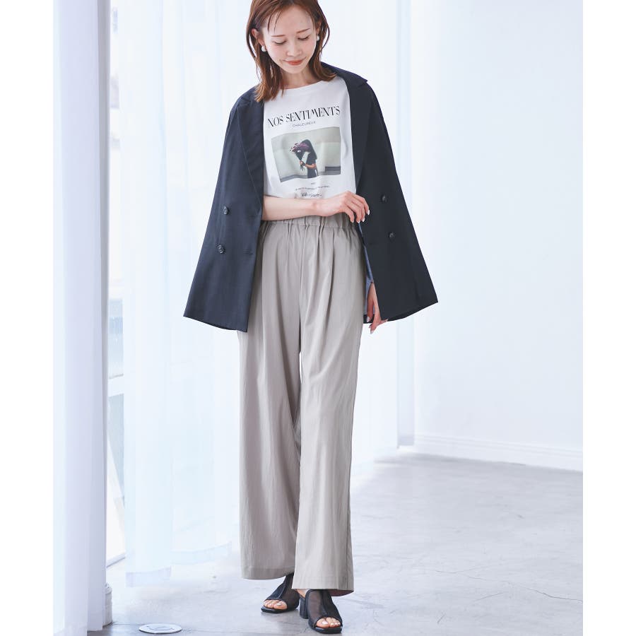 落ち感のある素材なので、ワイドパンツですがスッキリ着ていただけます。