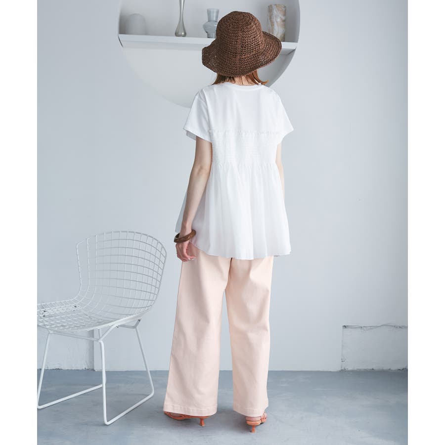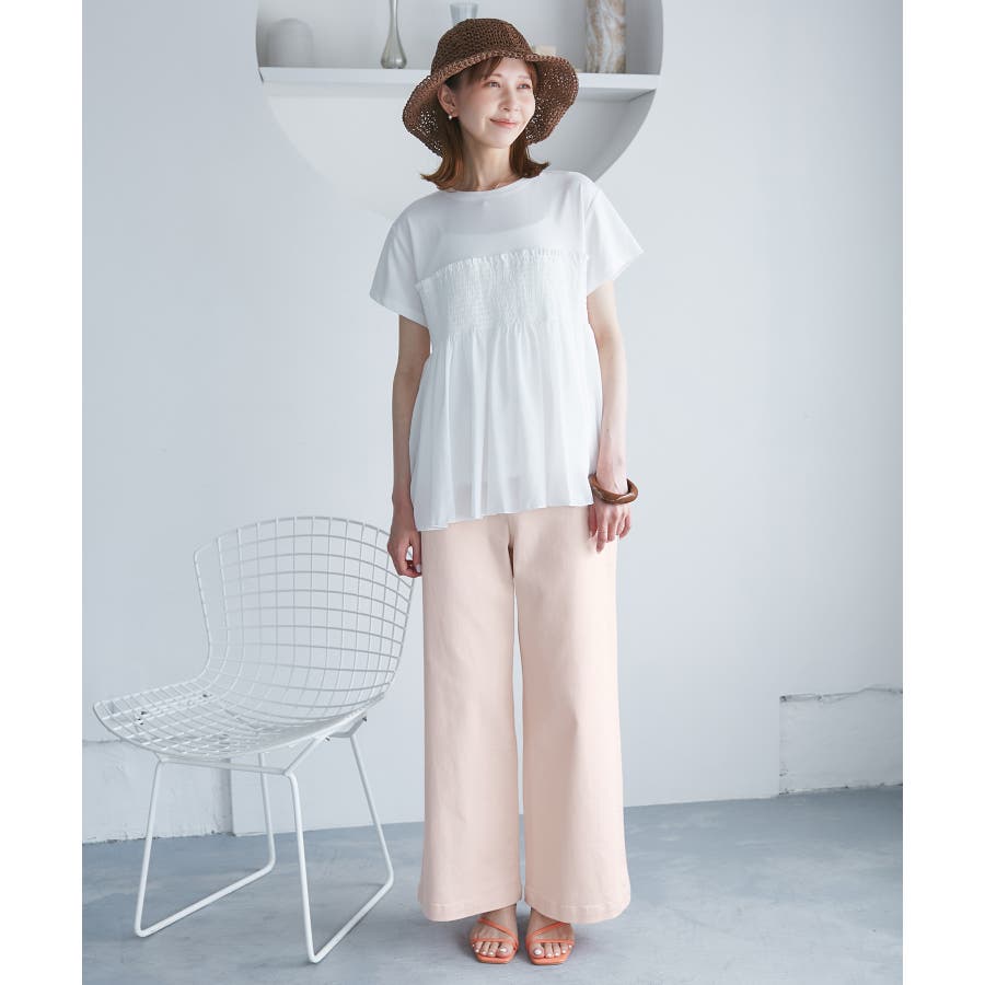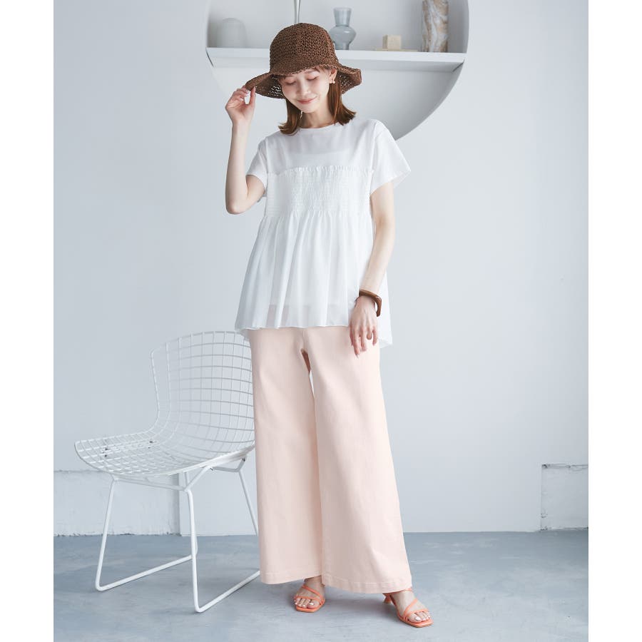 ・ウエストベルト下に太巾のゴムを入れることで、気になる下腹を着圧し細く見せてくれるワイドパンツ。