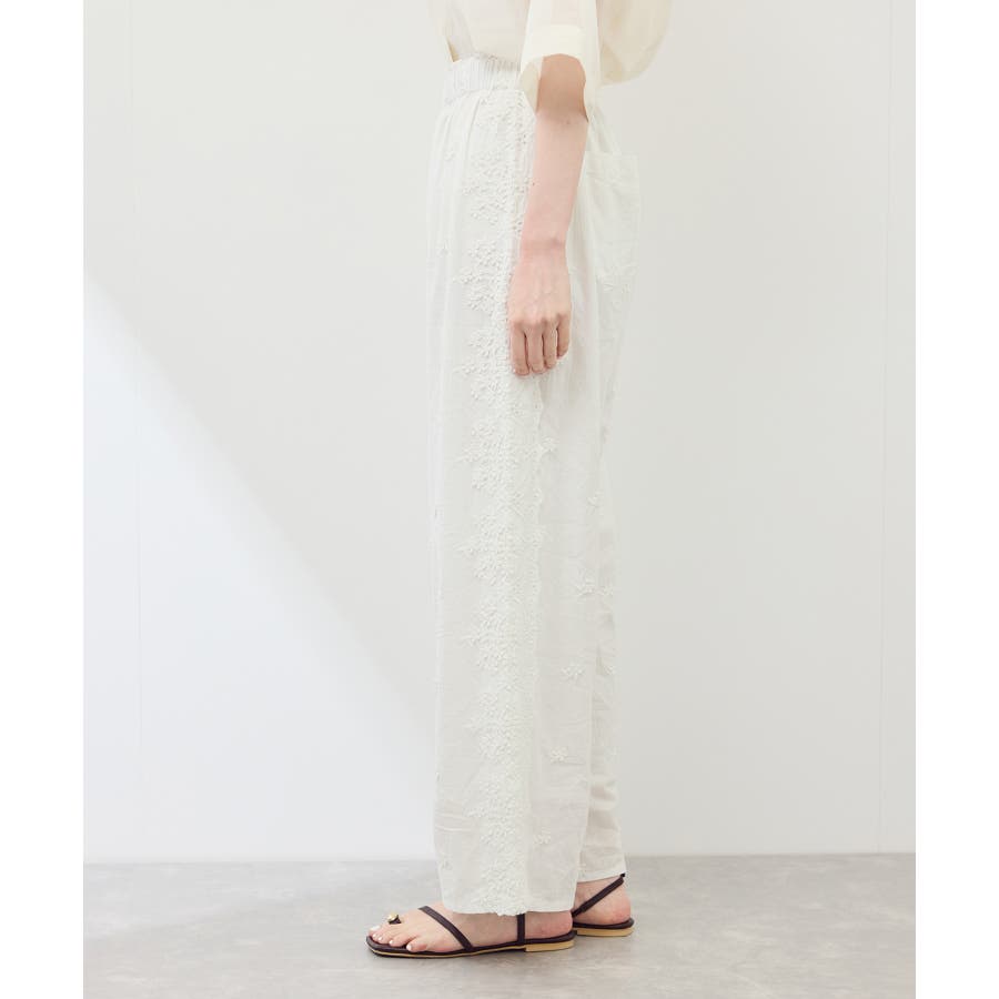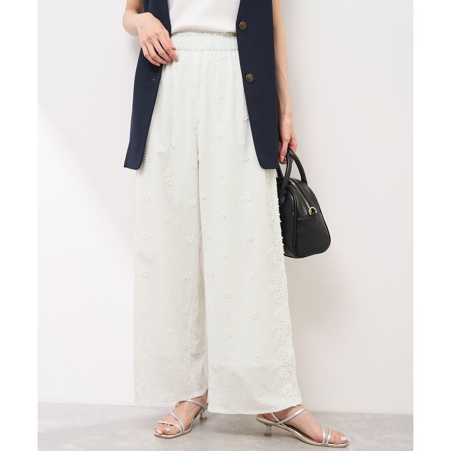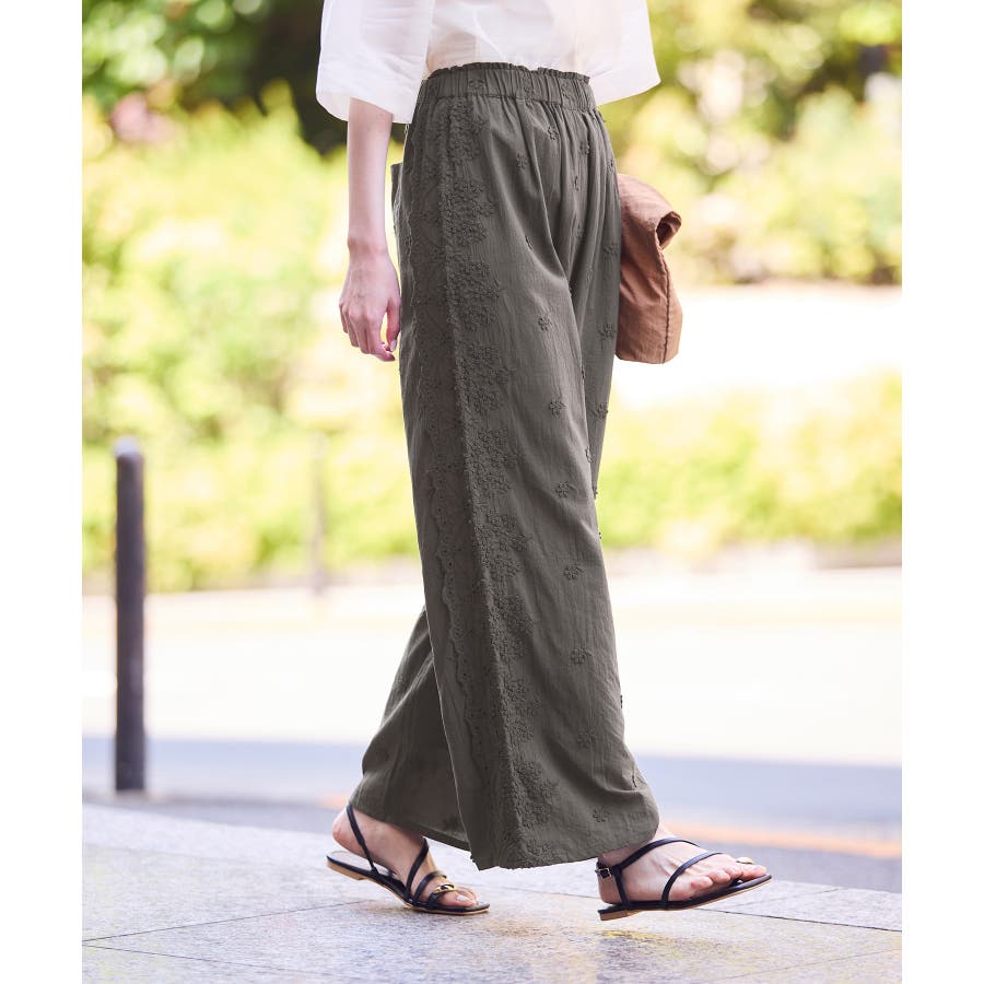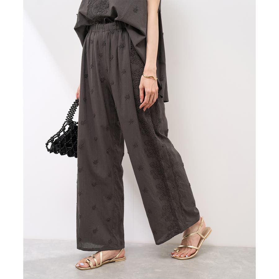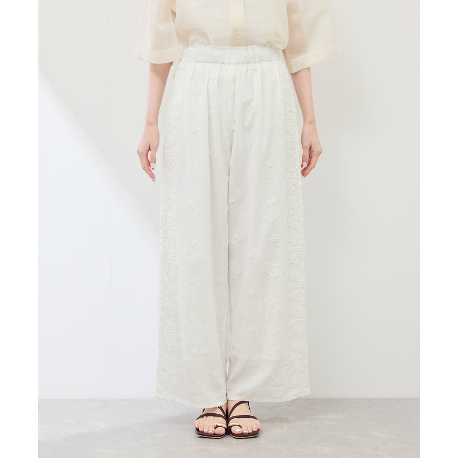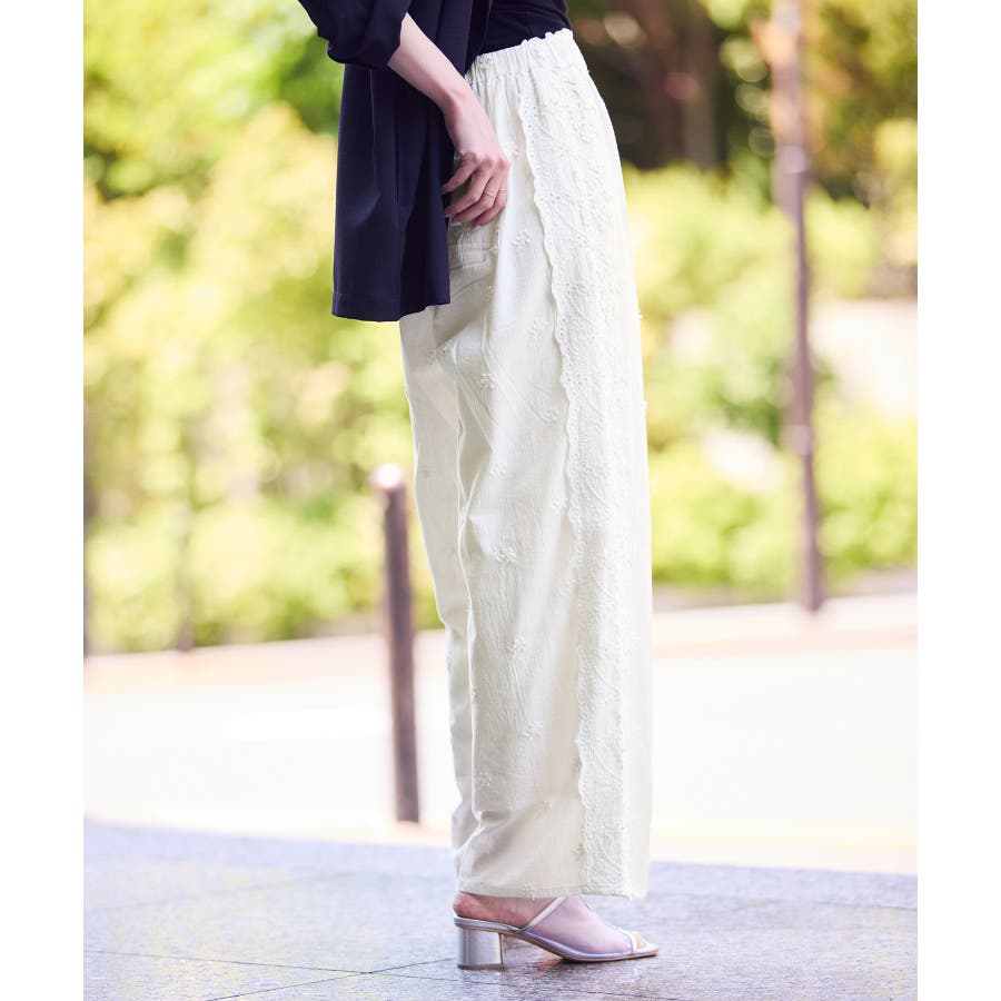 ・脇に入ったレースのスカラップ柄がポイントのワイドパンツ。