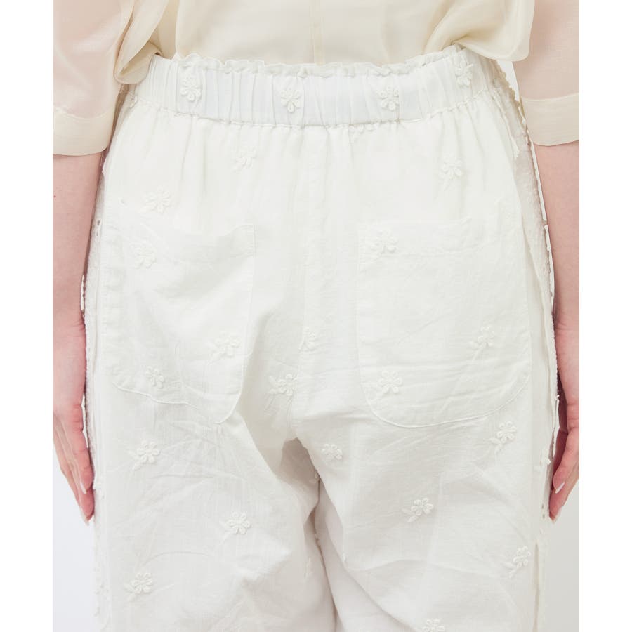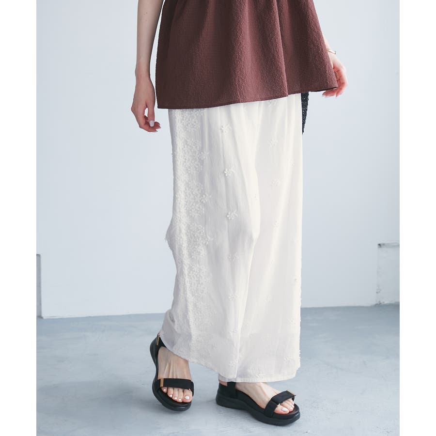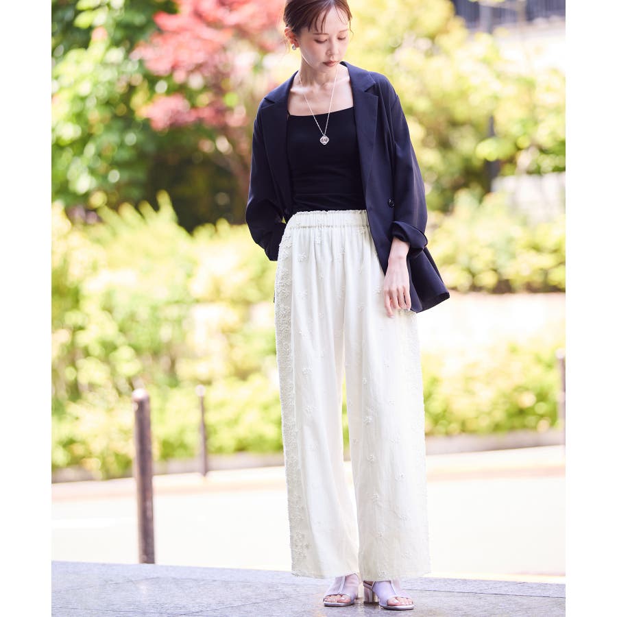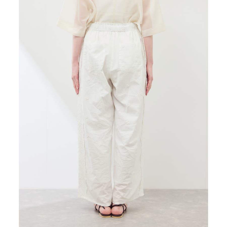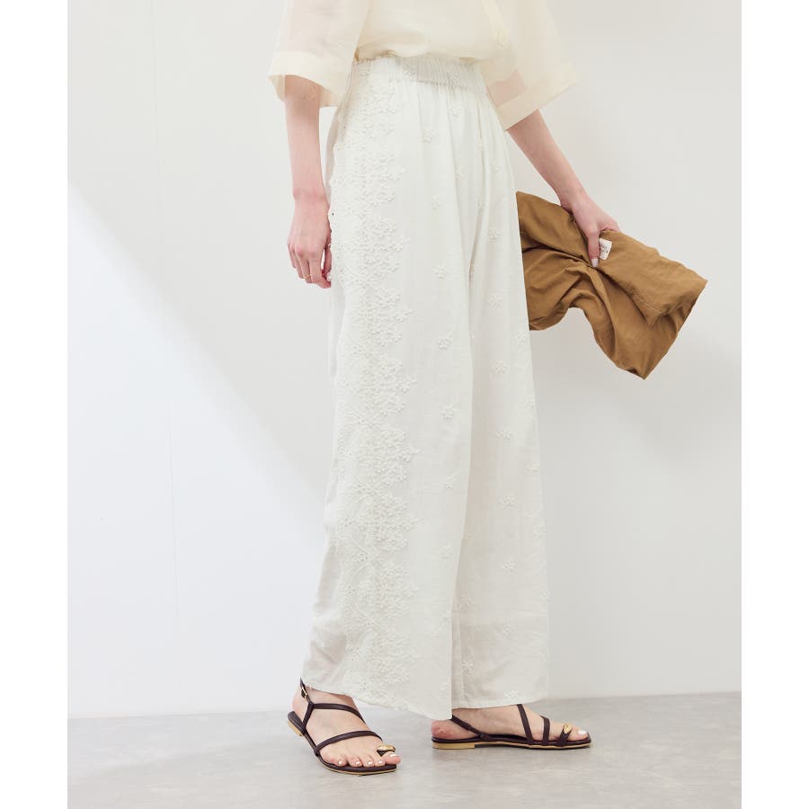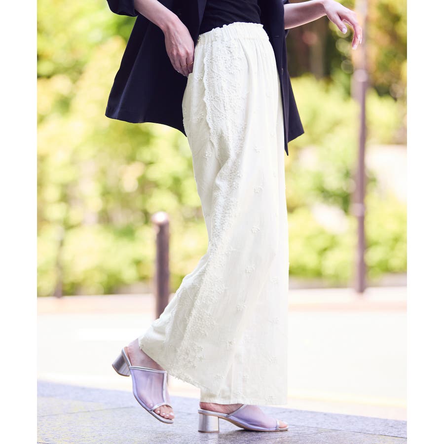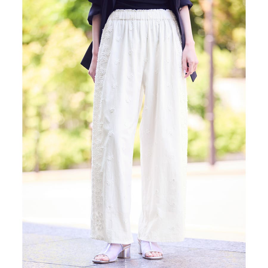 ・脇に入ったレースのスカラップ柄がポイントのワイドパンツ。