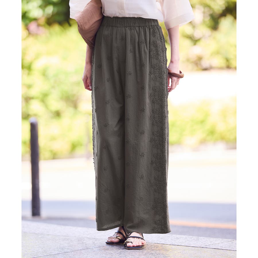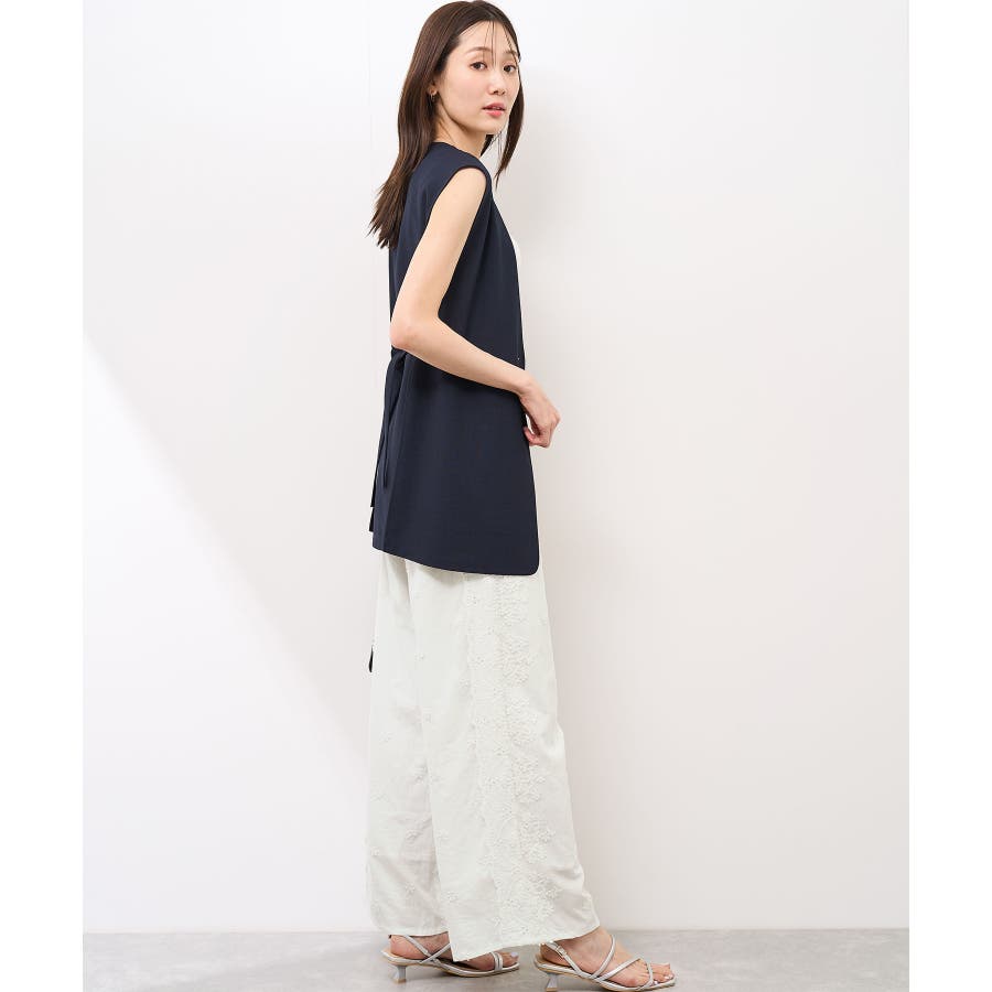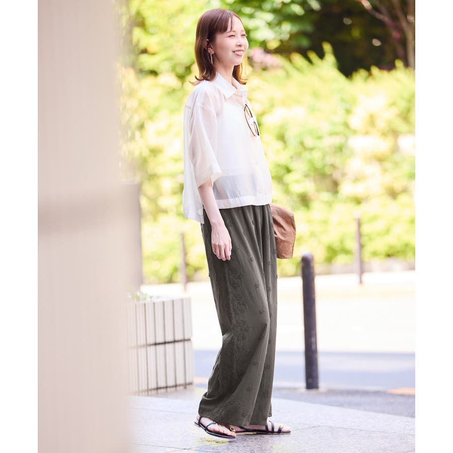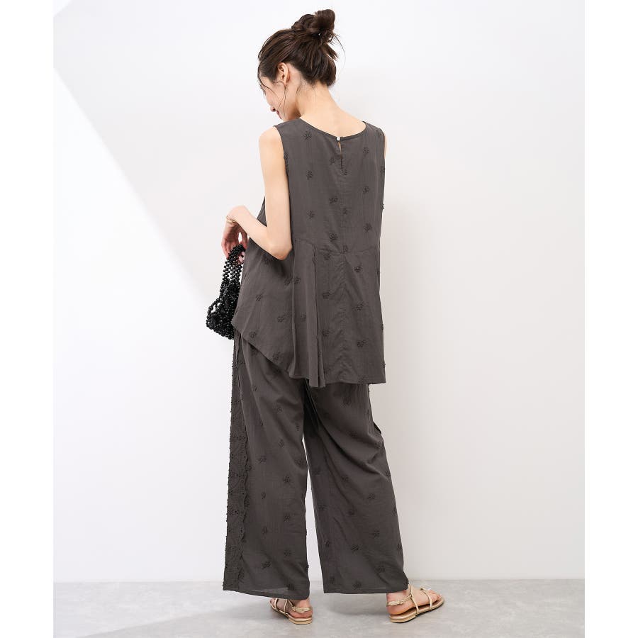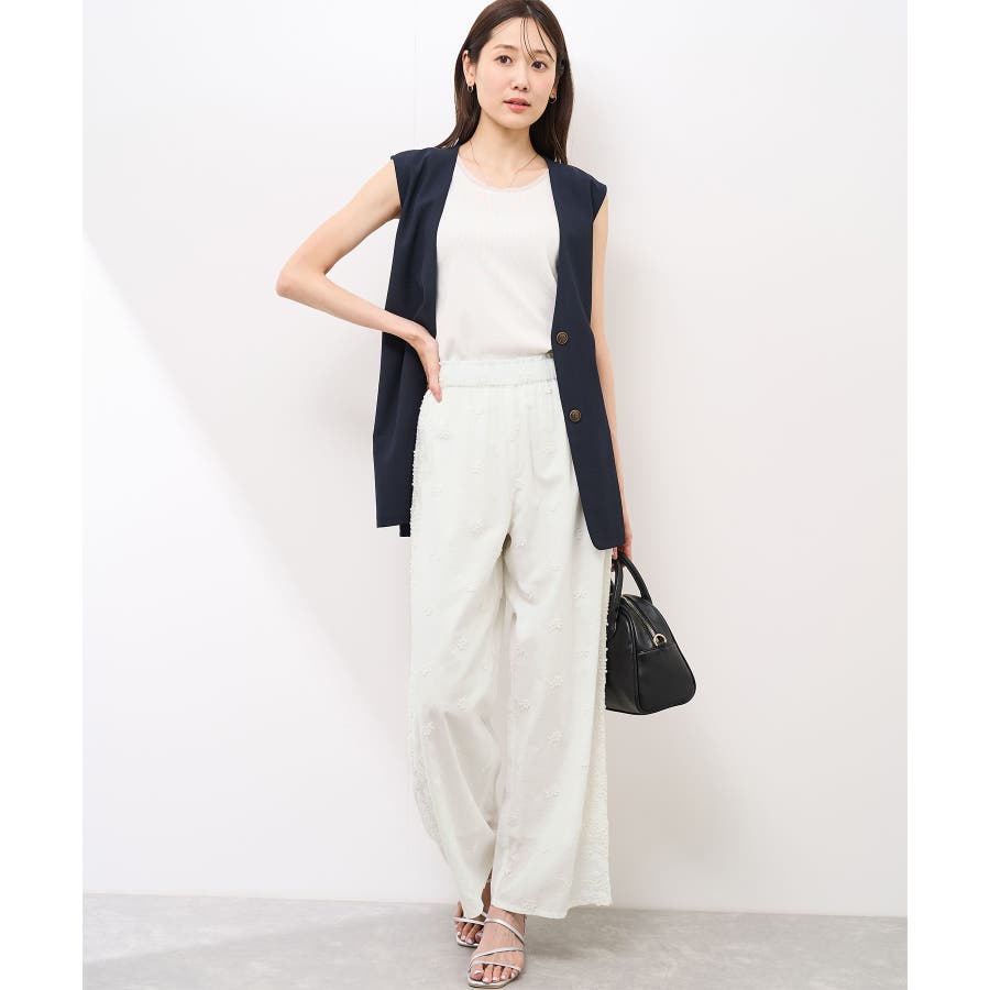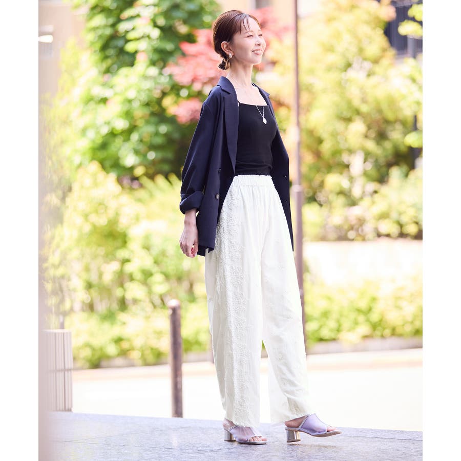 ・脇に入ったレースのスカラップ柄がポイントのワイドパンツ。