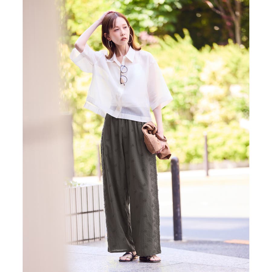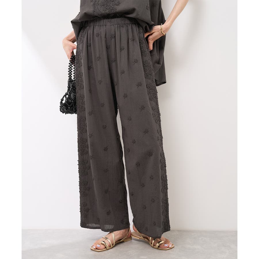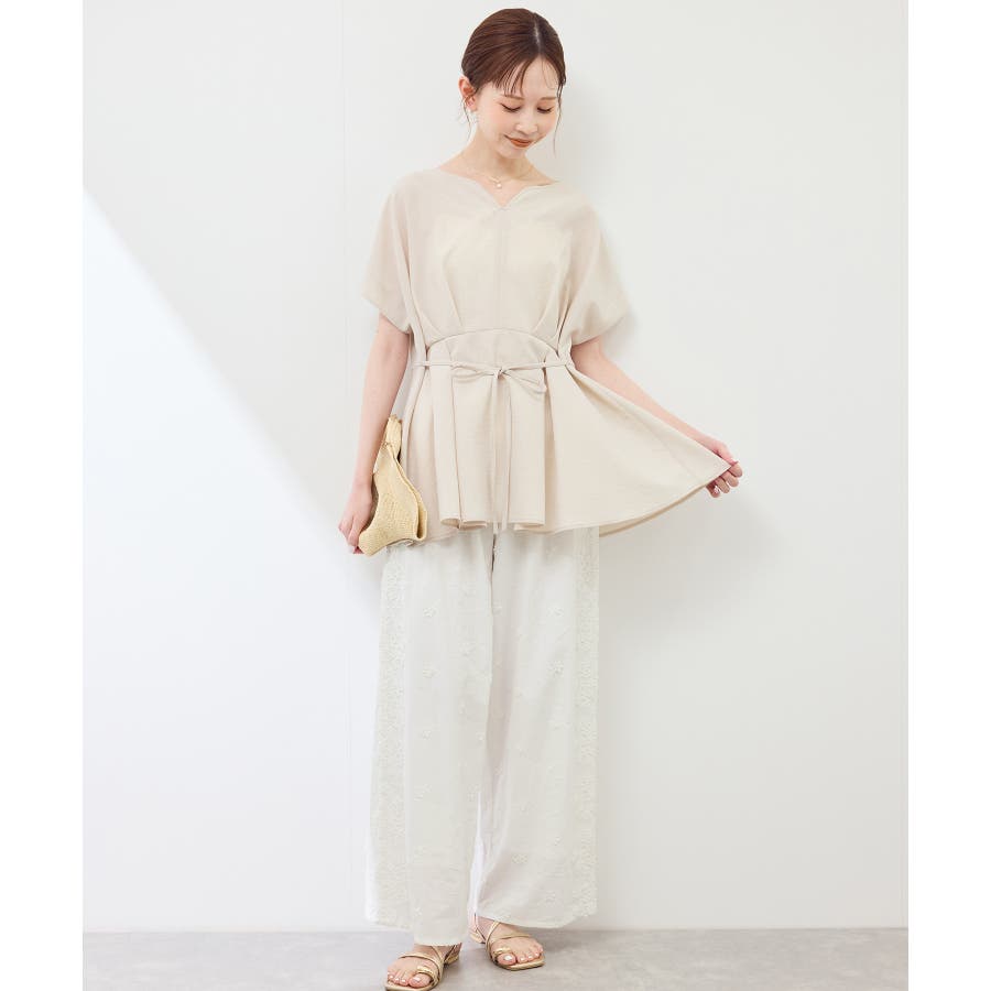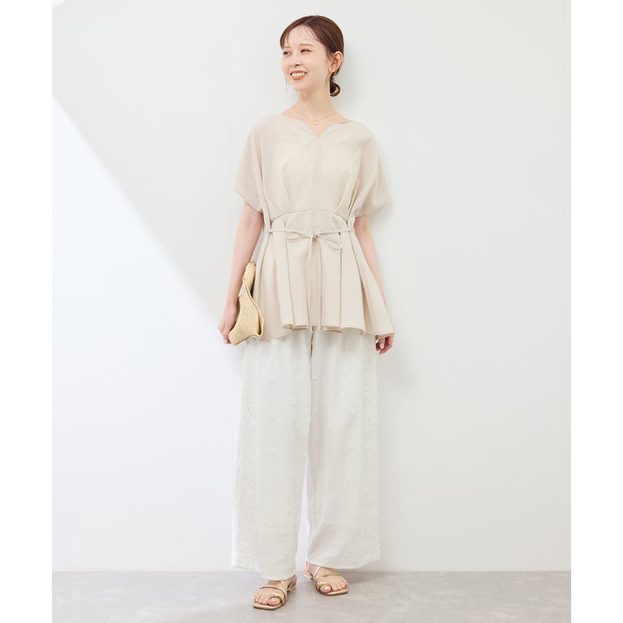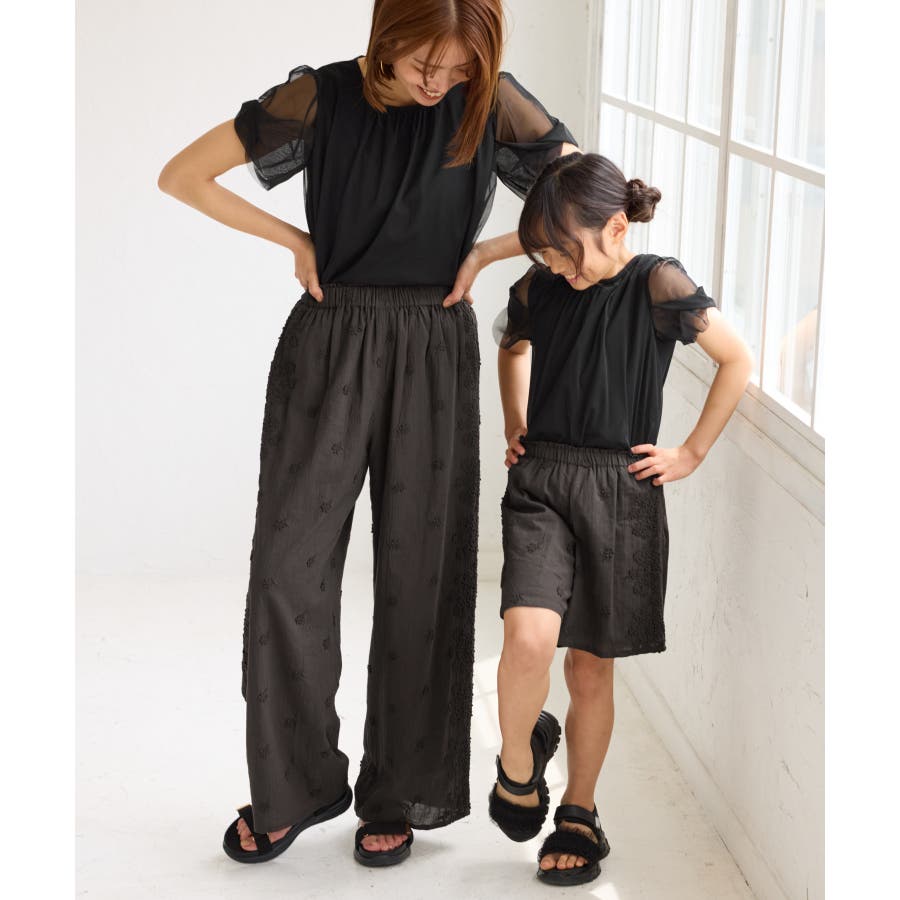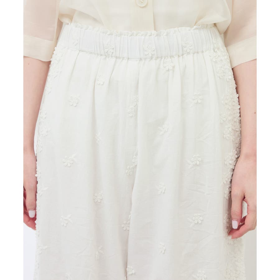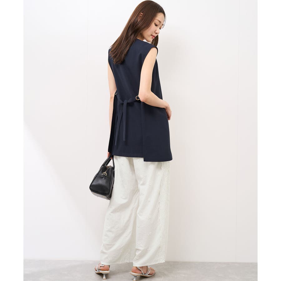 ・脇に入ったレースのスカラップ柄がポイントのワイドパンツ。