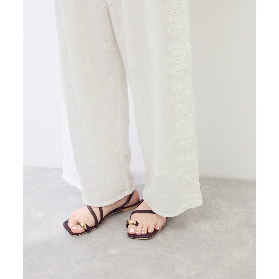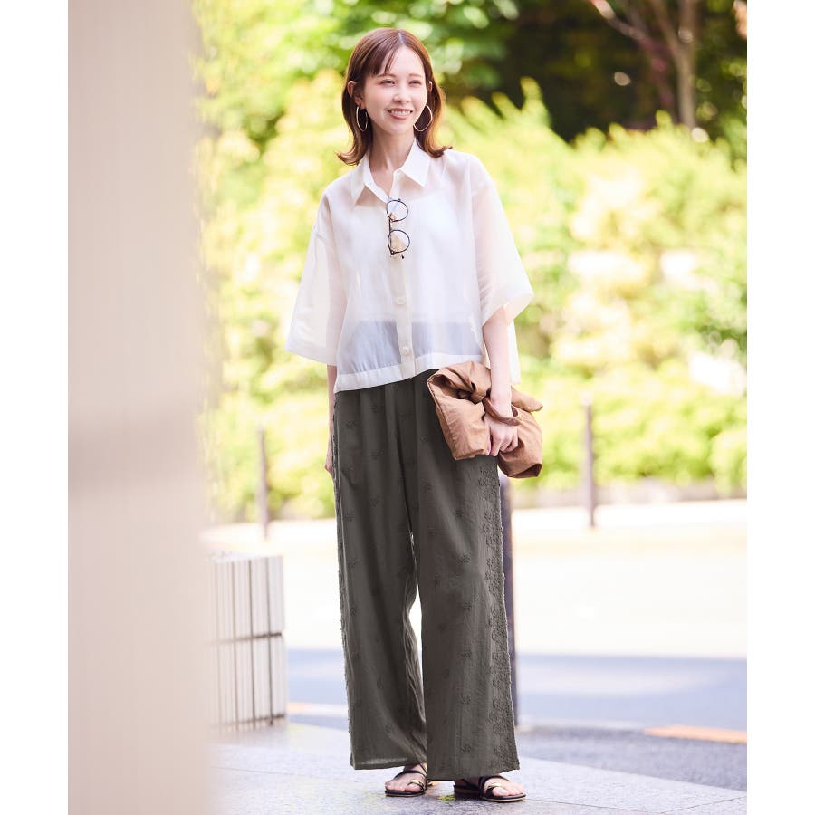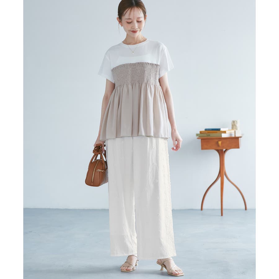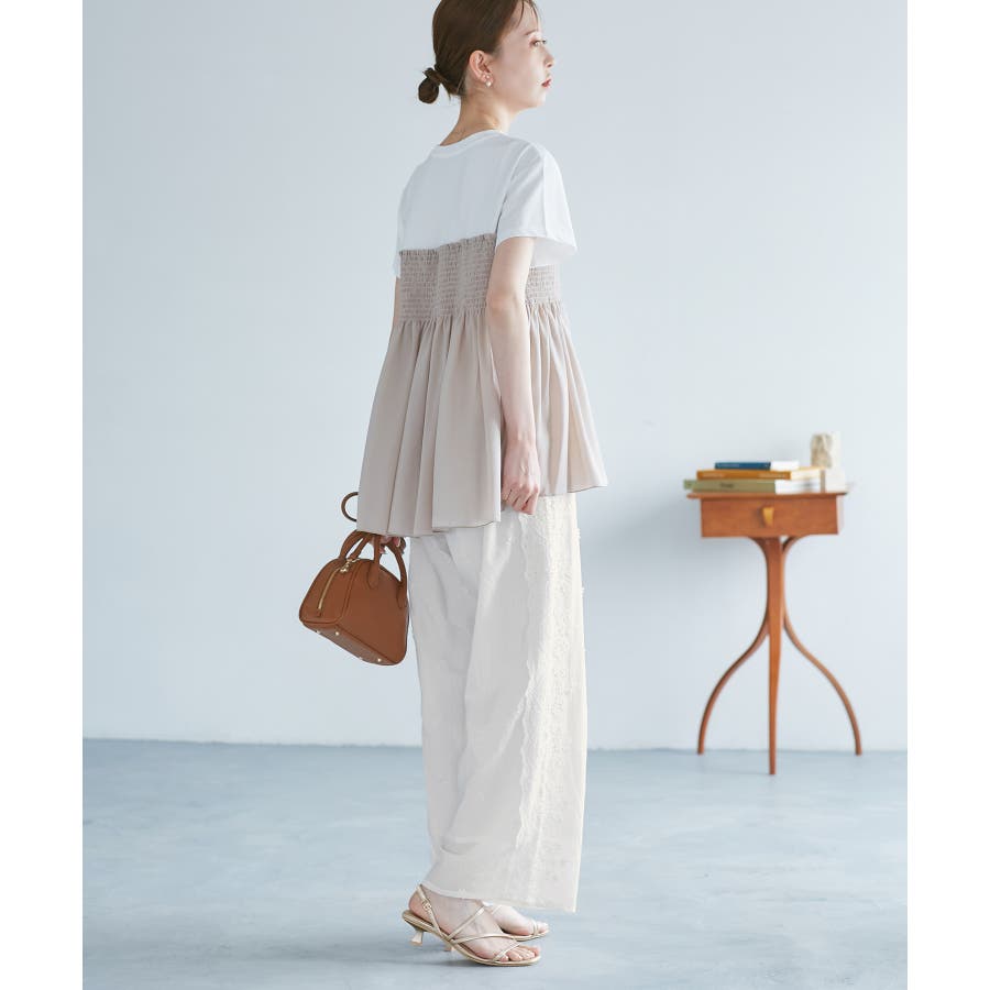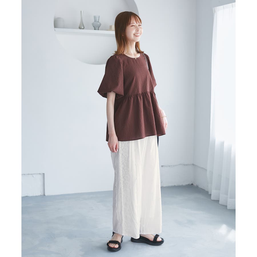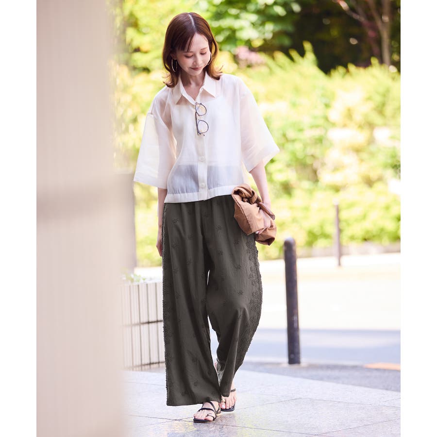 ・脇に入ったレースのスカラップ柄がポイントのワイドパンツ。