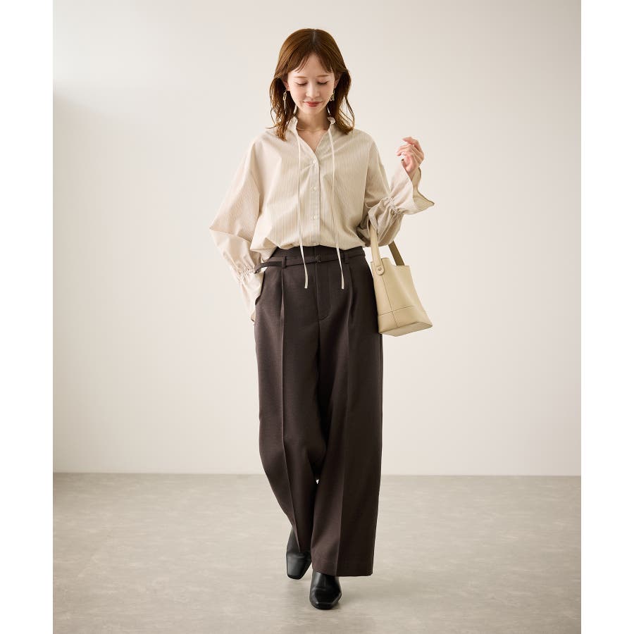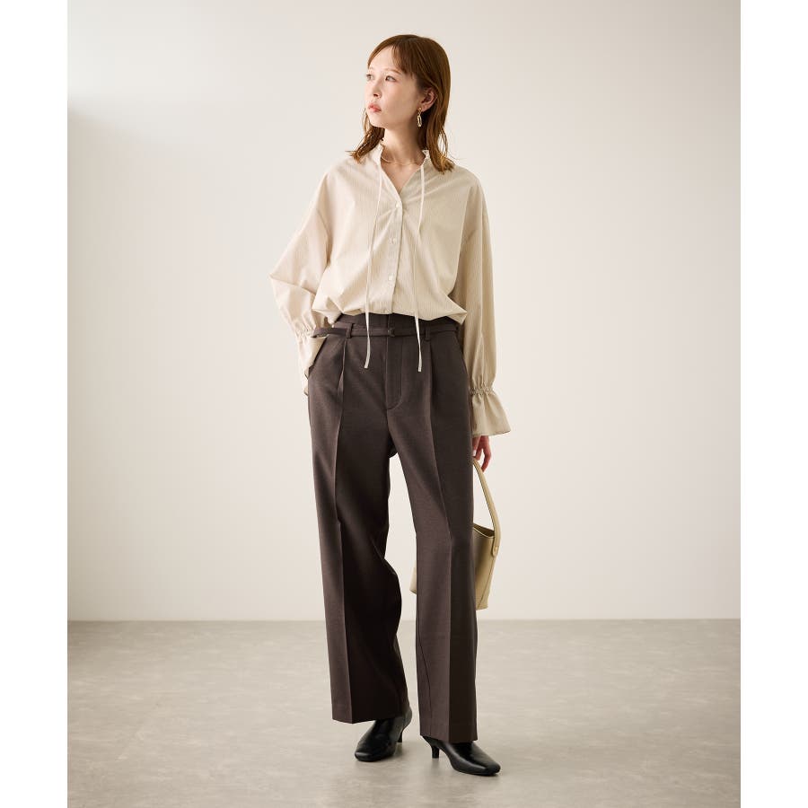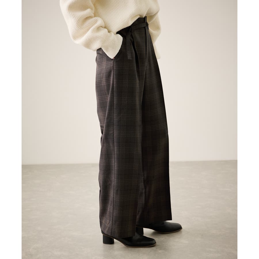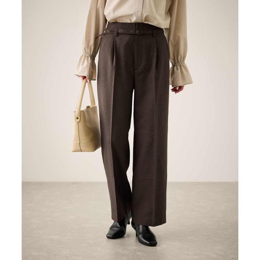・ウエストに付属共生地ベルトをセットしたワイドパンツ。
