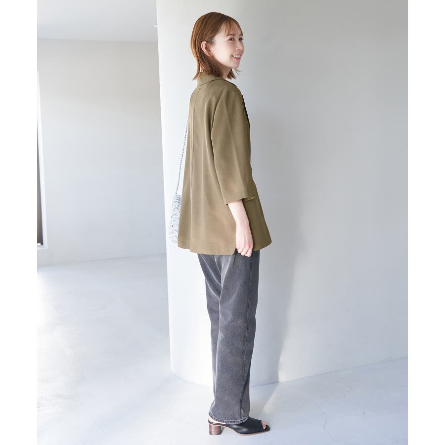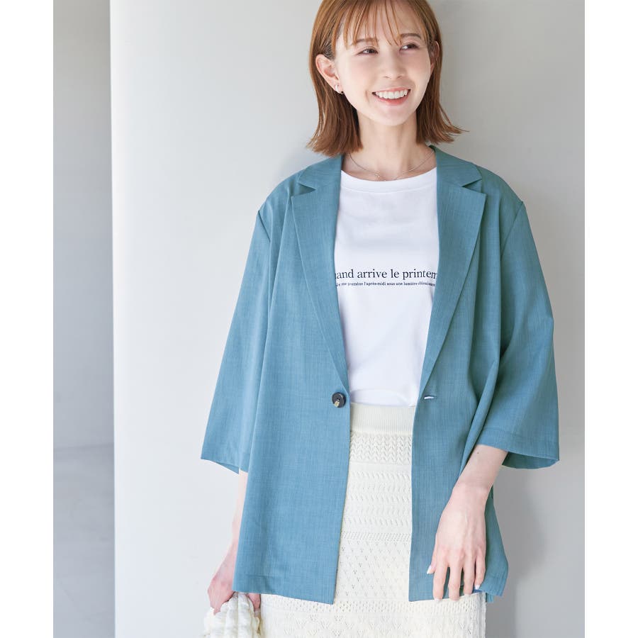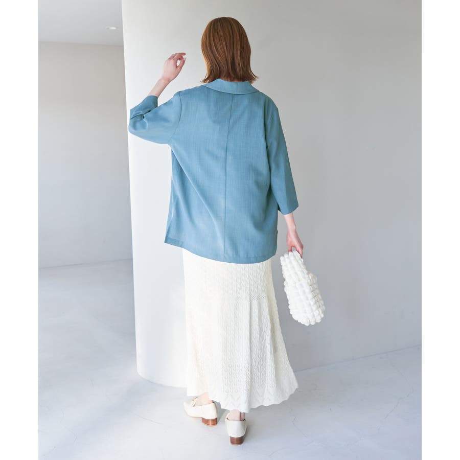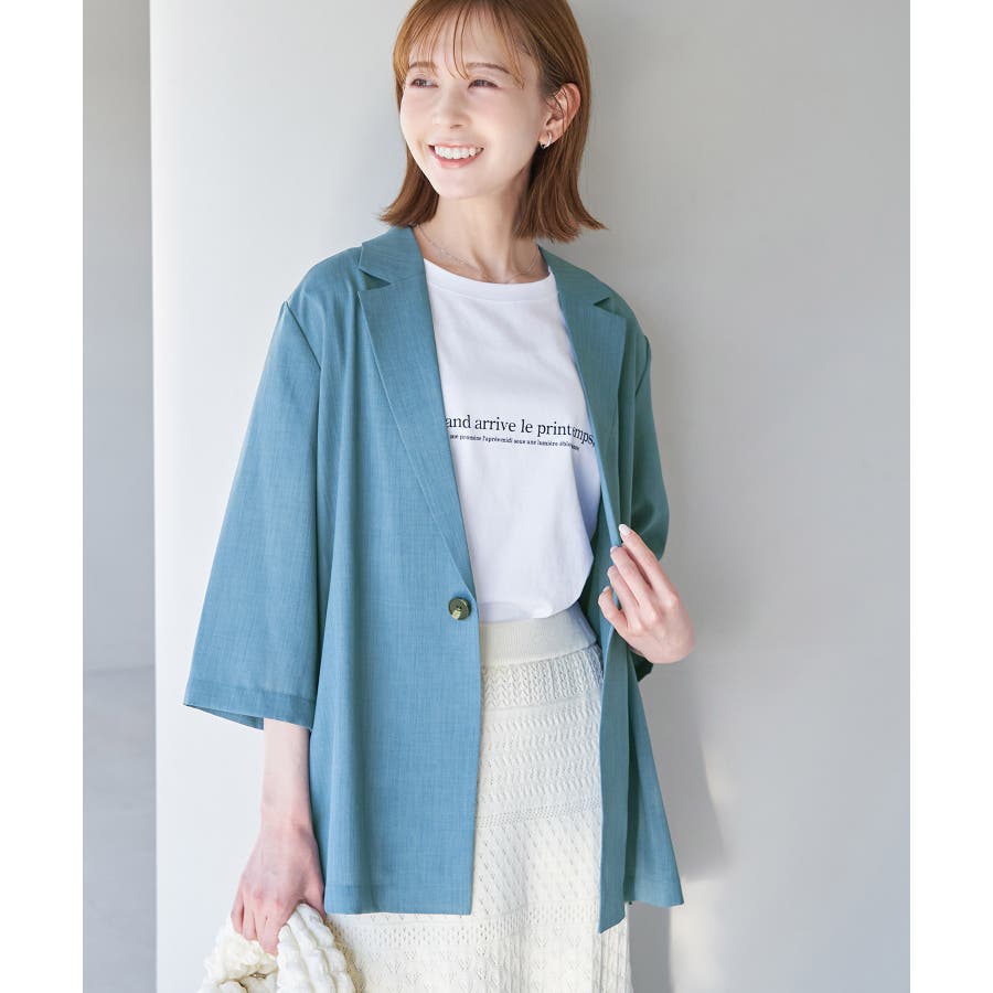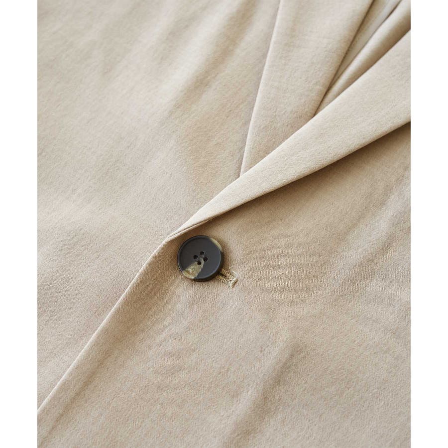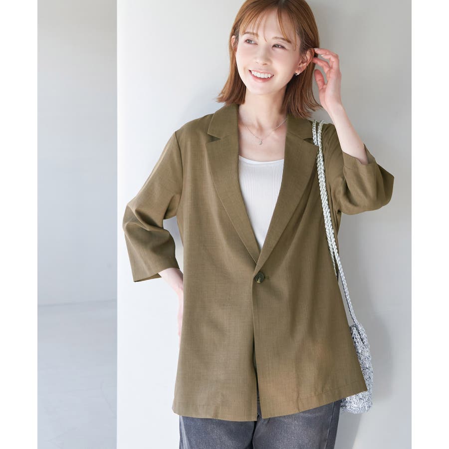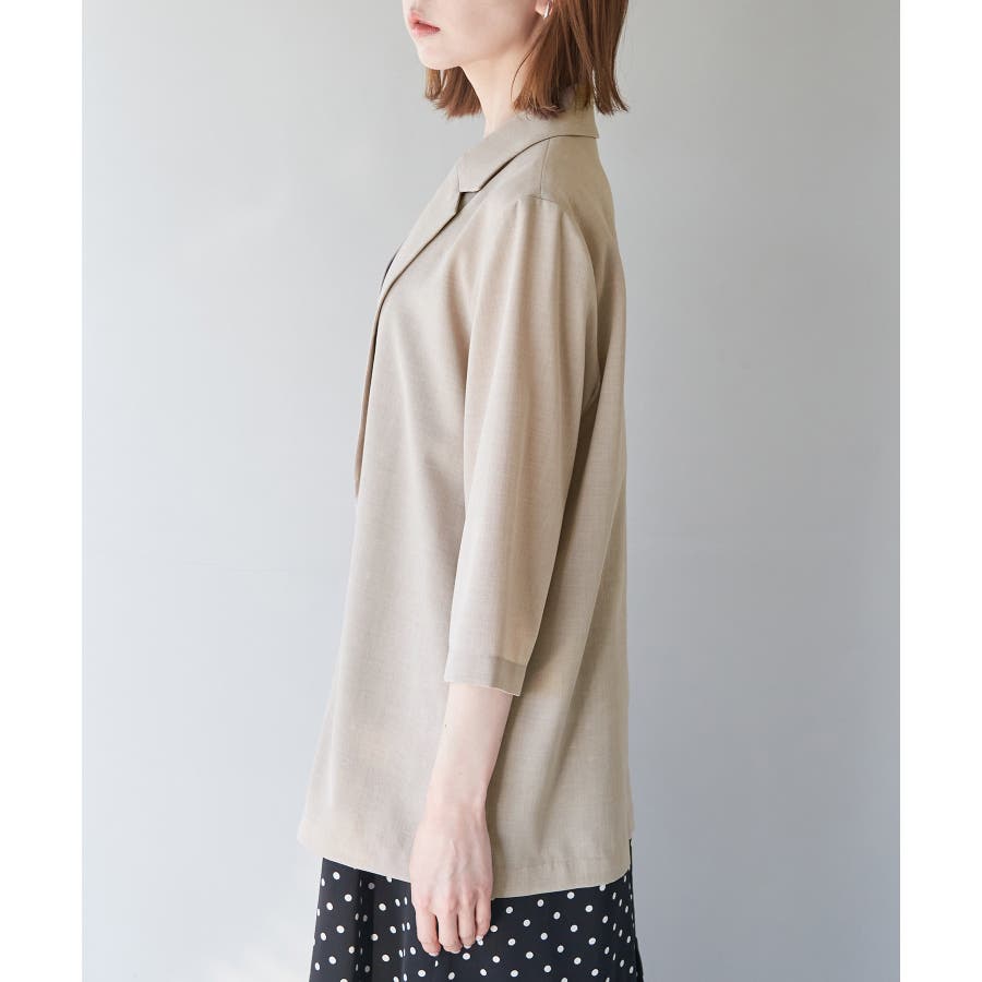 【素材感】 ・再生ポリエステルを使用した、サステナブルなアイテム。 ・清涼感のある涼しげな素材。 【デザイン・シルエット】 ・シアーで軽やかなテーラードジャケット。 ・袖先スリット入りでターンバックが可能。 ・メンズライクなゆったりフォルムで、ややカジュアルなフラットヘムを採用。 ・同素材でショート丈(品番:GDV13310)も展開。 【カラー】 ・カラーによって原産国が異なります。 チャコール(06)ベージュ(27)カーキ(36):カンボジア ターコイズ(49):中国 【スタイリングポイント】 ・夏らしいショートパンツとのスタイリングも一押し。 ・ロングワンピースにさらりと羽織って。 ・同シリーズでパンツ(品番:GDS13300)、スカート(品番:GDC13300)も展開しているので、セットアップスタイルもおすすめ。 ----------------------------- 裏地:なし 透け感:光に当てるとややあり 伸縮性:なし 生地感・厚さ:薄手 ポケット:なし 季節:春・夏 ----------------------------- ※撮影時の光、お使いのモニター環境によって色の見え方が違う場合がございます。 ※前回好評だった(品番:GDV12300)よりも袖口を短く、すっきりとした印象に。ボタンの色も変更しています。 ※重量は、サンプルの38サイズでの計測になります。 ※モデル身長:165cm 着用サイズ:38